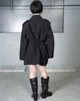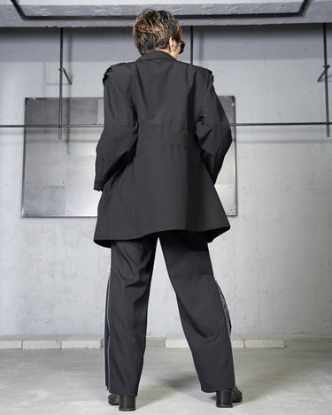 後ろ身頃には腕や肩の動きをより自由にするためのアクションプリーツを入れ、着用時に動きやすさを向上させると共に、生地が引っ張られにくくなることで美しいシルエットを崩れにくくさせている。