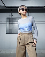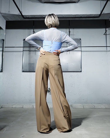 ・フロントのギャザーで表情のある質感を出しており、スタイリングにアクセントをしっかりと加えます。
