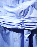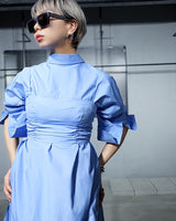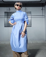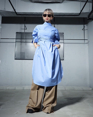 ・共生地の「Broad over size long shirt dress」をレイヤードすることで、クリーンでありながらも優美な雰囲気でスタイリングしていただけます。
