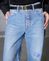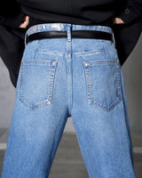 ・ウエストバンドを目立たないようにして、裾はトラウザーのようにシングルで仕上げることでデニムパンツのカジュアルさを和らげています。