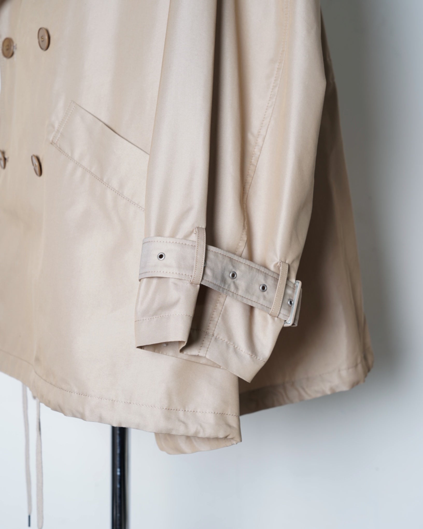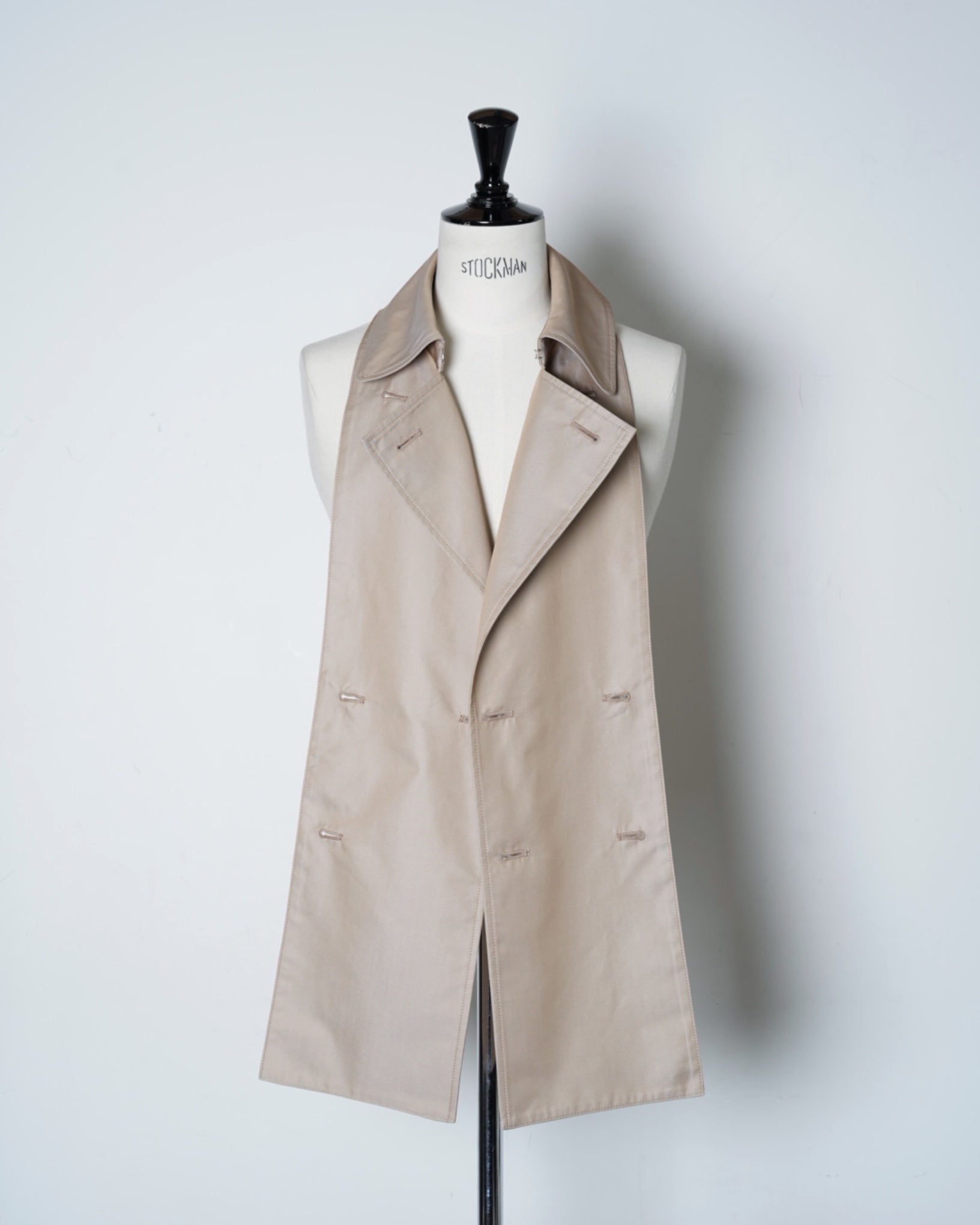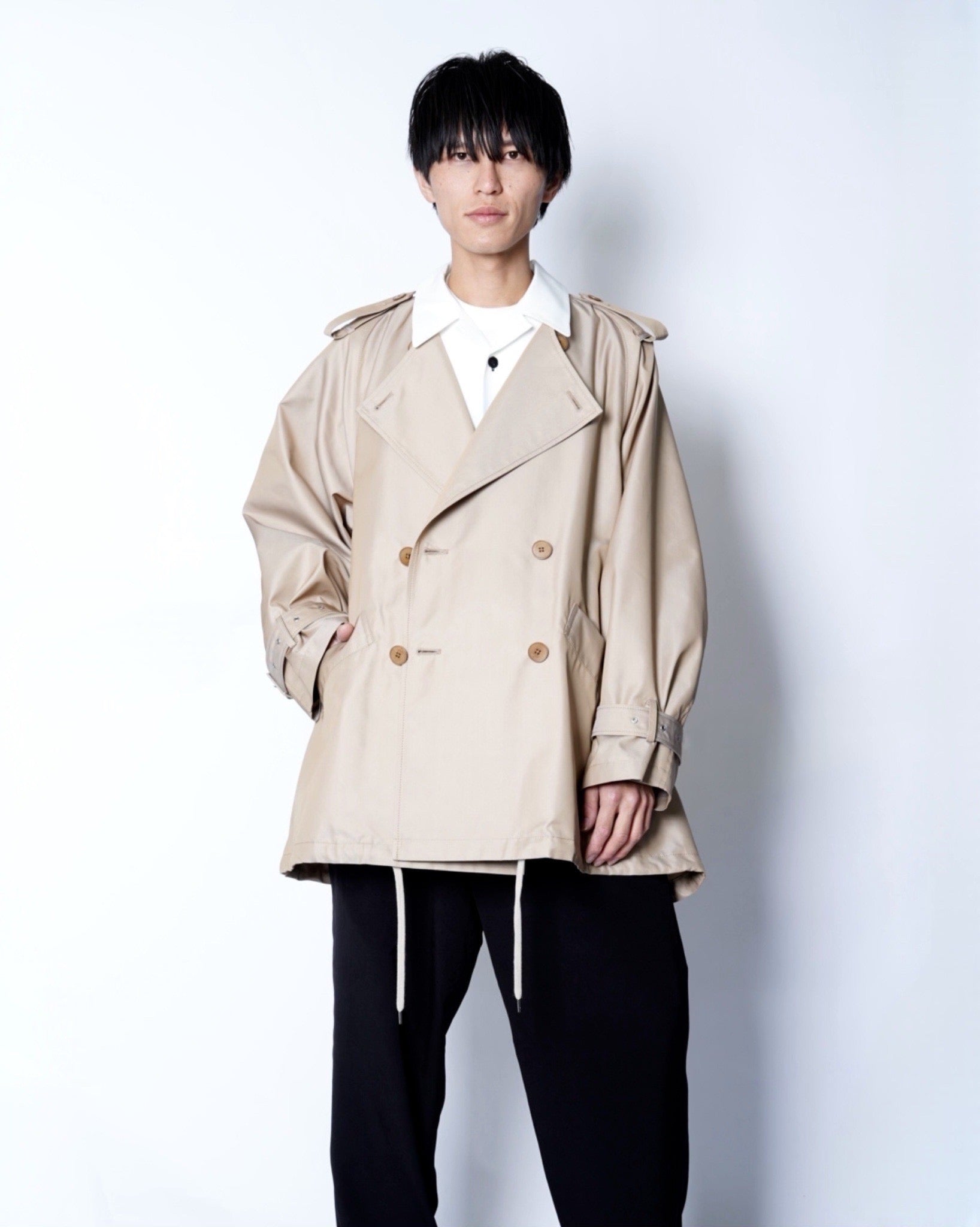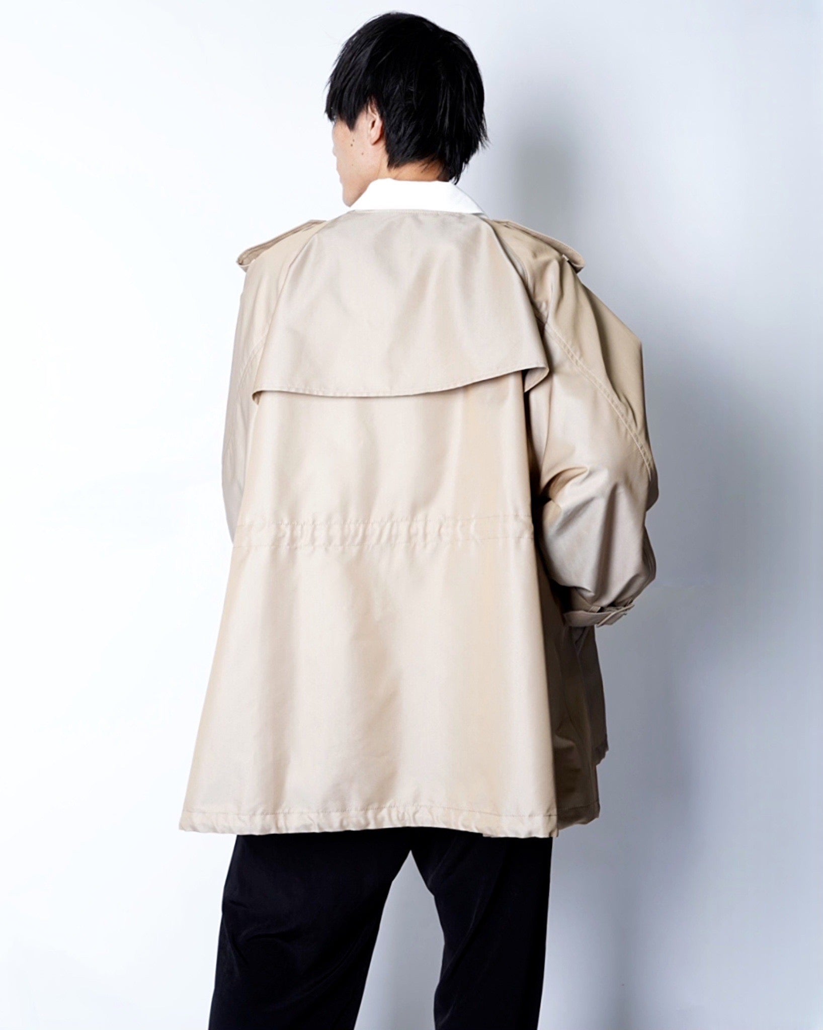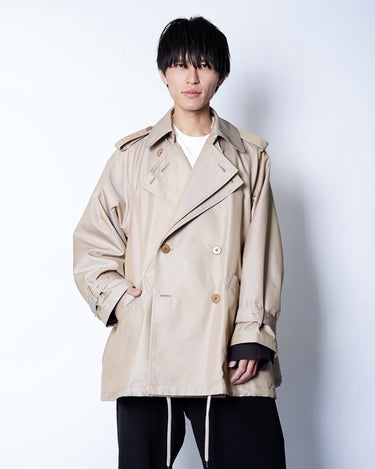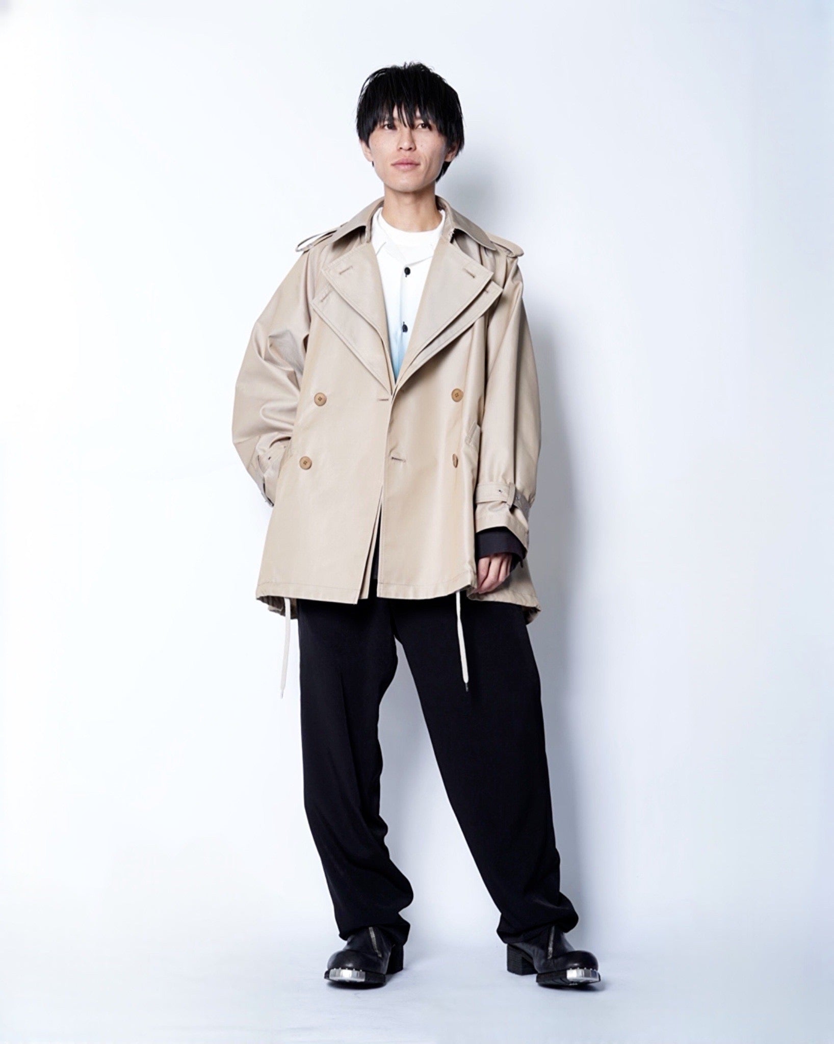 ・衿とフロントが二重構造になったレイヤードデザインで、取り外し可能なパーツによりノーカラーコートとしても着用可能。シーンやスタイリングに応じた表情の変化を楽しめます。