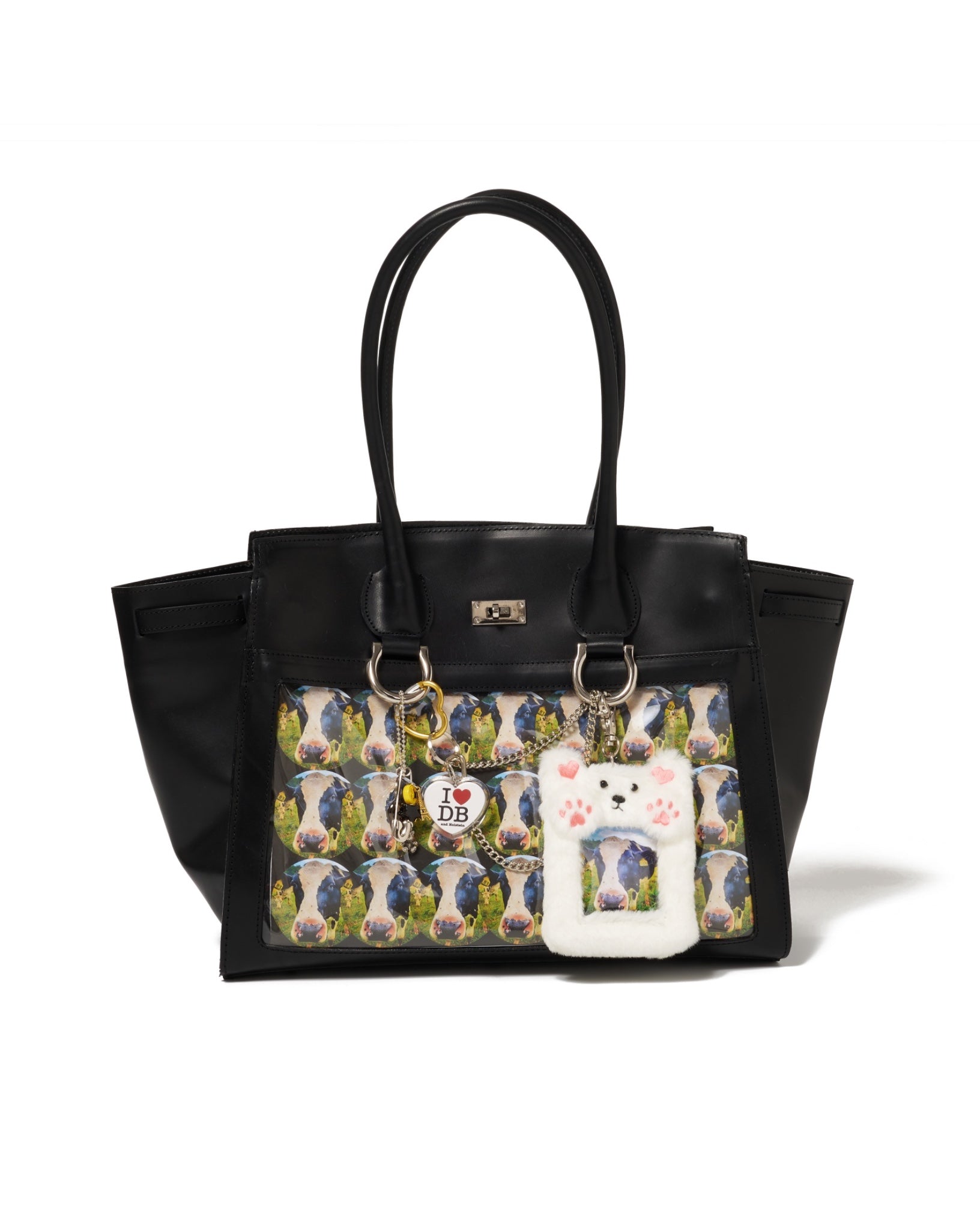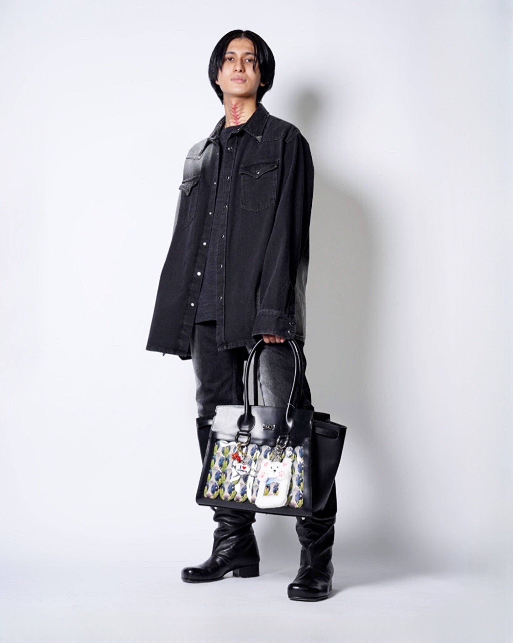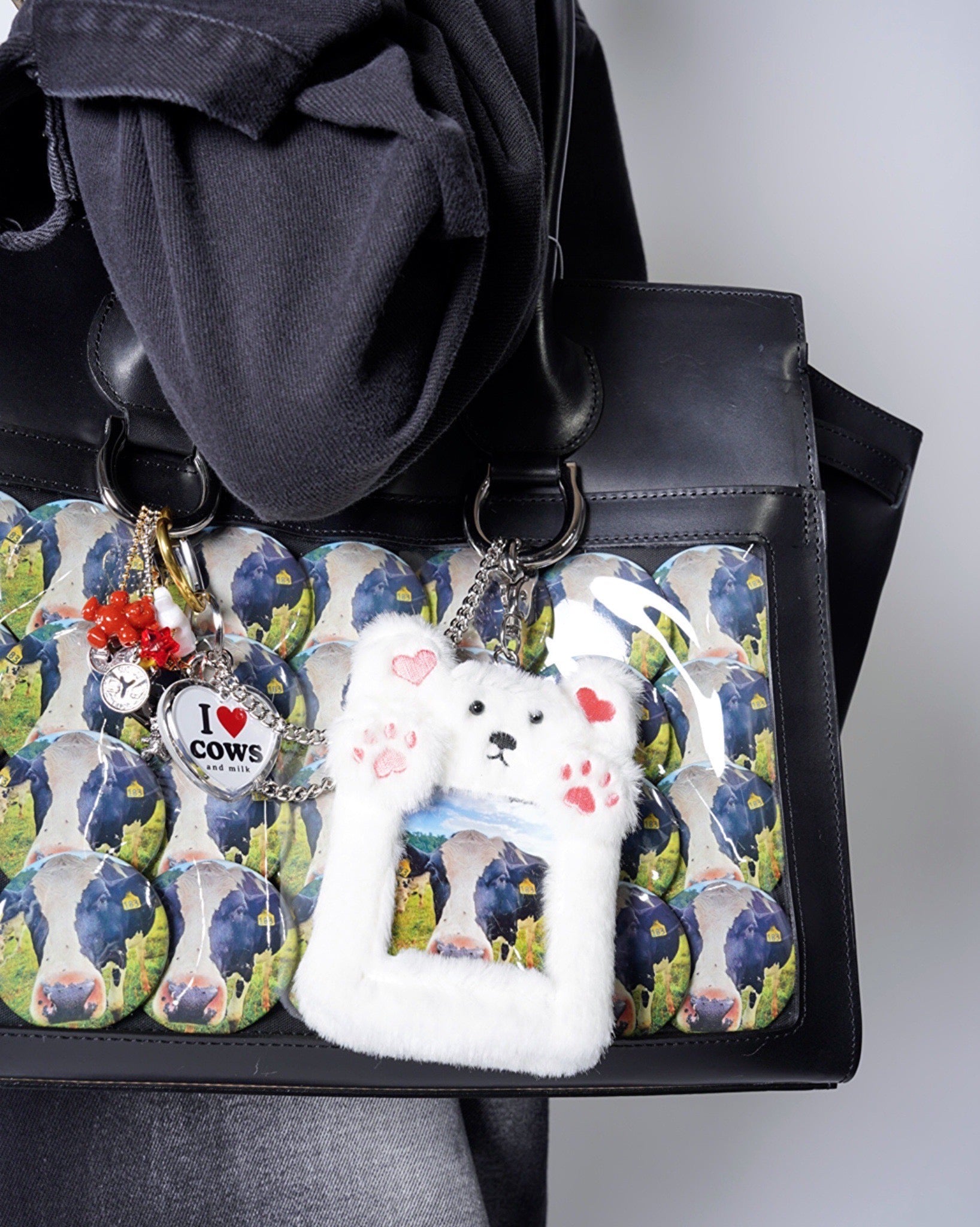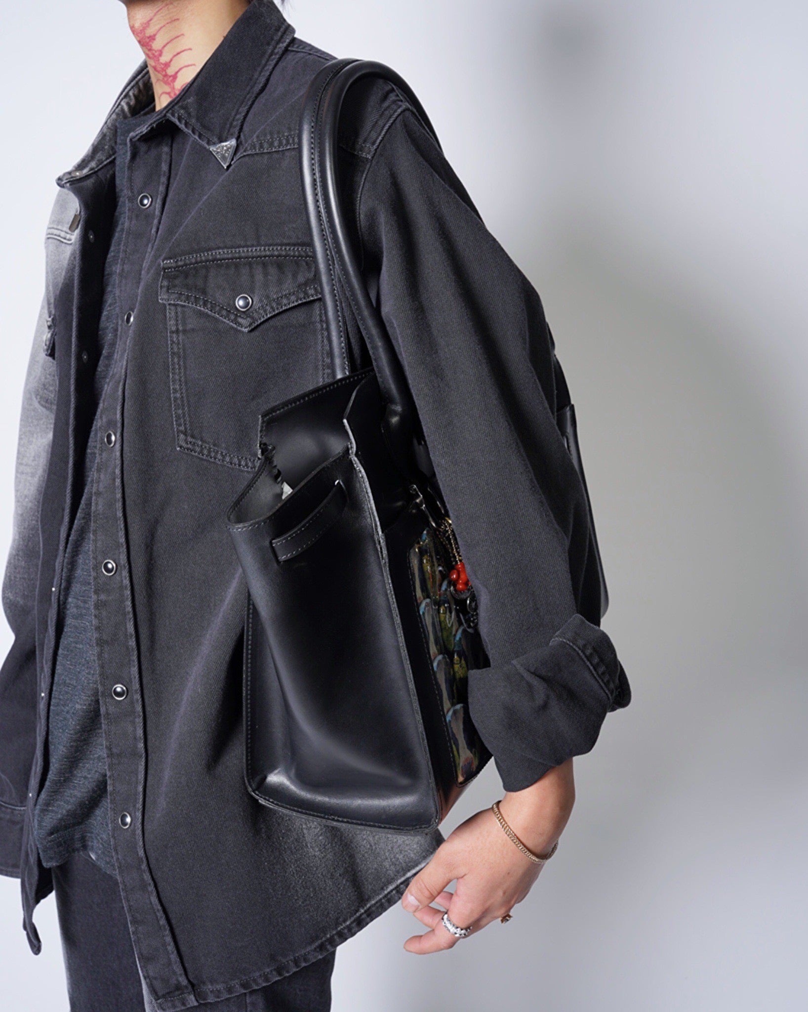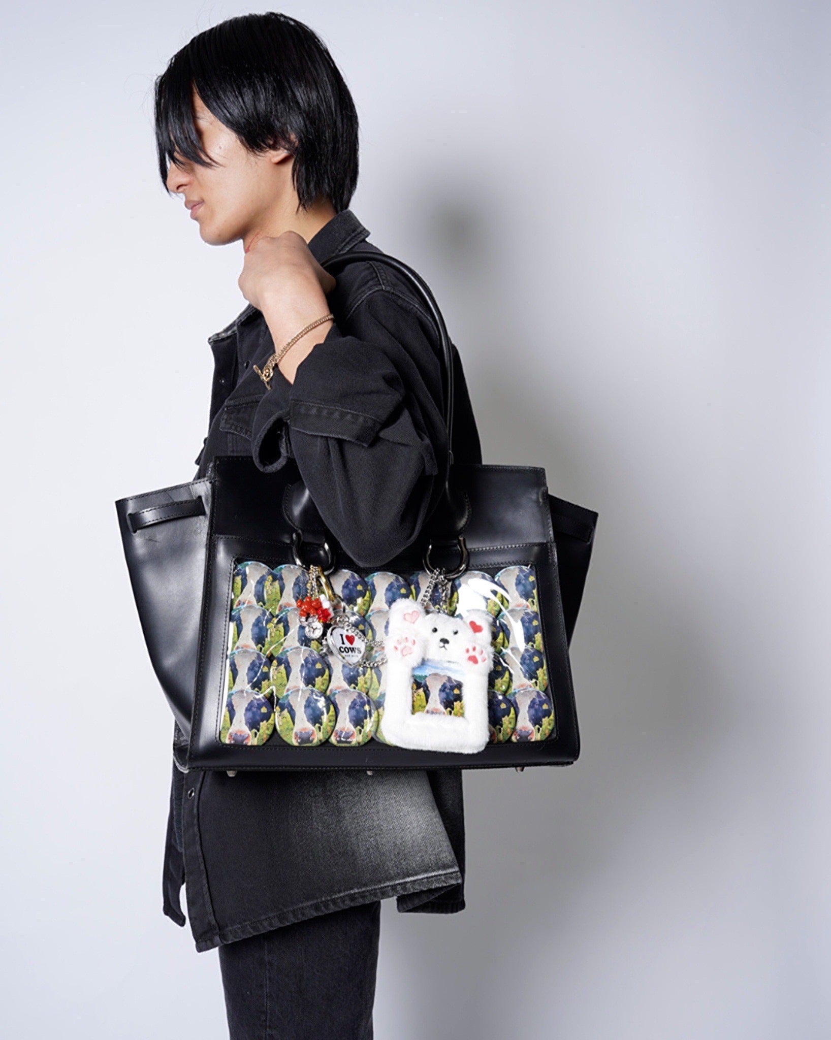 ・好きなアイドルやキャラクターのキーホルダーや缶バッジをたくさん飾り付けた「痛い」バッグ、通称“痛バッグ”をモチーフにしているレザーバッグ。