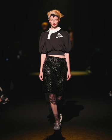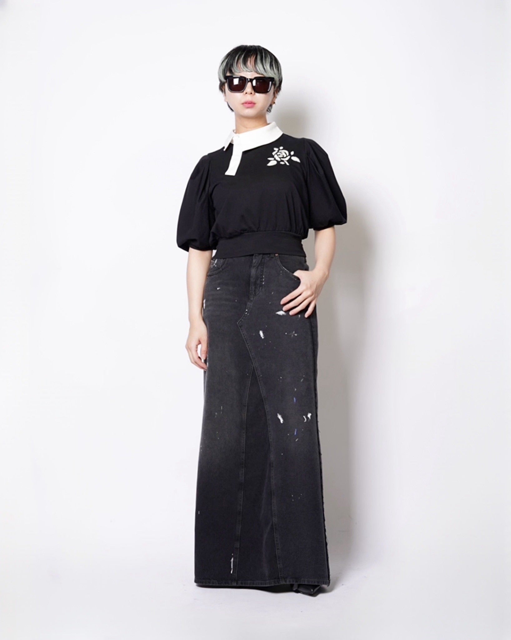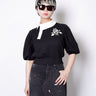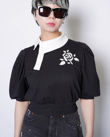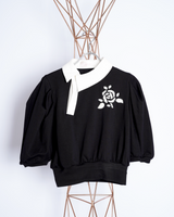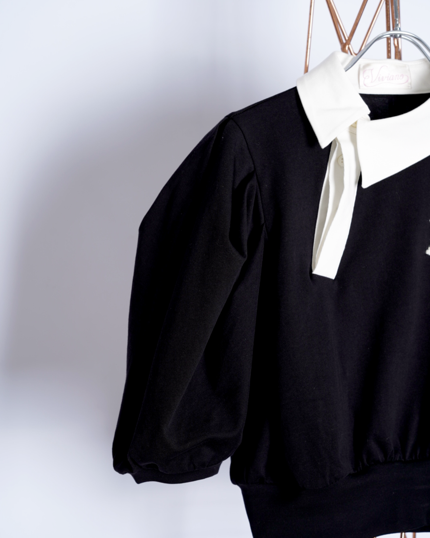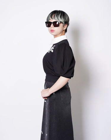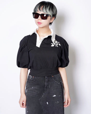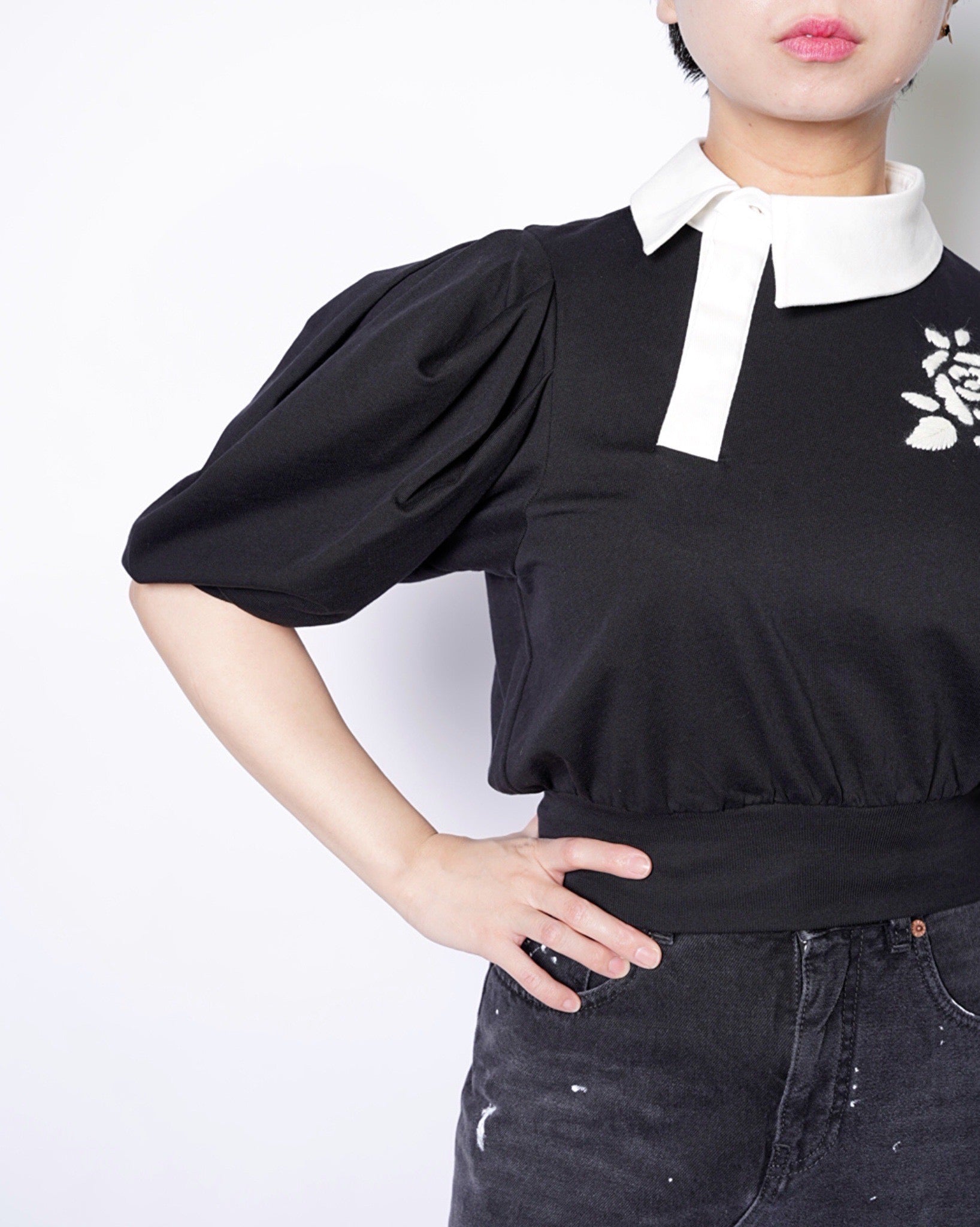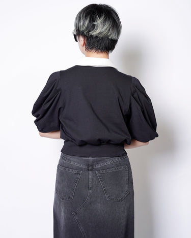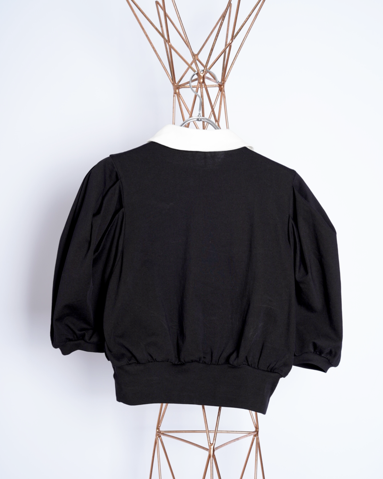 ・コンパクトな丈感に対して、ギャザーの入ったボリューミーな袖により、メリハリの効いたフォルムを作ると共に優美さを演出。