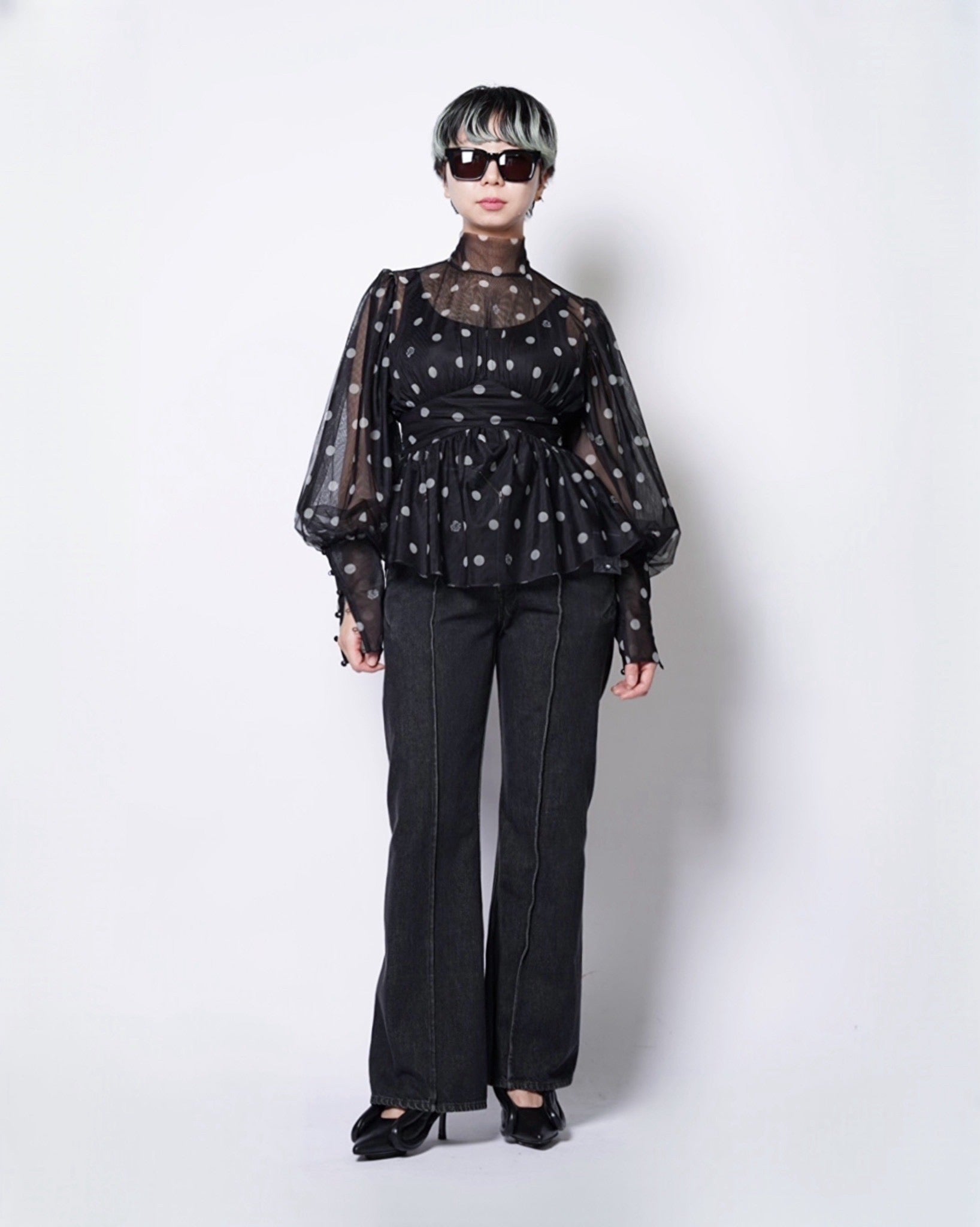 ・シアーな生地を使用したシックでエレガントなブラウス。