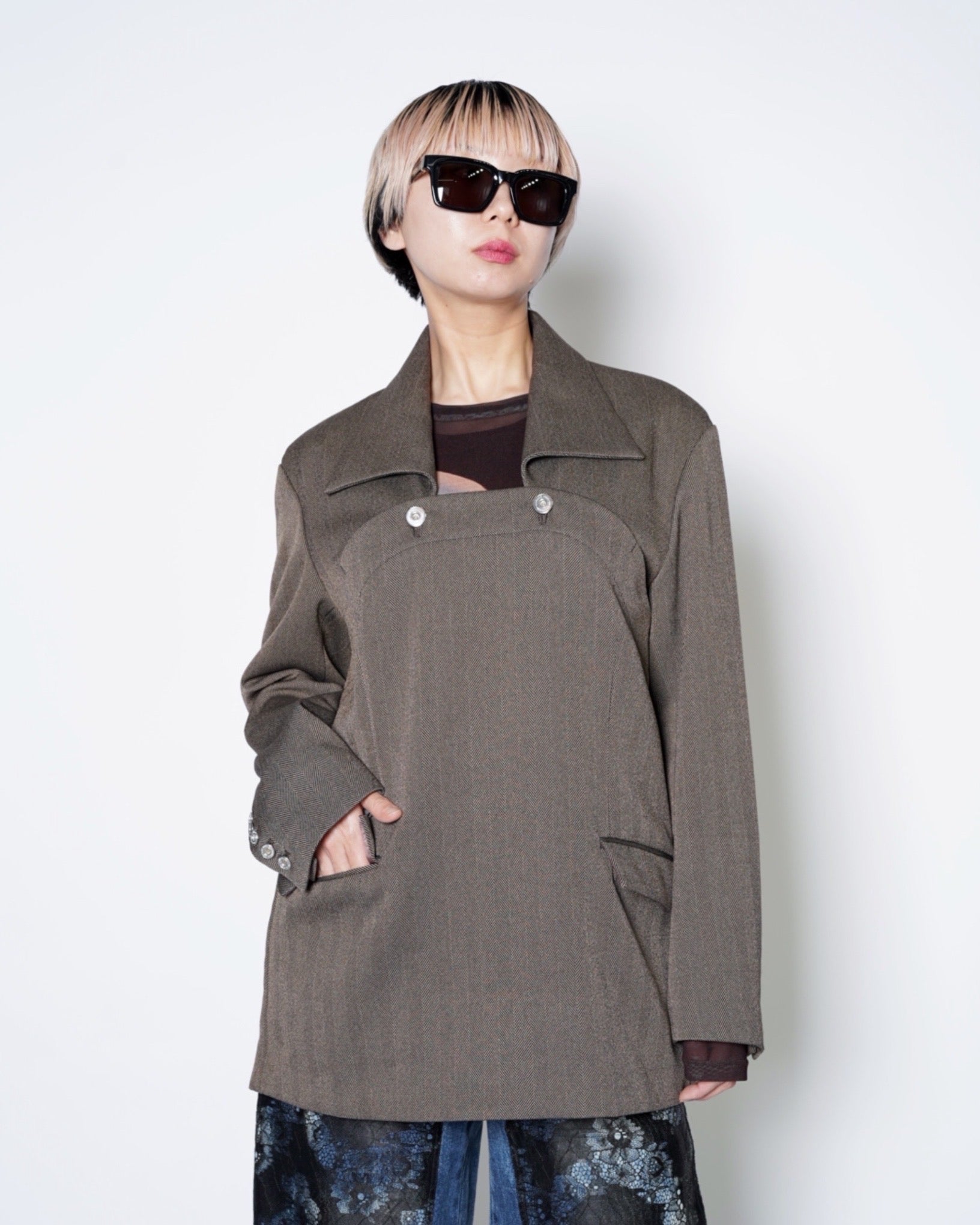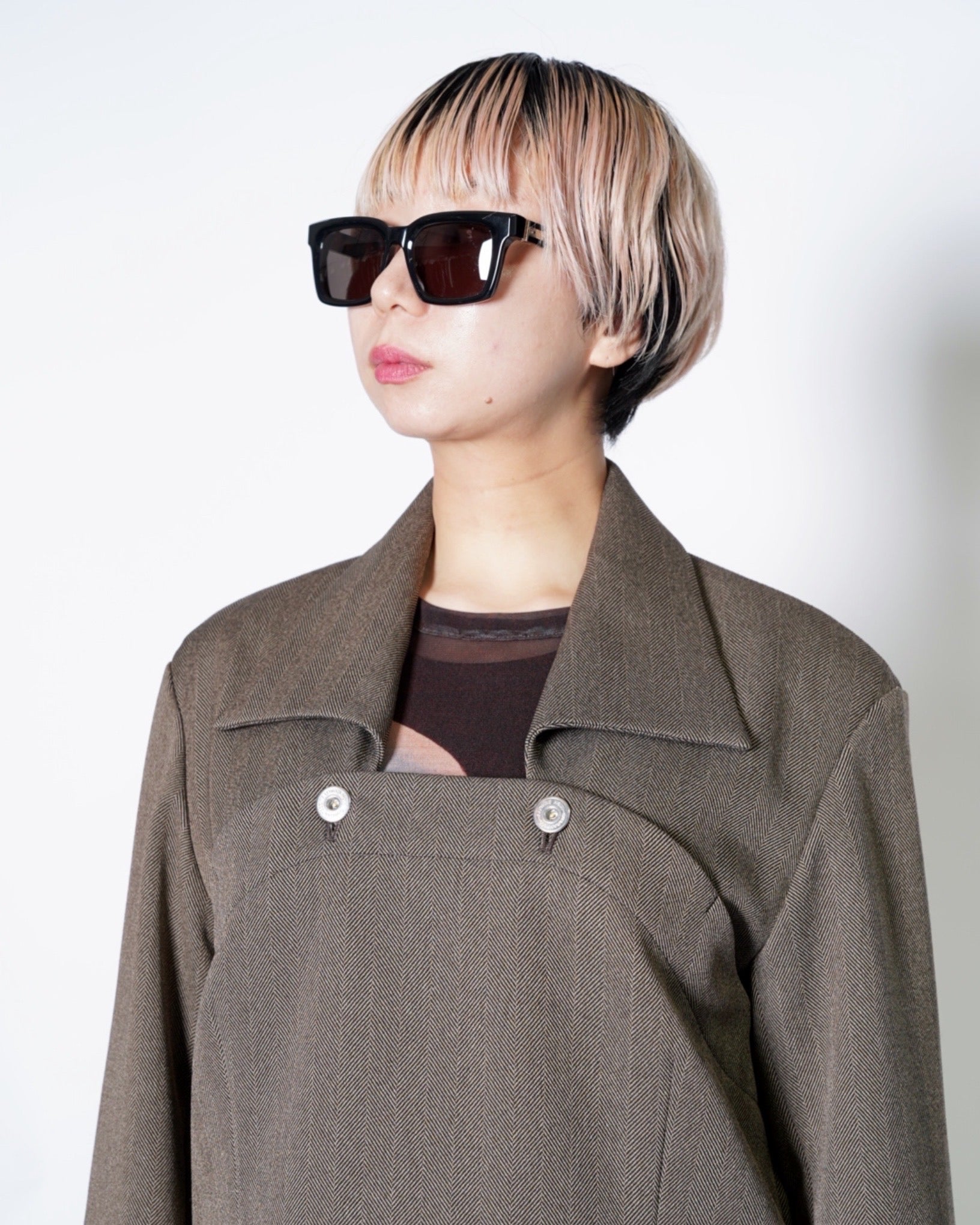 ・フロントを覆うワークウェアを彷彿とさせるデザインが特徴的で、ヘリンボーンの質感も相まって無骨で凛とした佇まいを作り上げています。