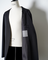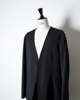 ・ノーカラーでボタンレスのミニマルなデザインが特徴となっており、シックで洗練された佇まいのジャケットに。