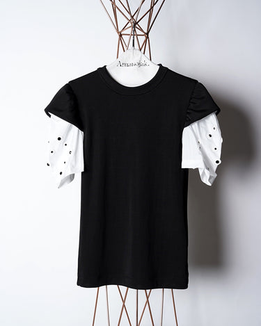 ・袖の布帛には花のモチーフのストーンを配してアクセントに。