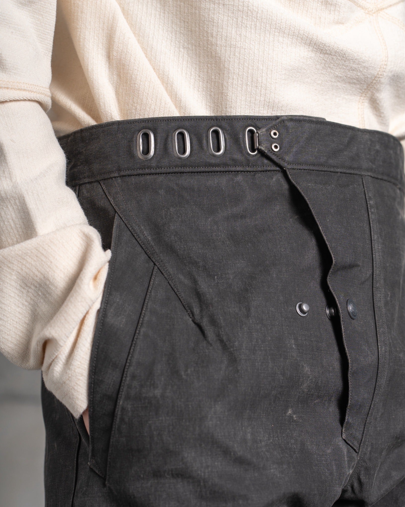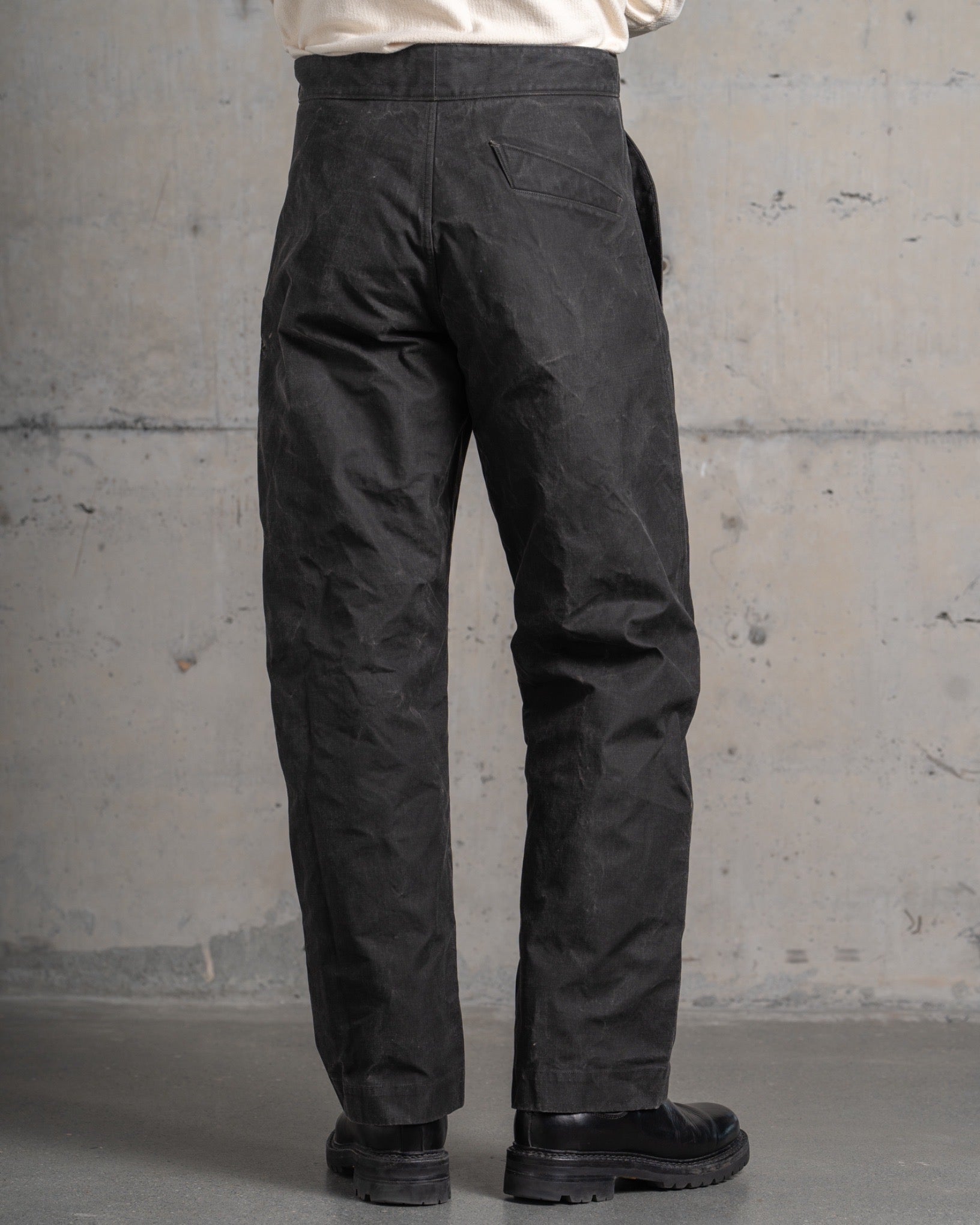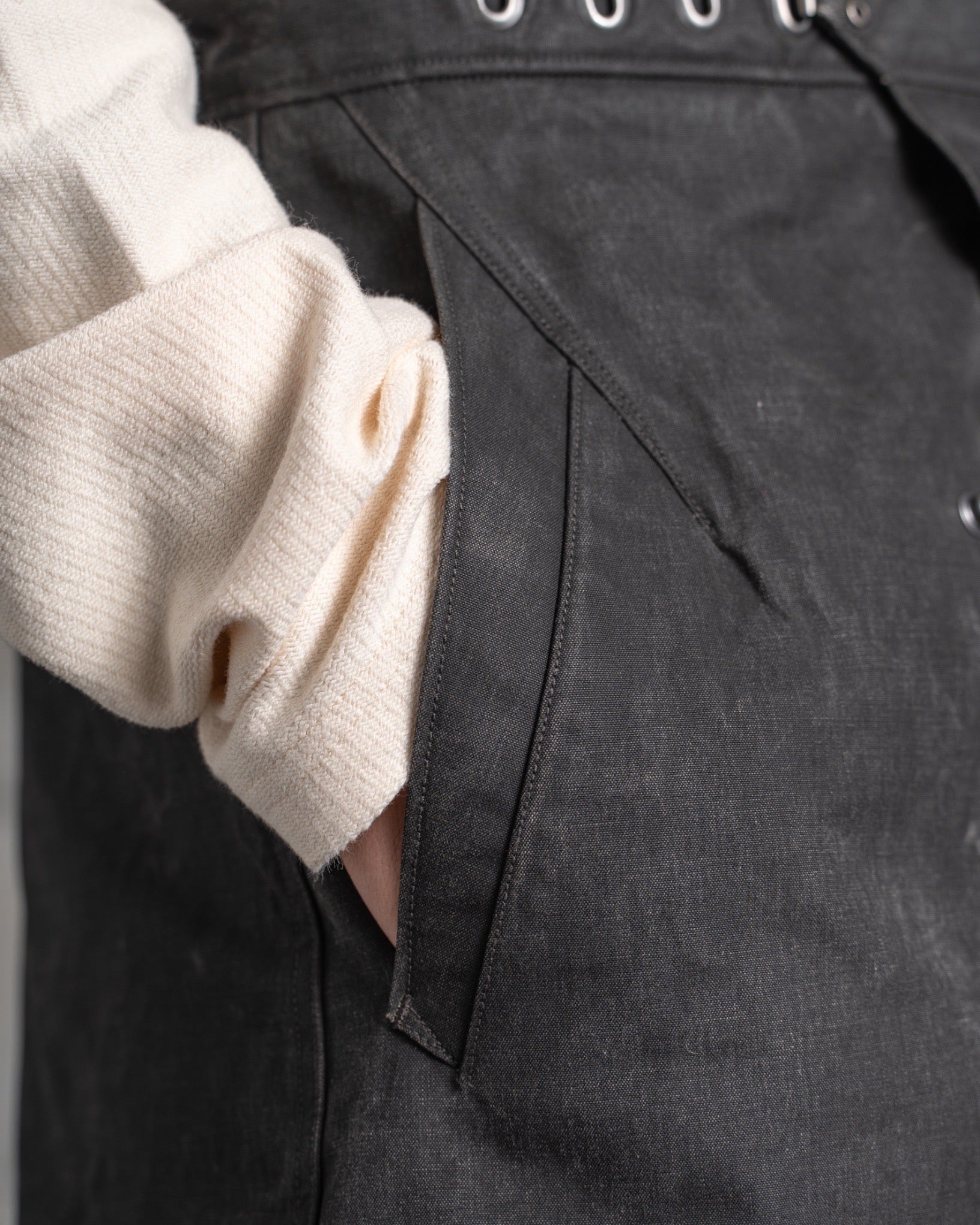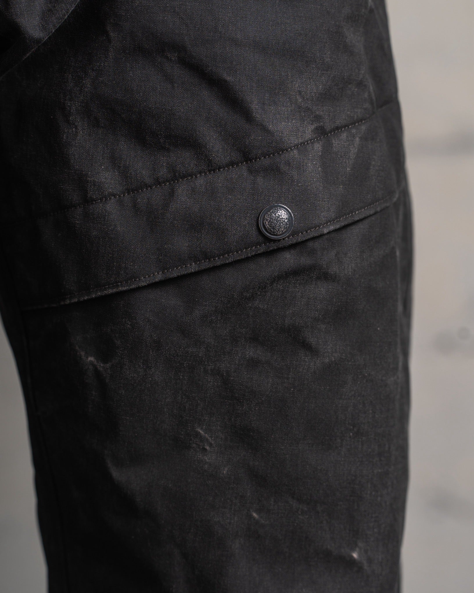 ・穿くほどに味わいを増していくことと撥水性が魅力ながらも、ワックス加工の生地にありがちなべたつきや特有の匂いを一切感じさせません。