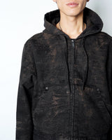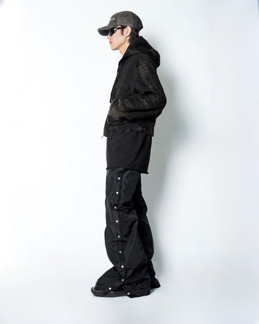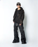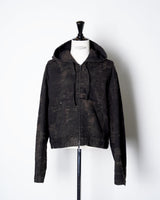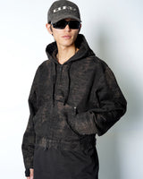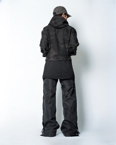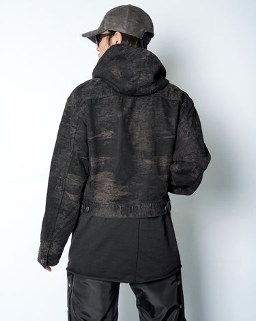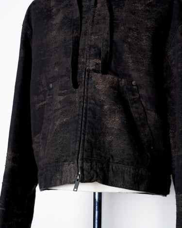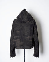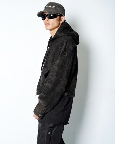 ・ショート丈のブルゾン型にフードを合わせ、実用性と構築的なシルエットを両立。
