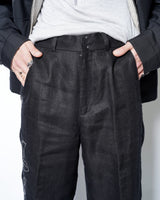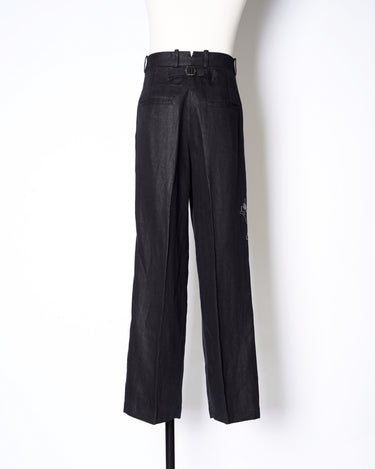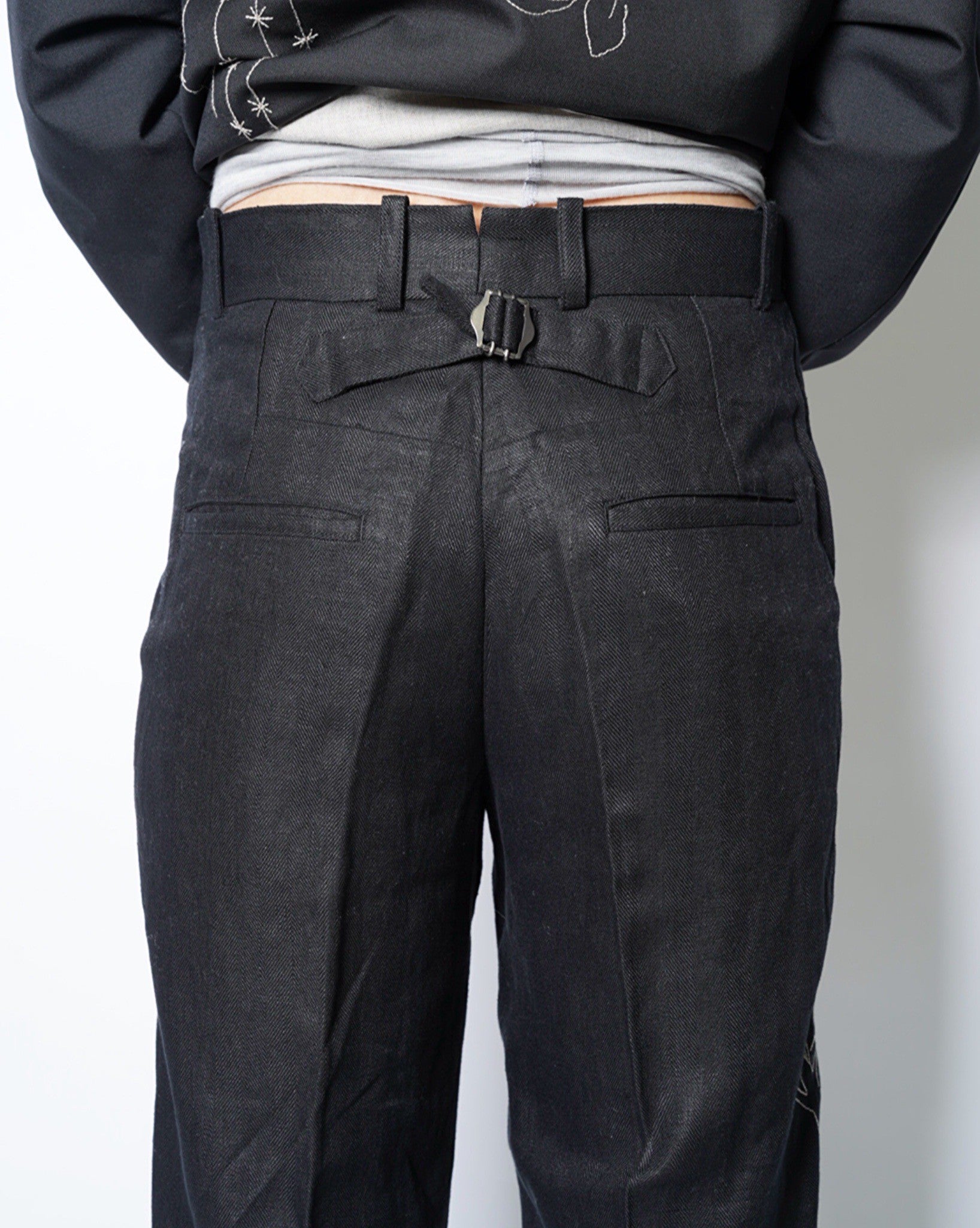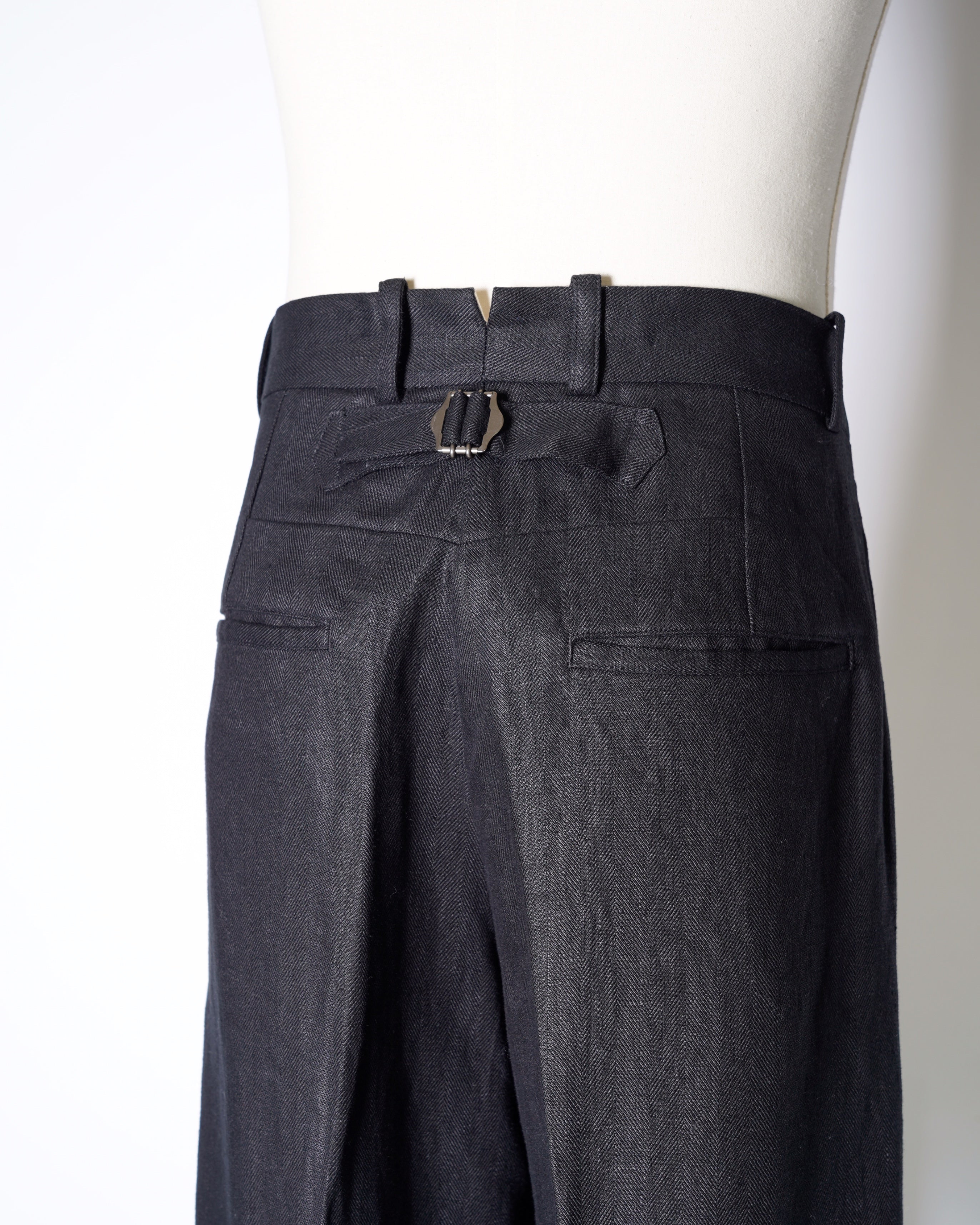 ・尾錠付きのクラシカルなトラウザーながら、洗練されたシルエットと生地感でモダンな仕上がりに。