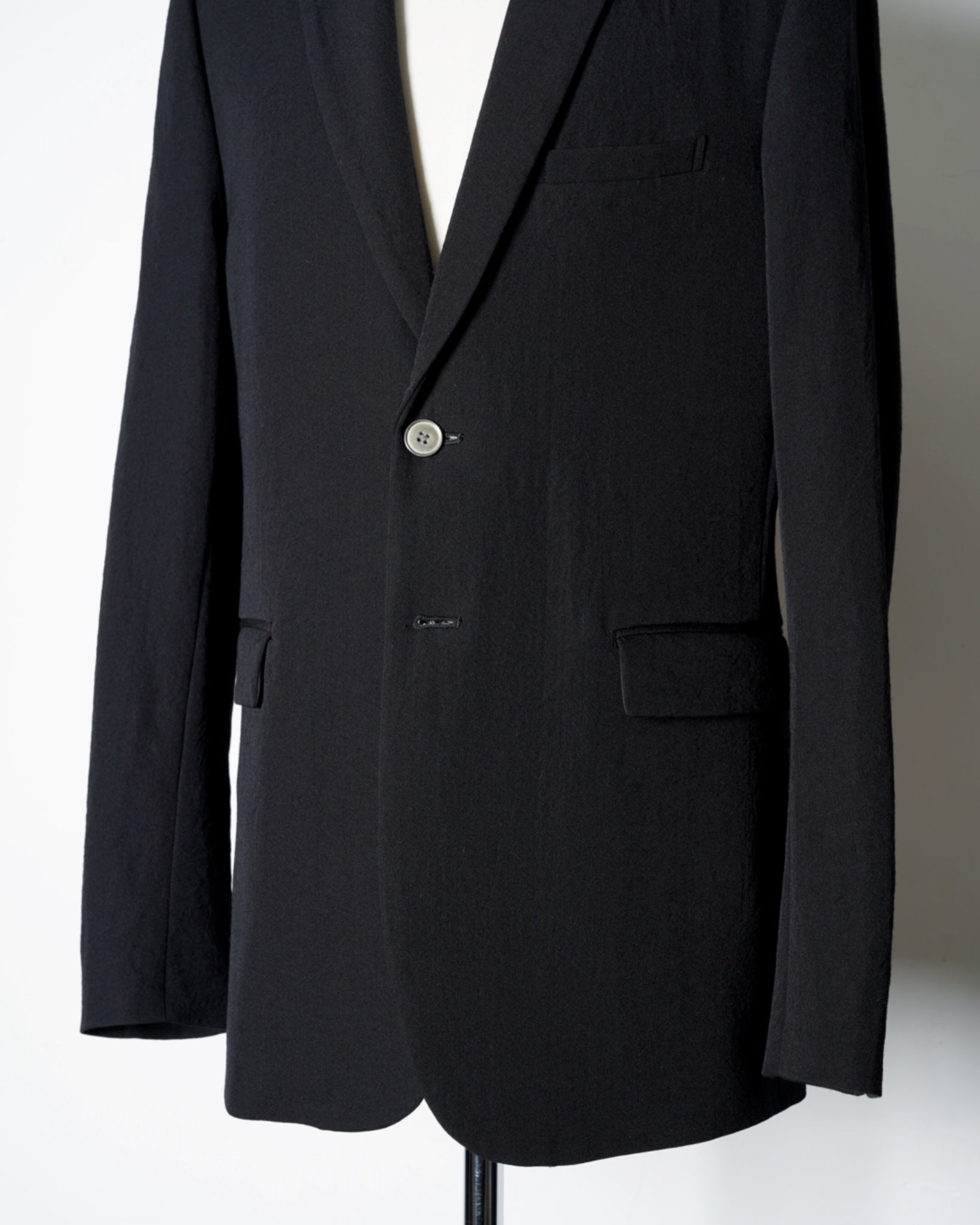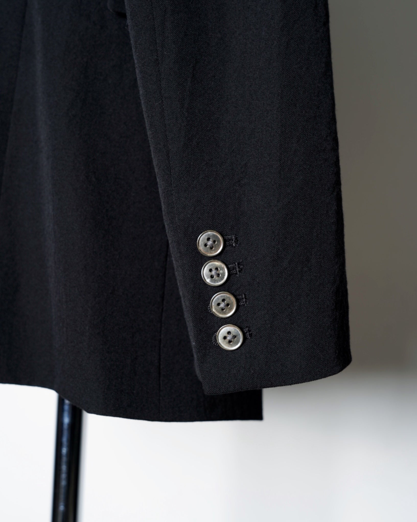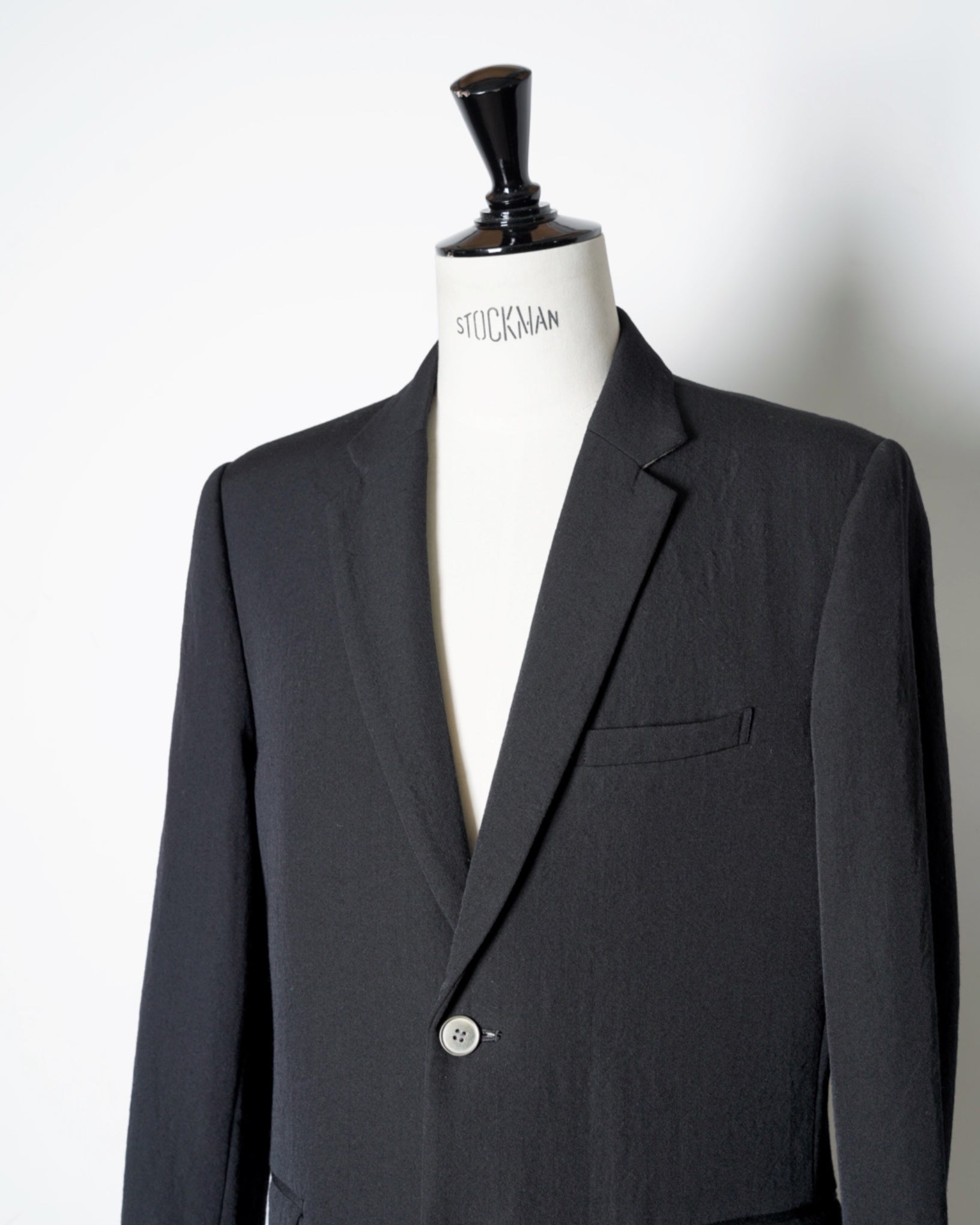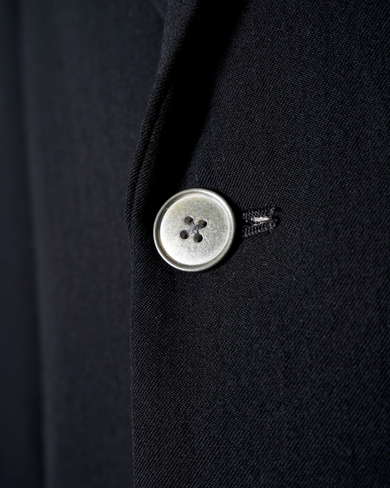 ・シングルで縦長のフォルムながらも、程よくしっかりとした肩のラインと重心低めのラペルとVゾーンでスタイリッシュになり過ぎない懐の深い仕上がりに。