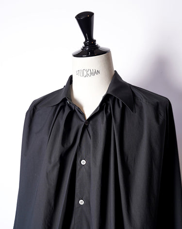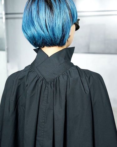 ・襟の背面を脱構築的に畳むように留めていることで放射状のギャザーがもたらされて、優美な広がりのあるシルエットとなっています。