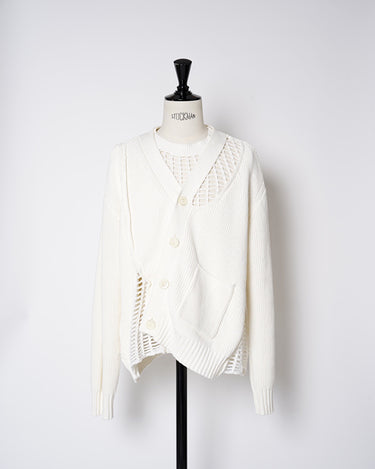 ・メッシュ状のクルーネックの上に畔編みのカーディガンを羽織ったようにドッキングした、FCWらしいインパクトのある再構築デザイン。