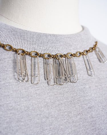 ・ネックのアクセントには本物のゼムクリップを使用しており、事務用品と服というかけ離れた要素の掛け合わせによって非常にユニークなデザインとなっています。