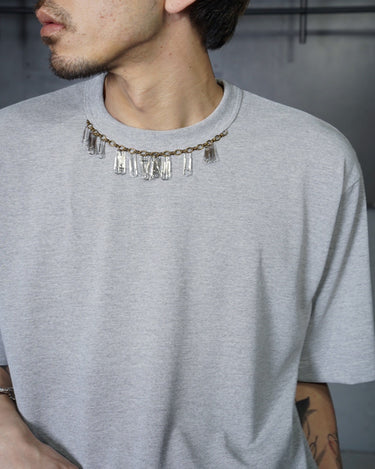 ・ネック周りにチェーンとクリップを取り付けて、ネックレスをかけているかのようなアクセントの光るデザイン。