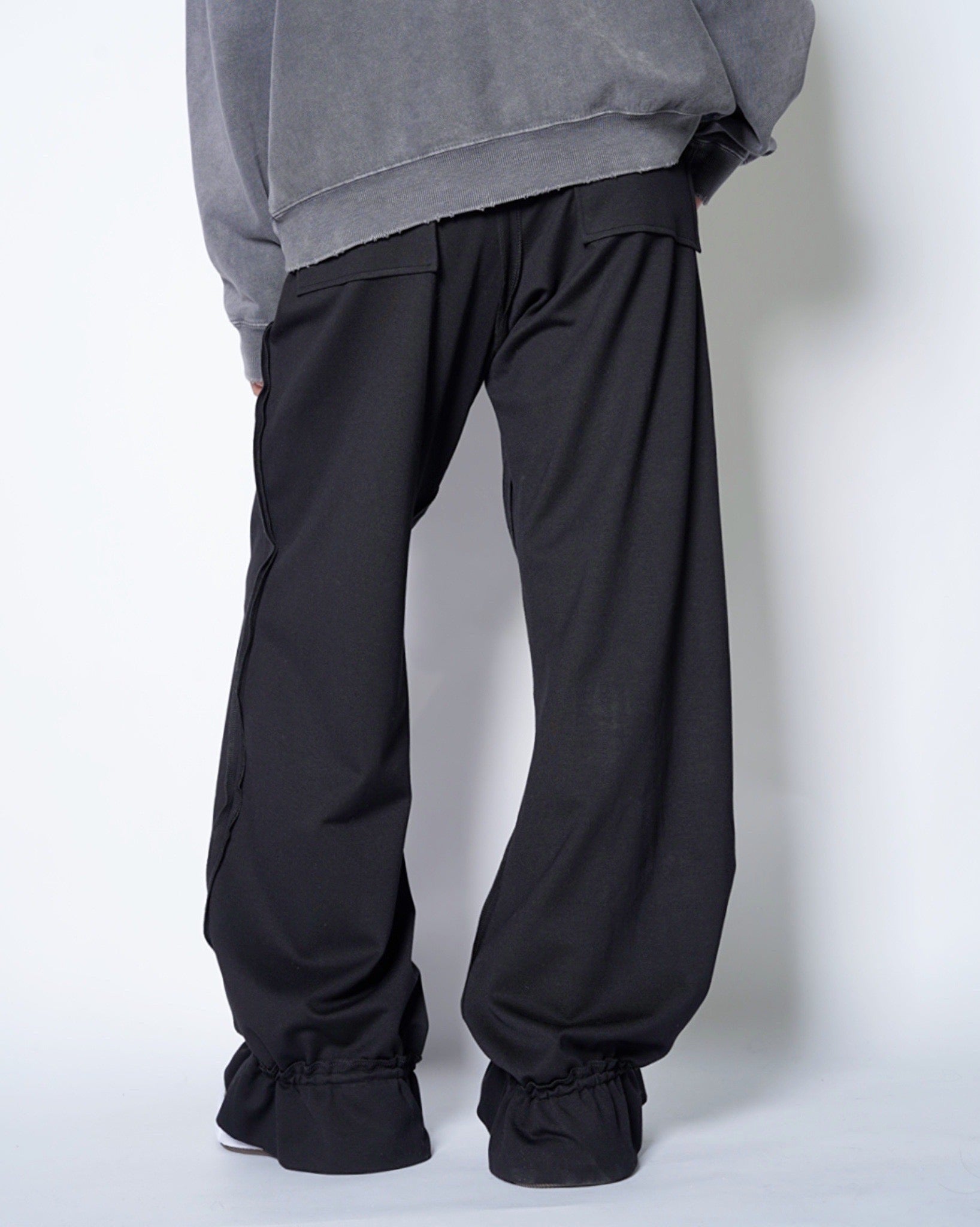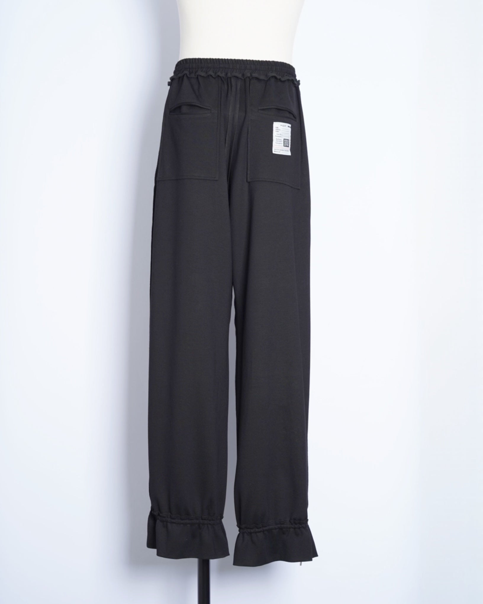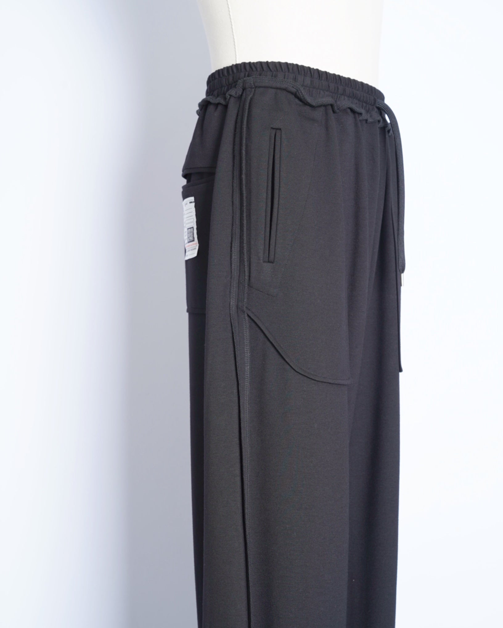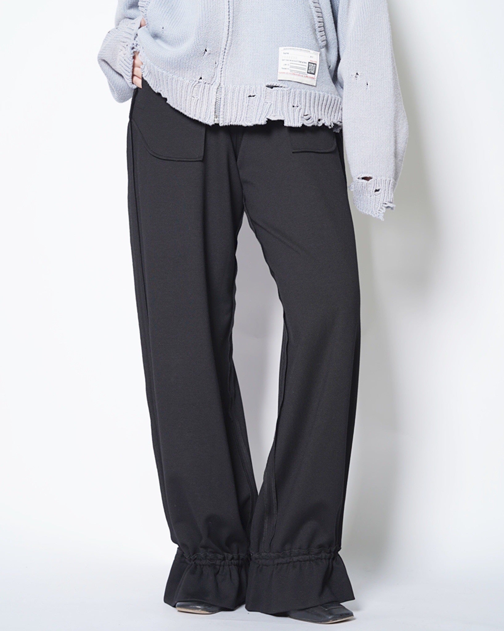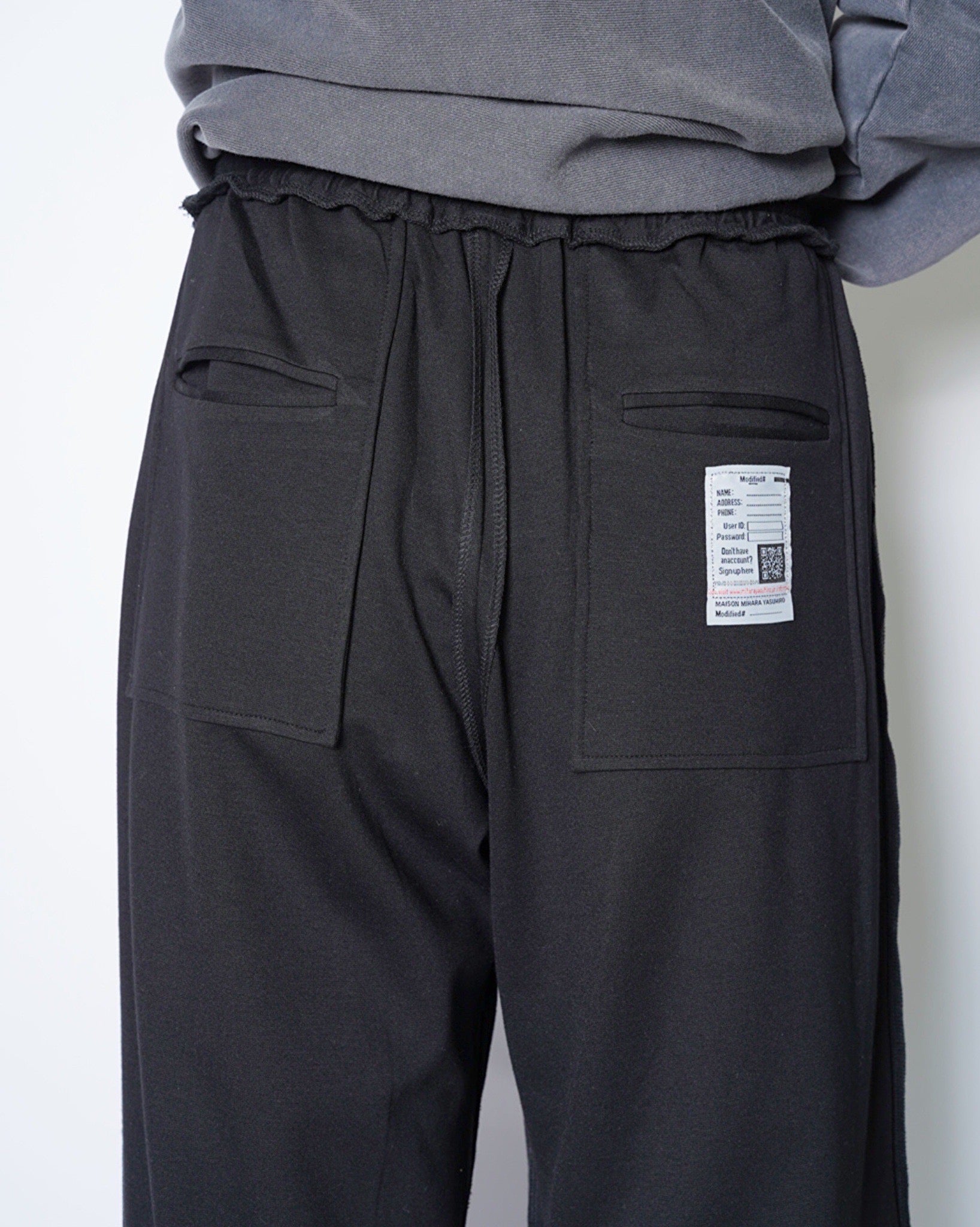 ・ジャージーパンツをインサイドアウトにした、ミハラヤスヒロらしい大胆でユニークなデザイン。