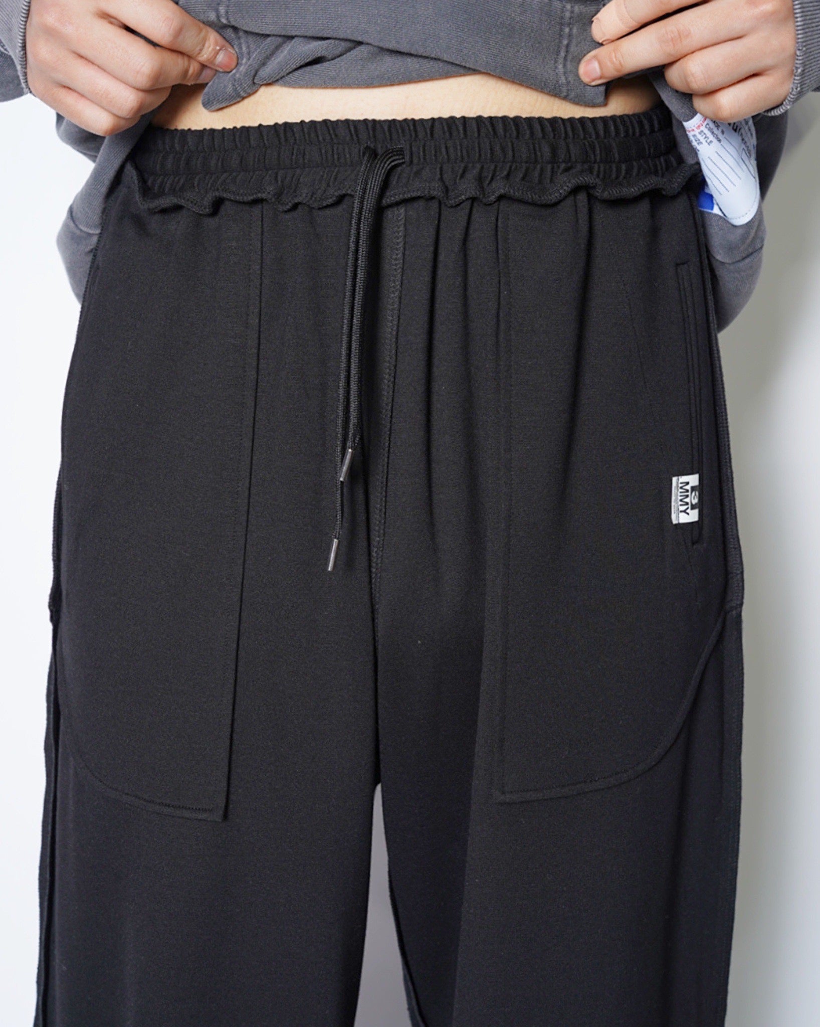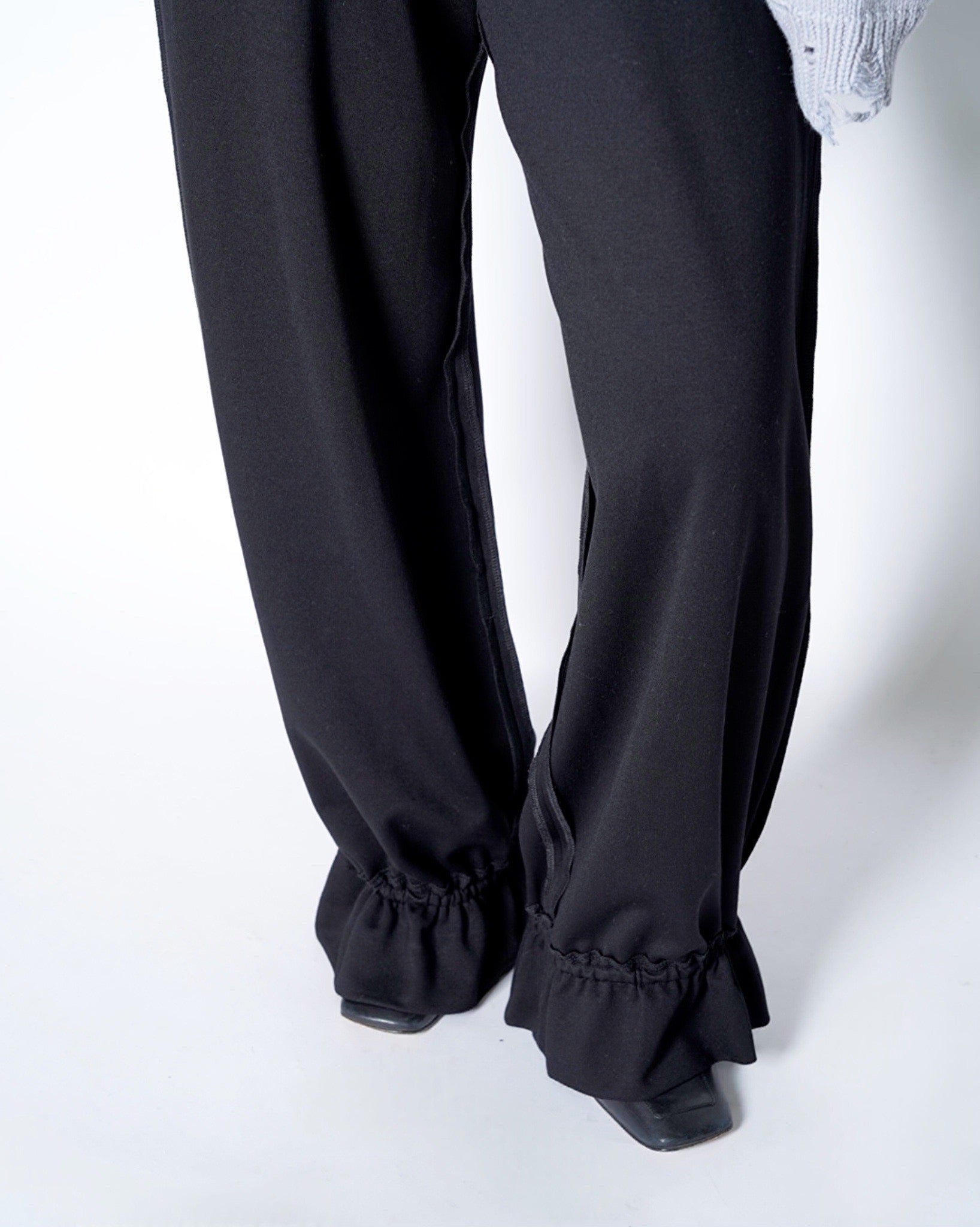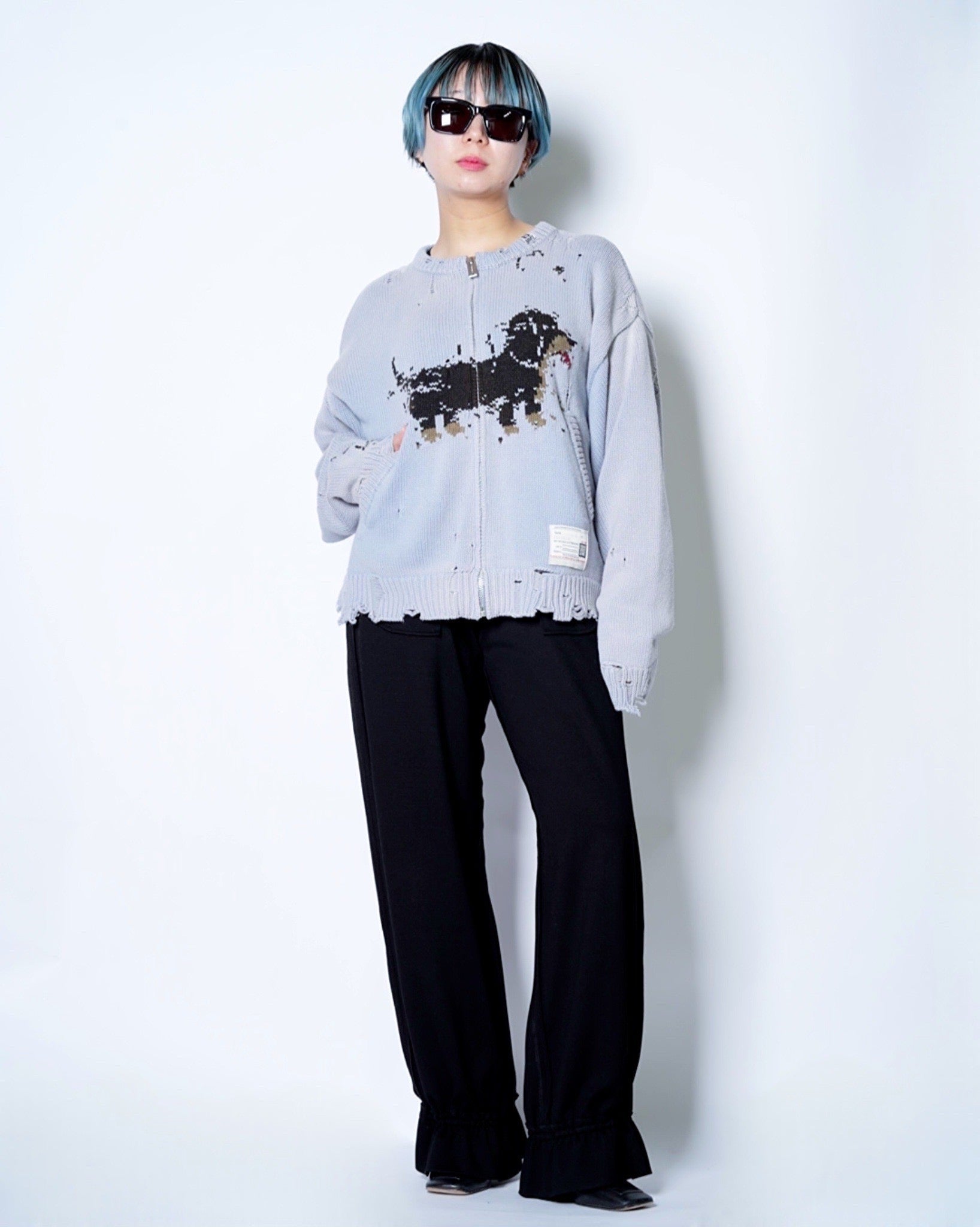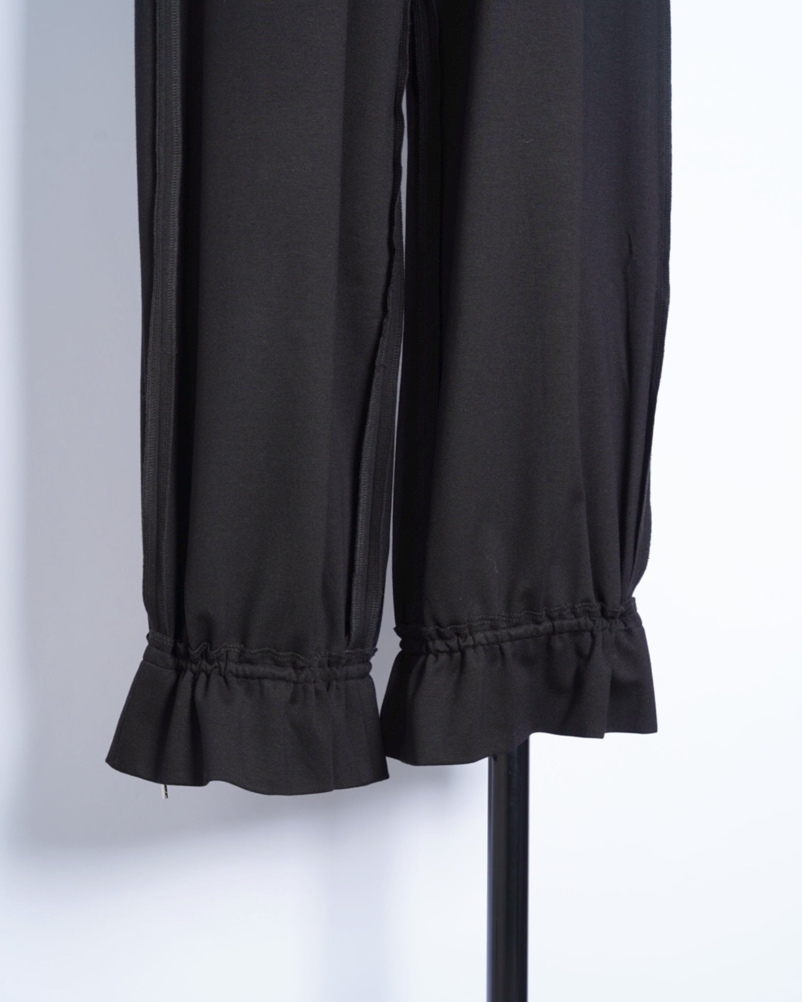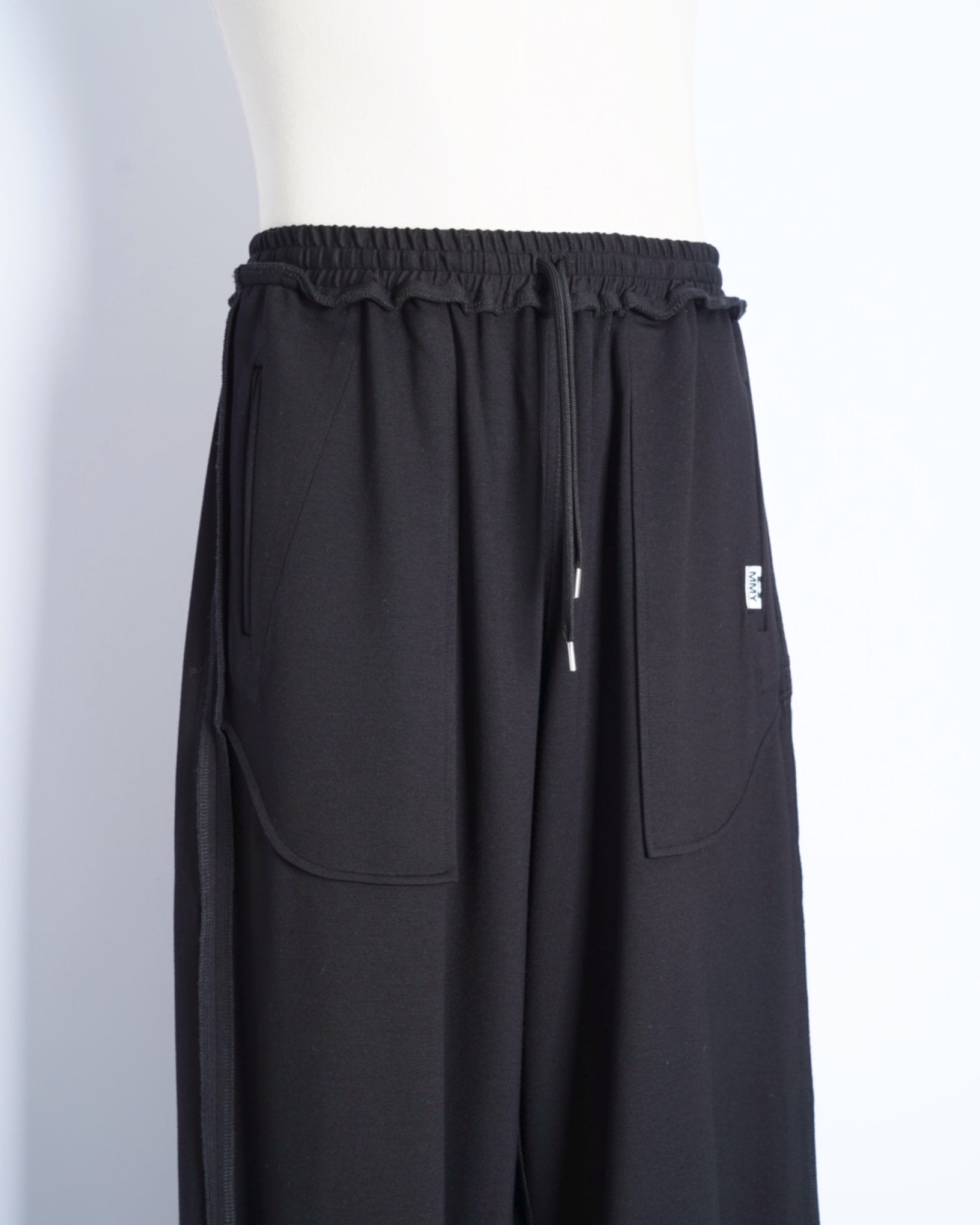・ジャージーパンツをインサイドアウトにした、ミハラヤスヒロらしい大胆でユニークなデザイン。