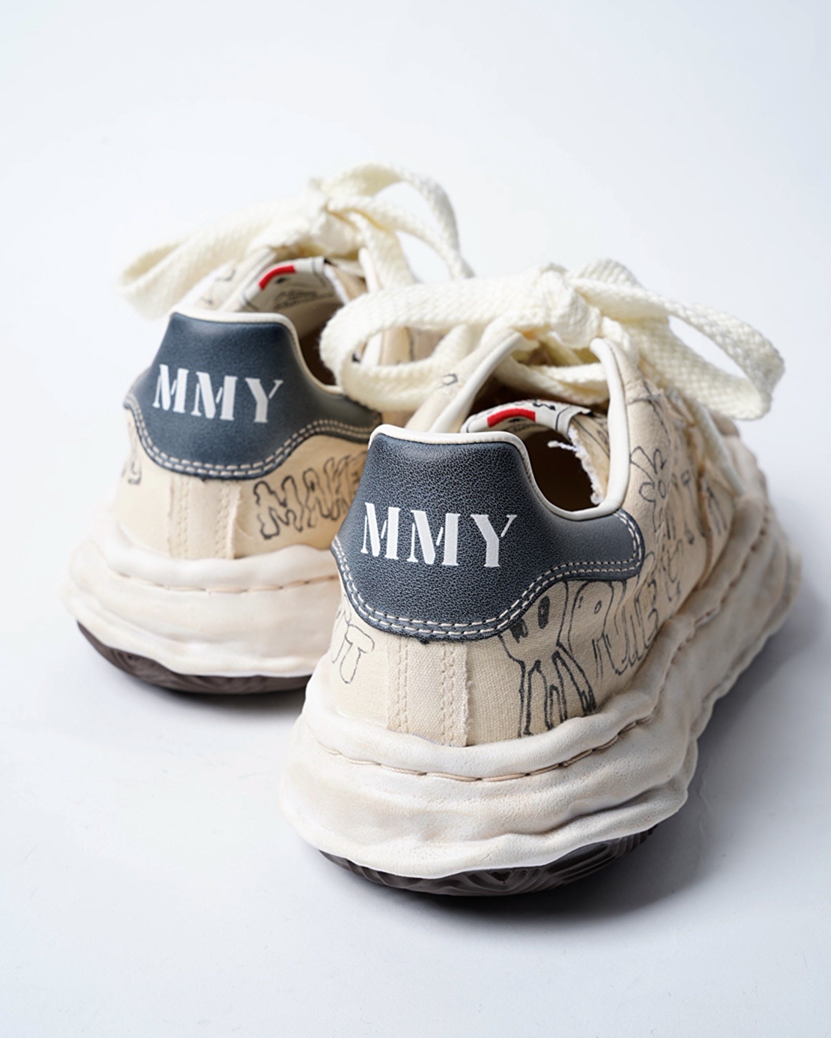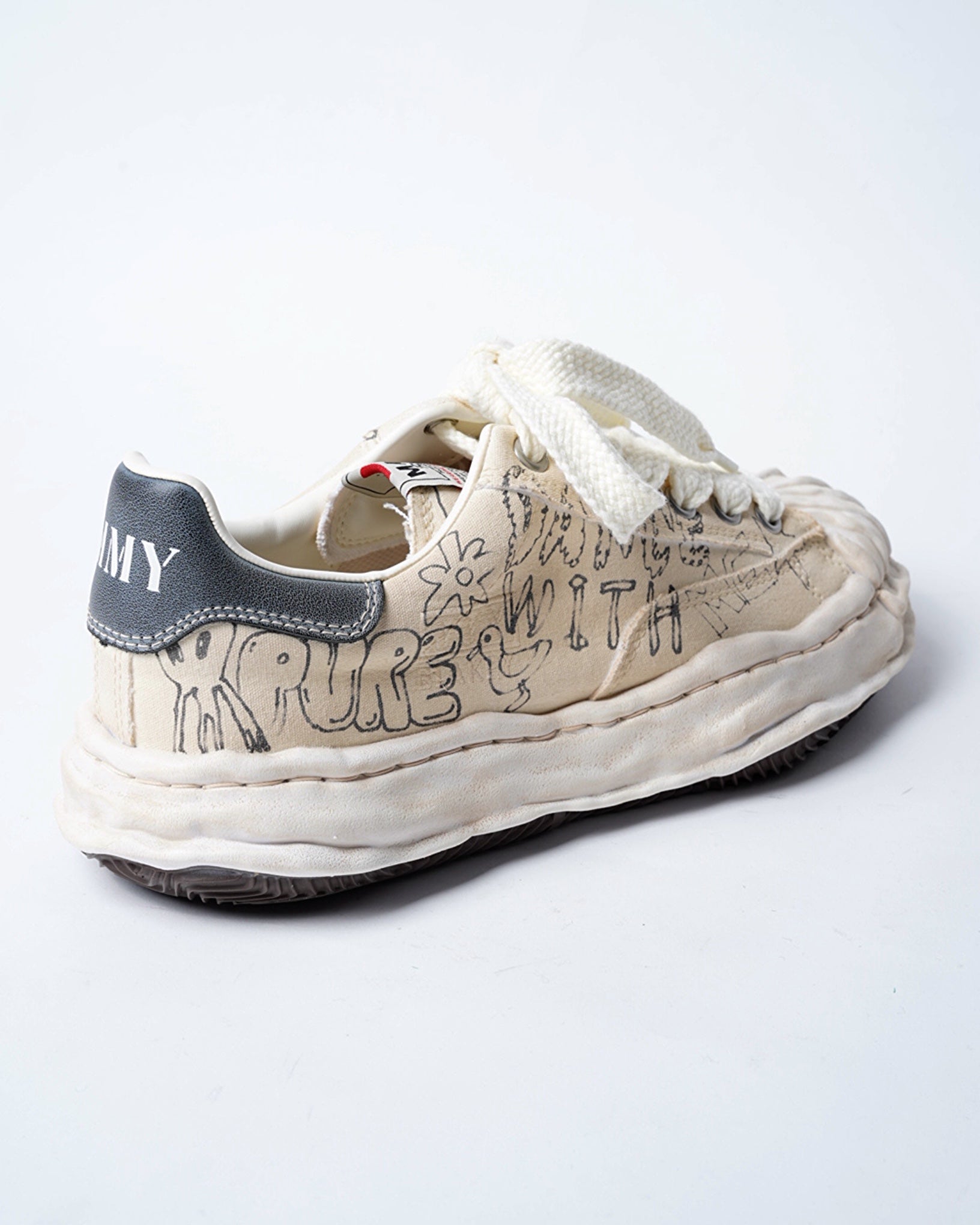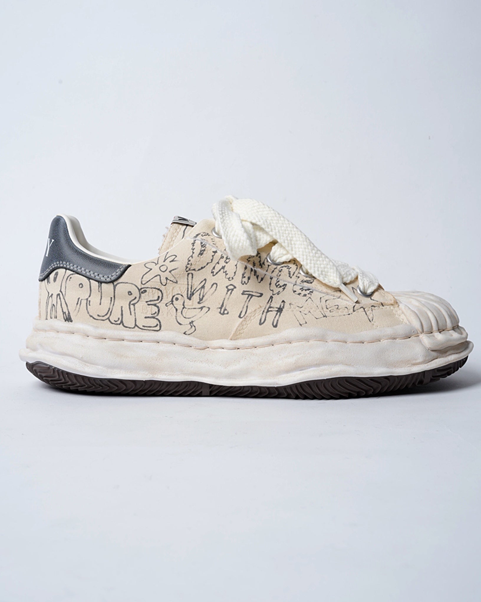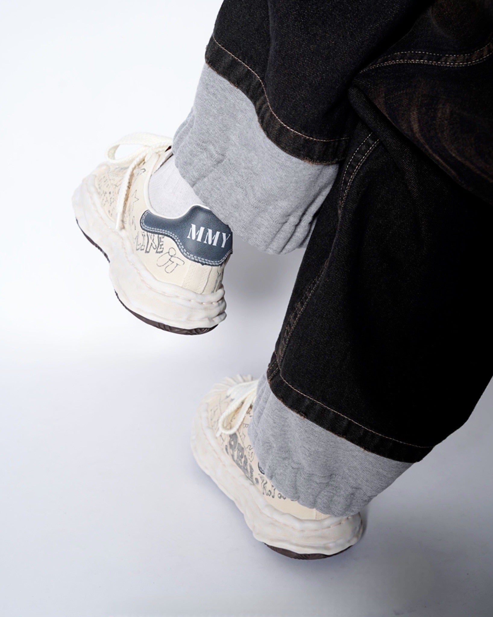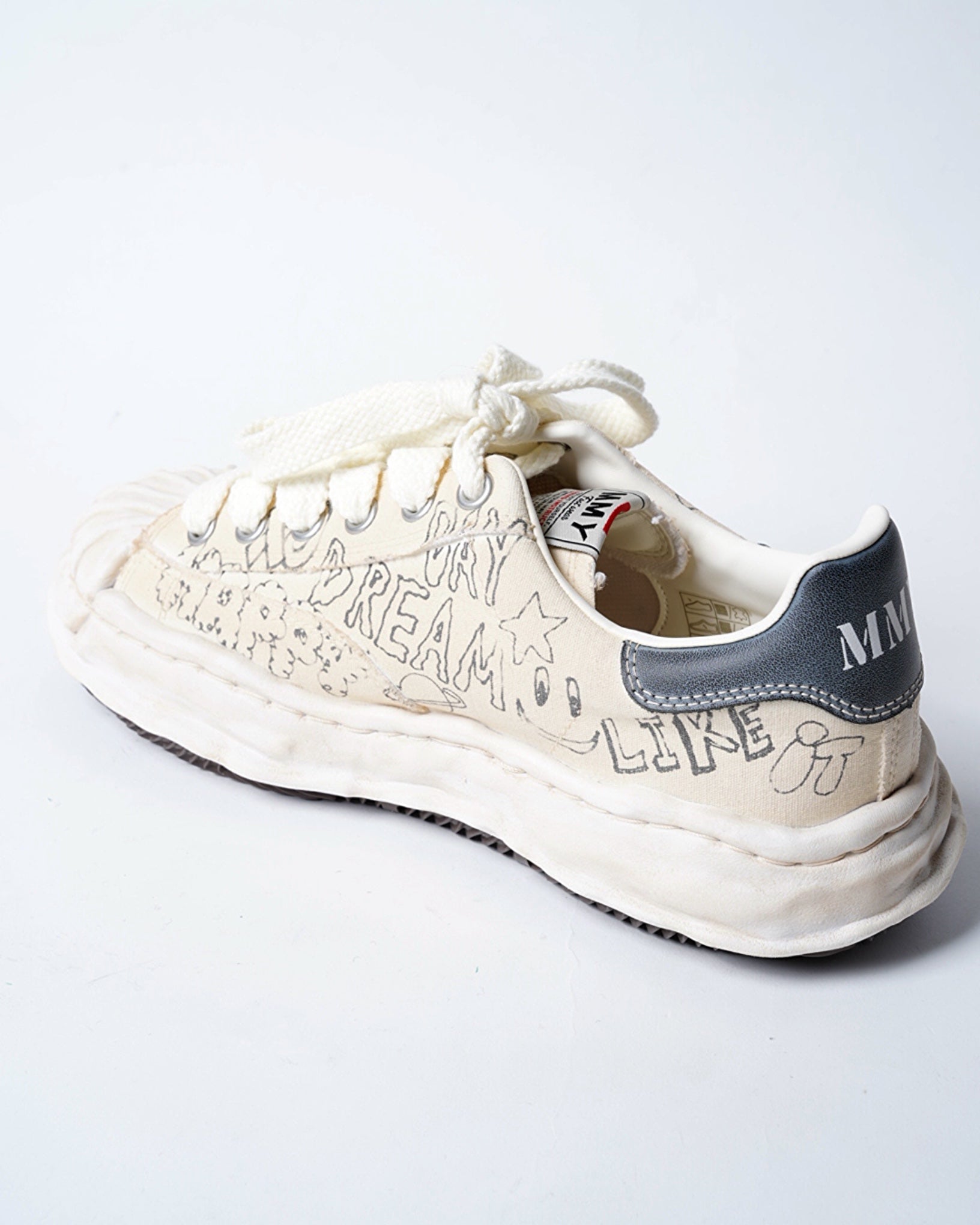 ・落書きのようなプリントが象徴的なデザインとなっており、ミハラヤスヒロらしいプレイフルでユニークな一足に。