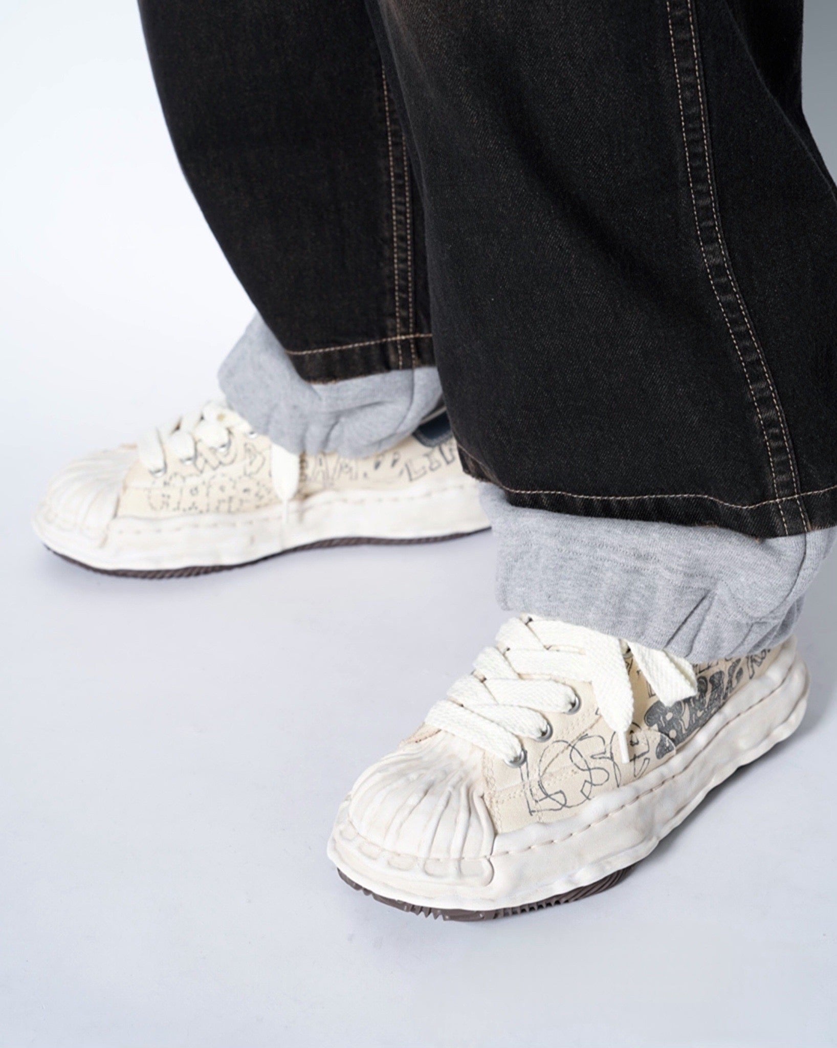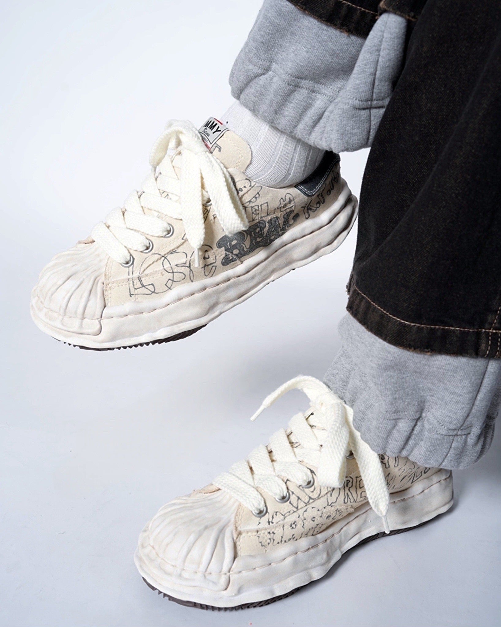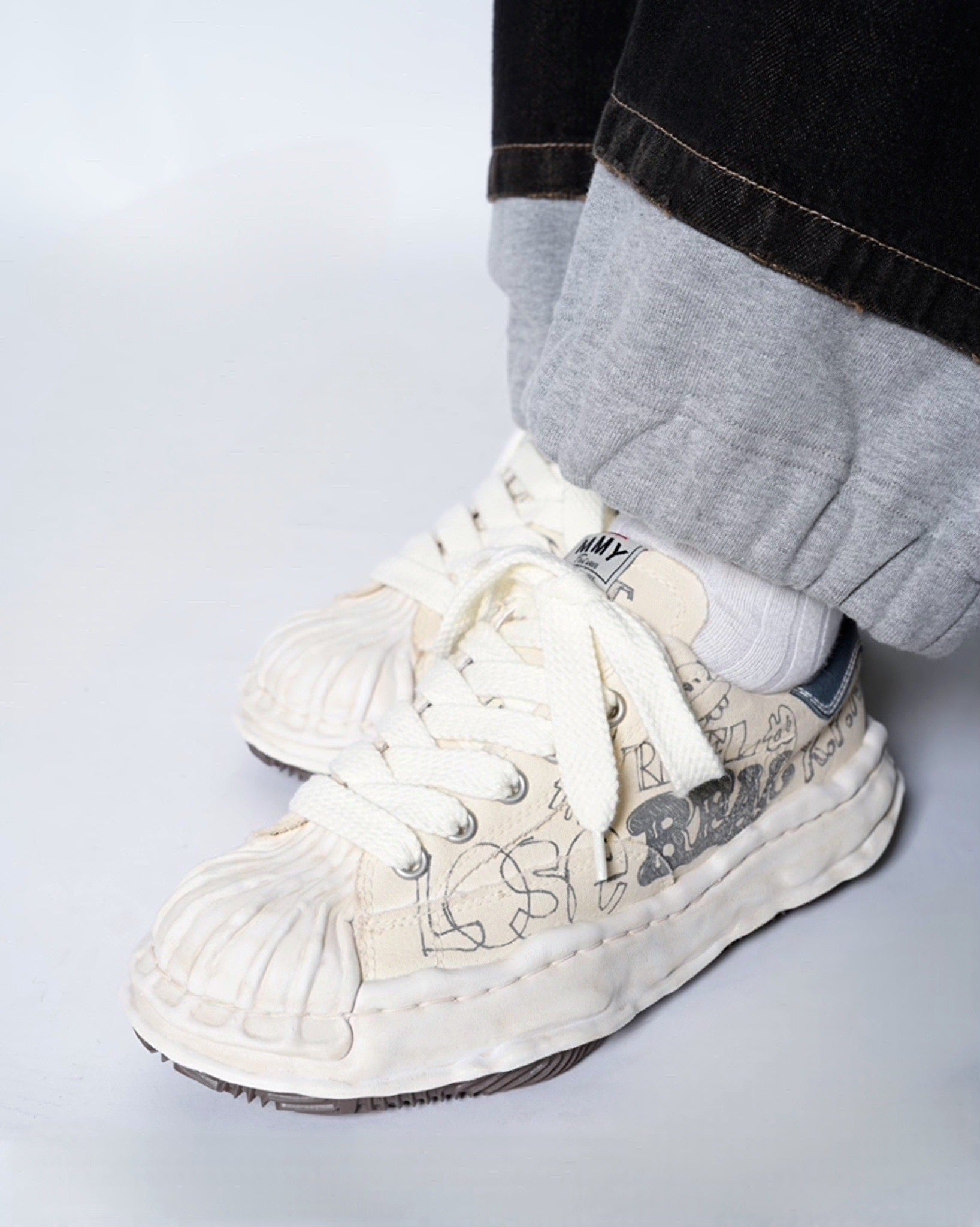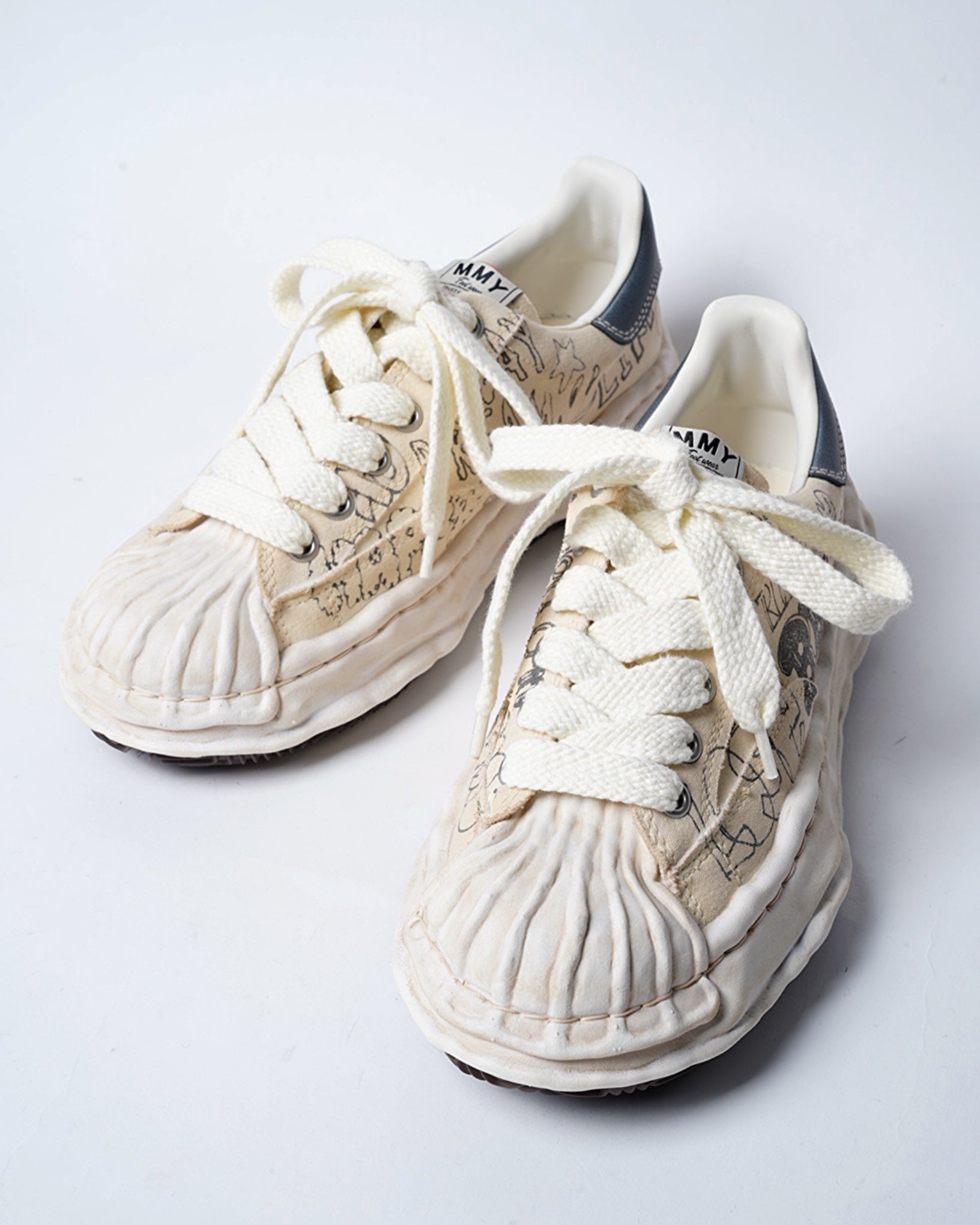 ・落書きのようなプリントが象徴的なデザインとなっており、ミハラヤスヒロらしいプレイフルでユニークな一足に。