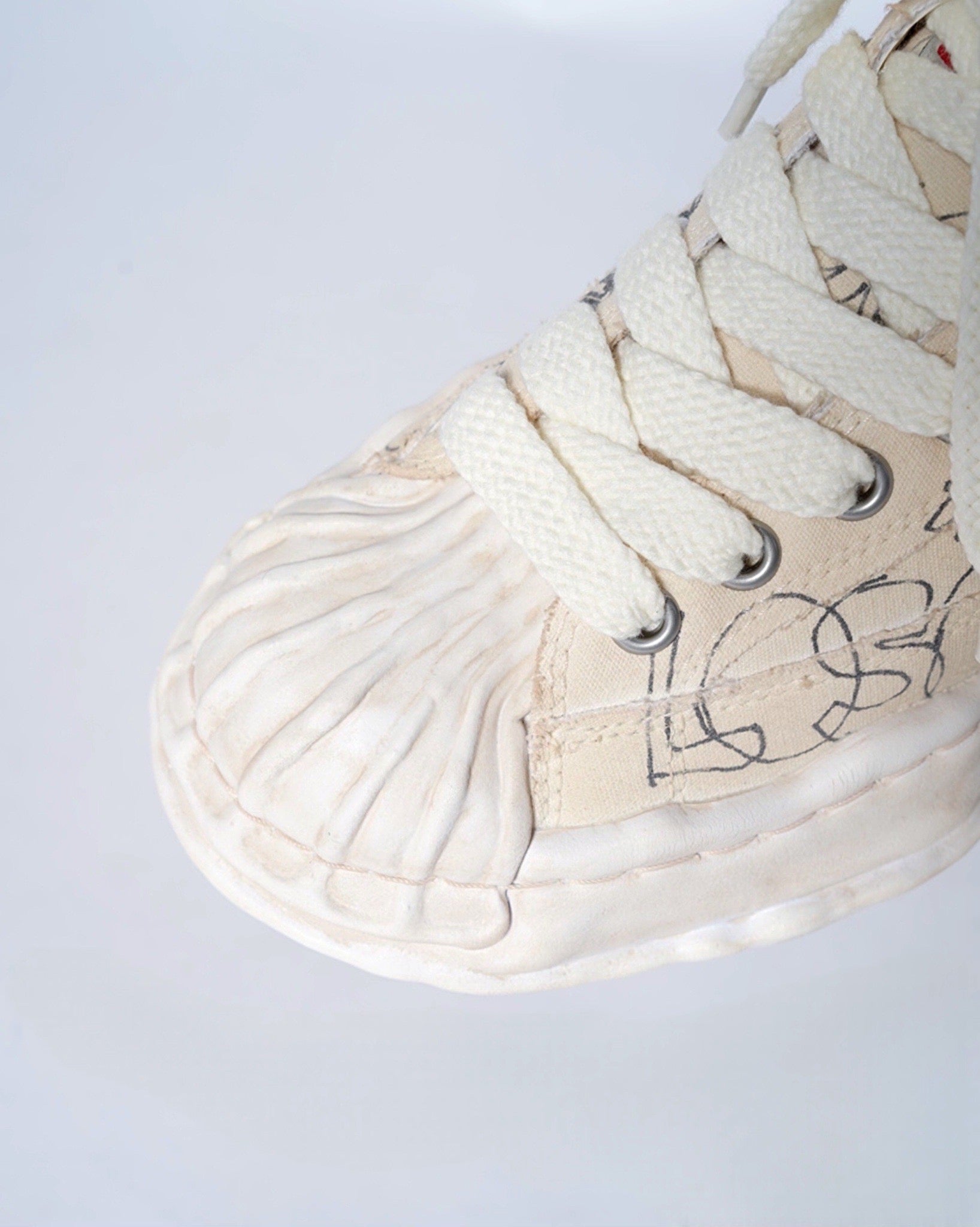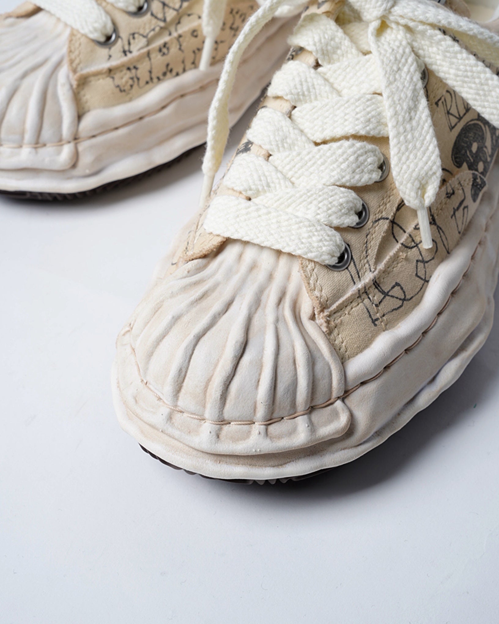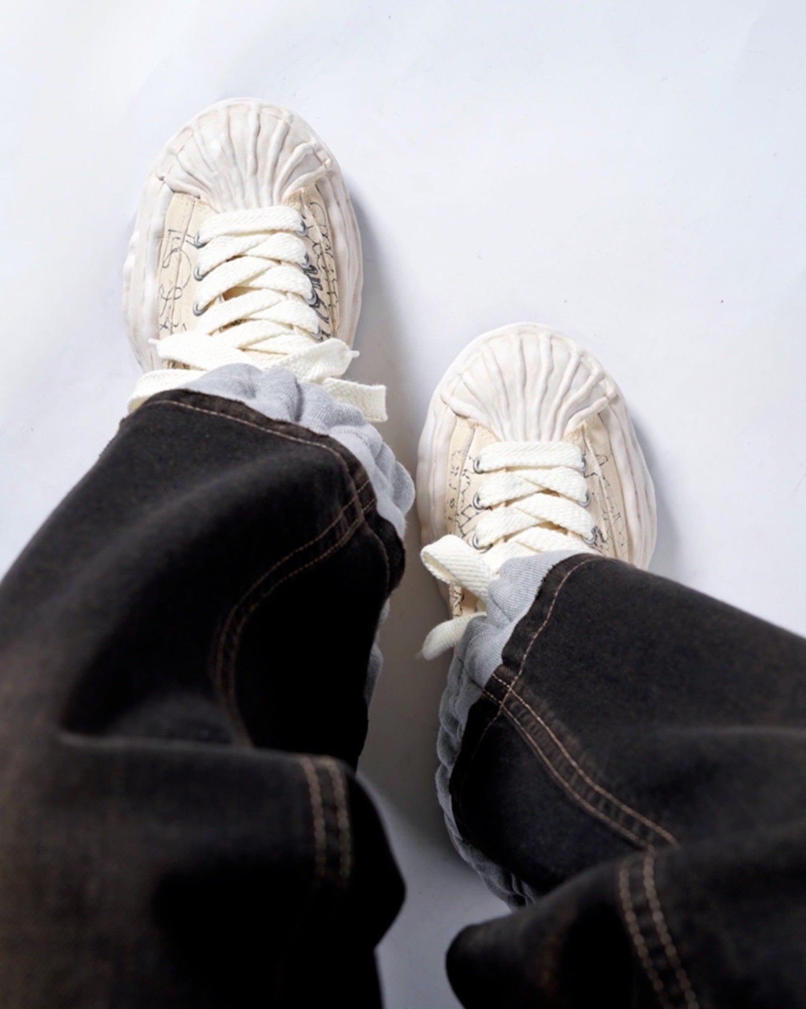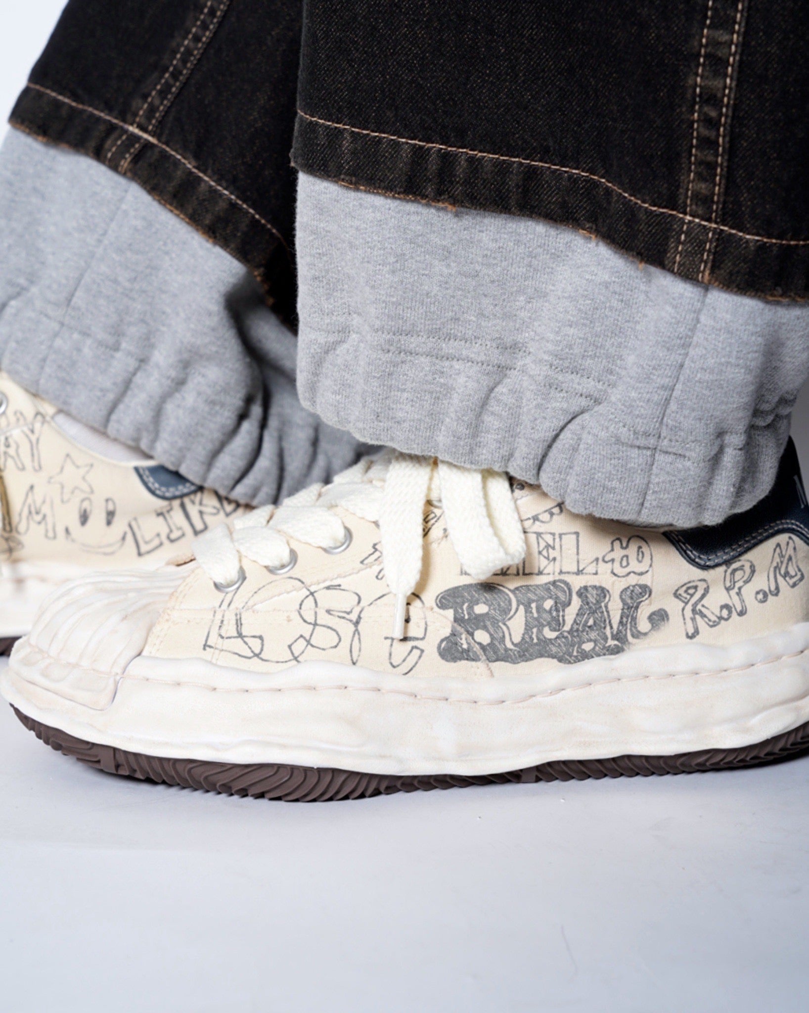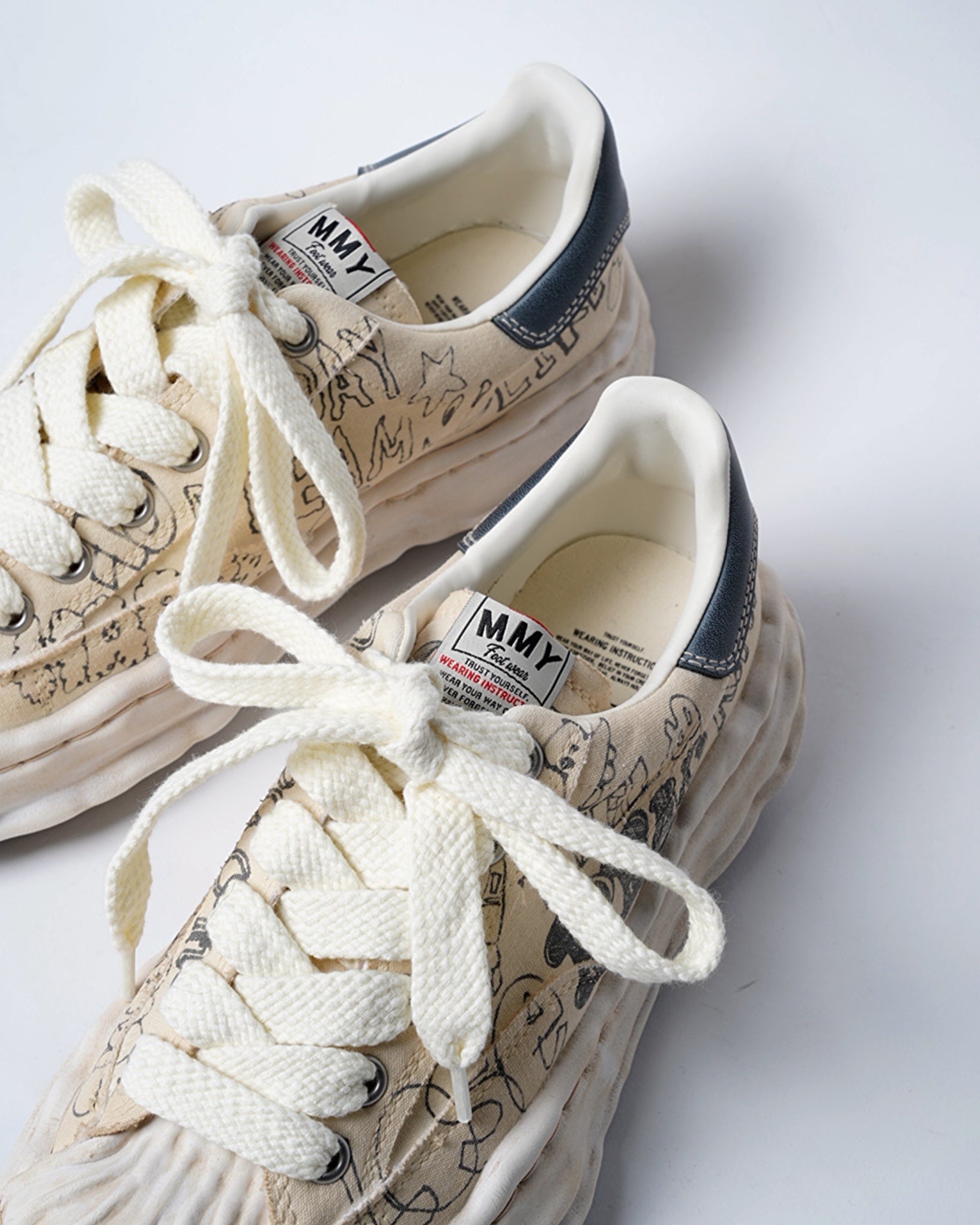 ・落書きのようなプリントが象徴的なデザインとなっており、ミハラヤスヒロらしいプレイフルでユニークな一足に。