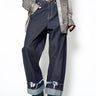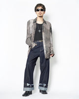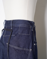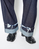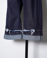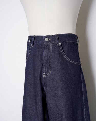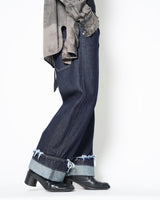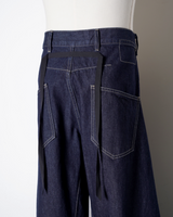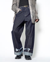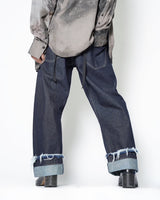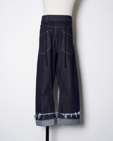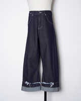 ・腰やワタリはデニムパンツらしい側面を持ちながら、折り紙のように裾のワイドなロールアップと複雑なパターンワークで立体的に構築。