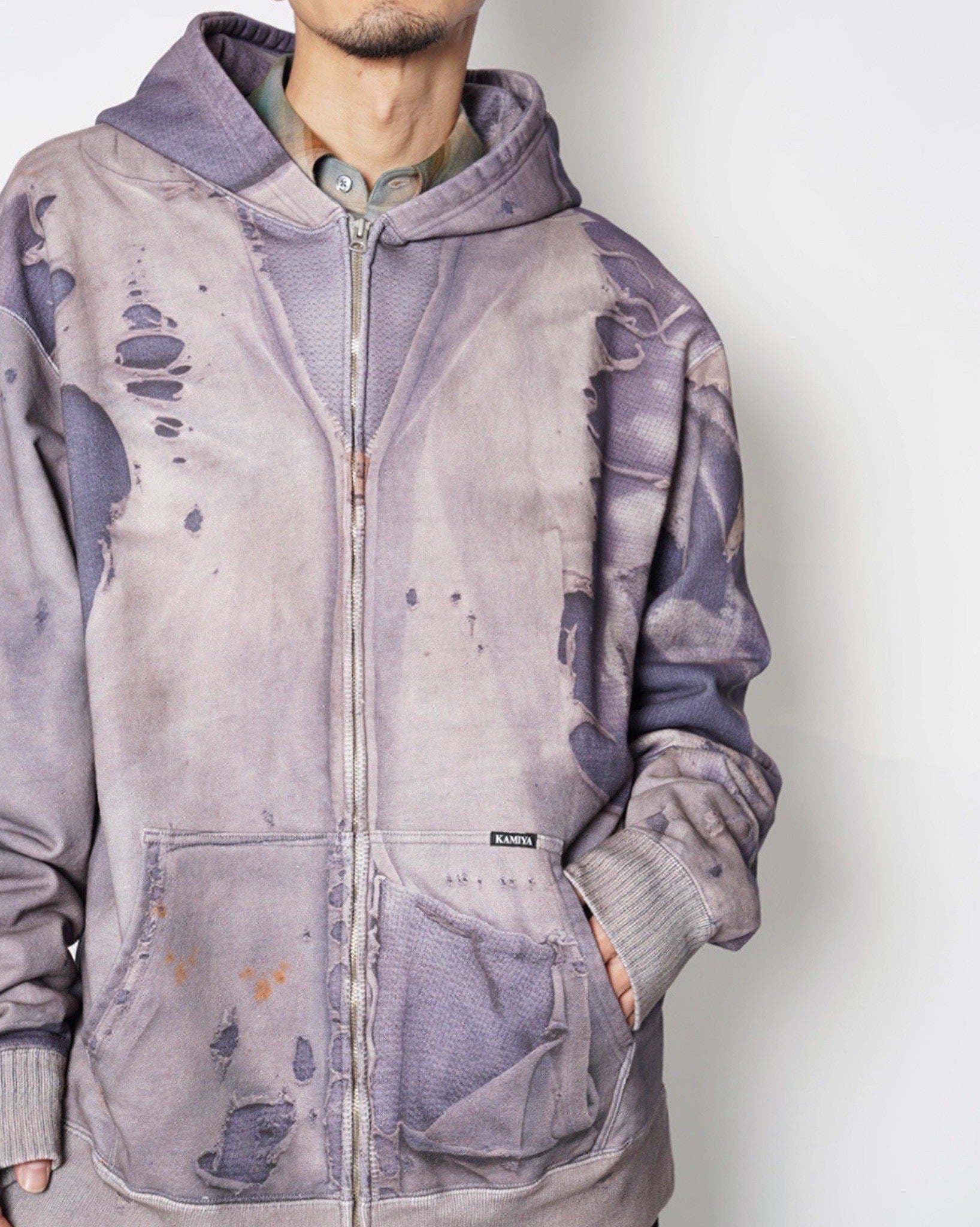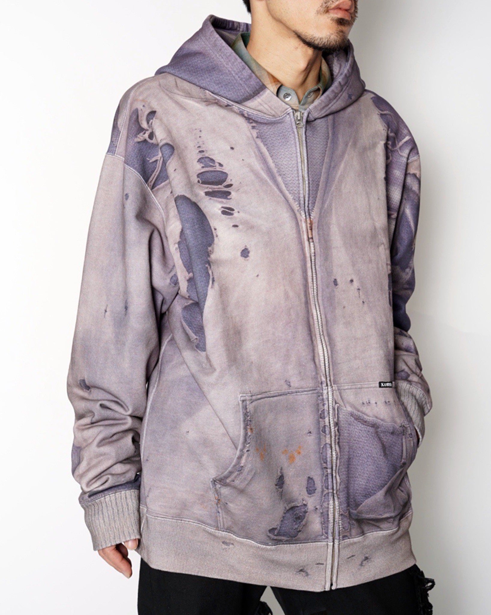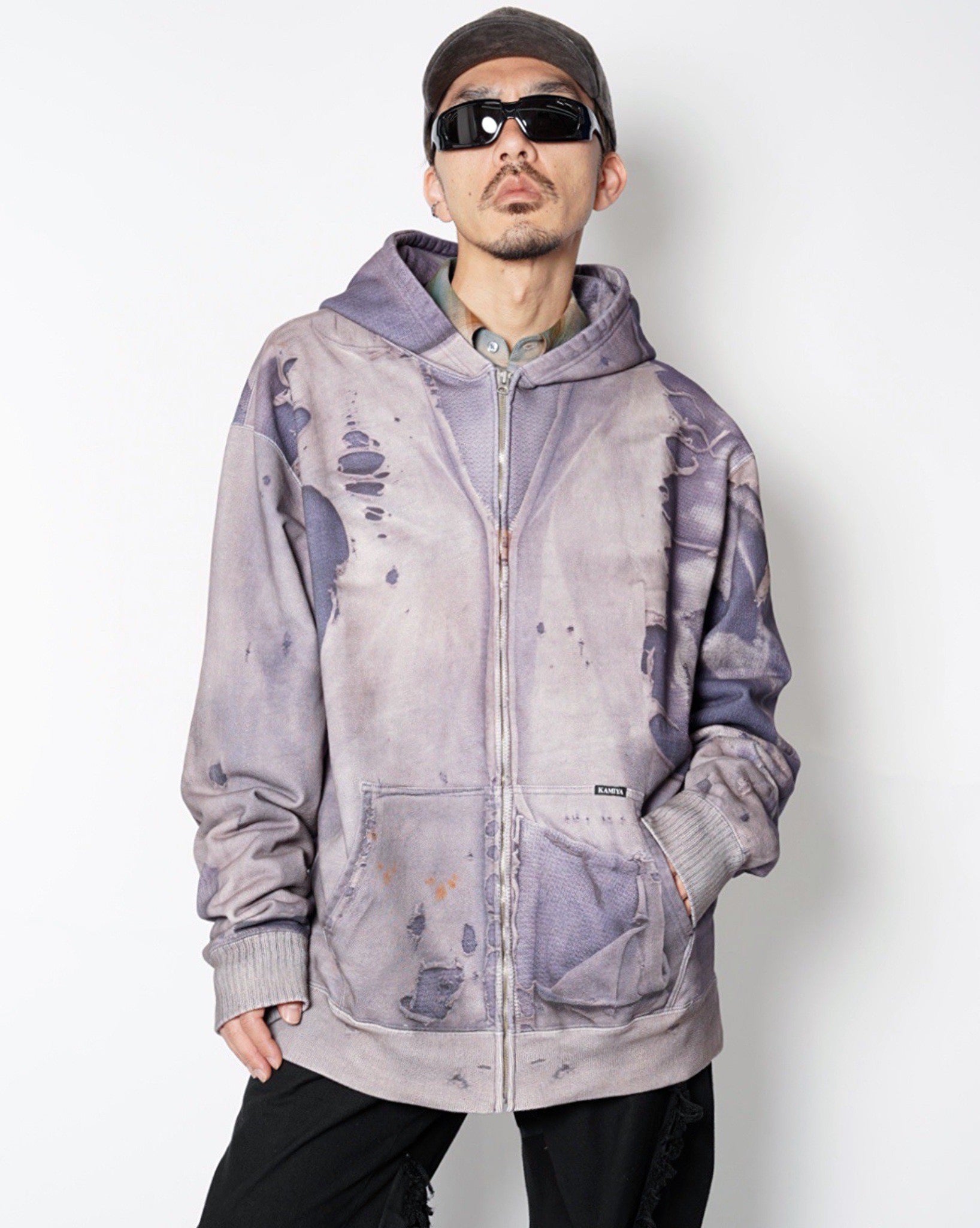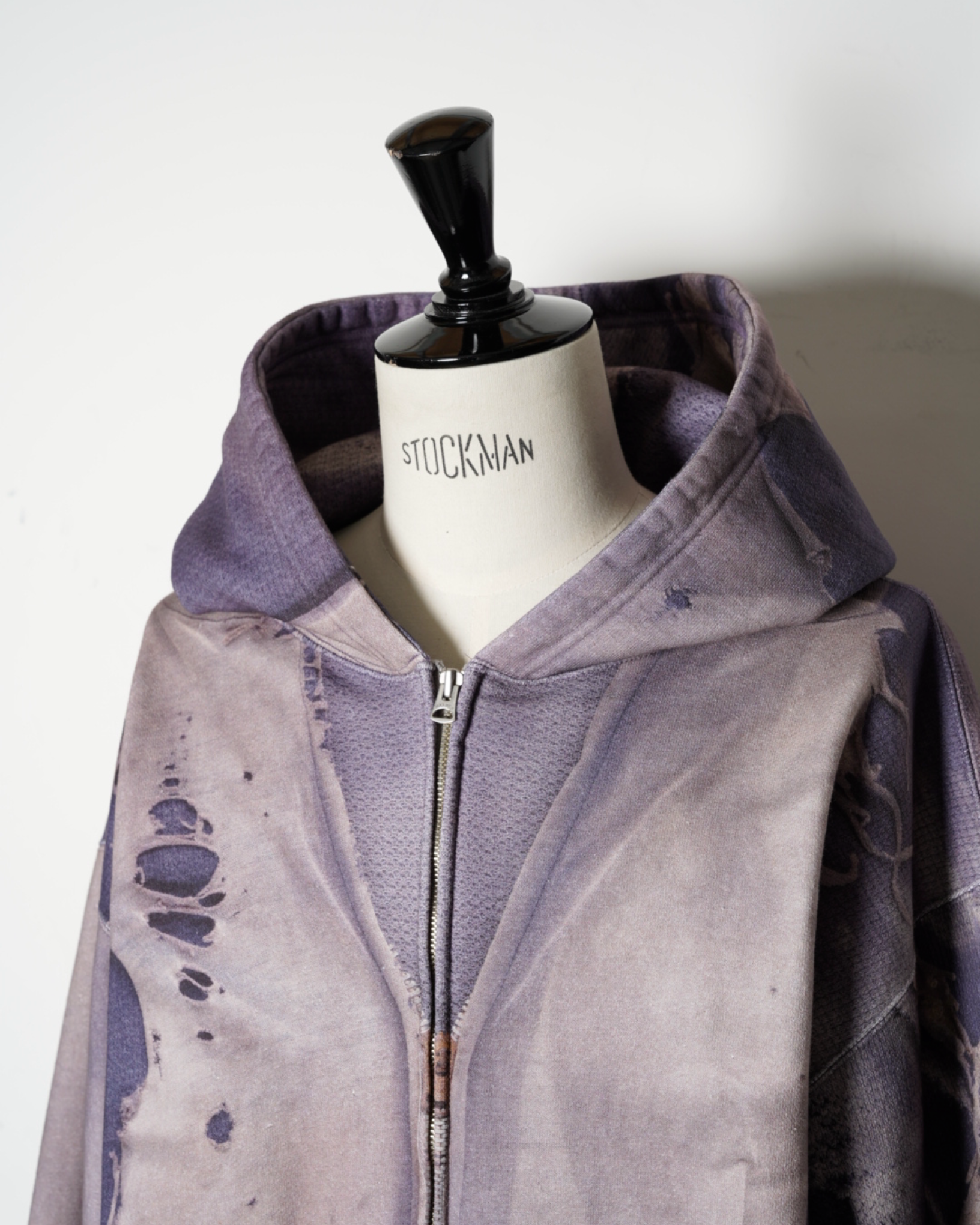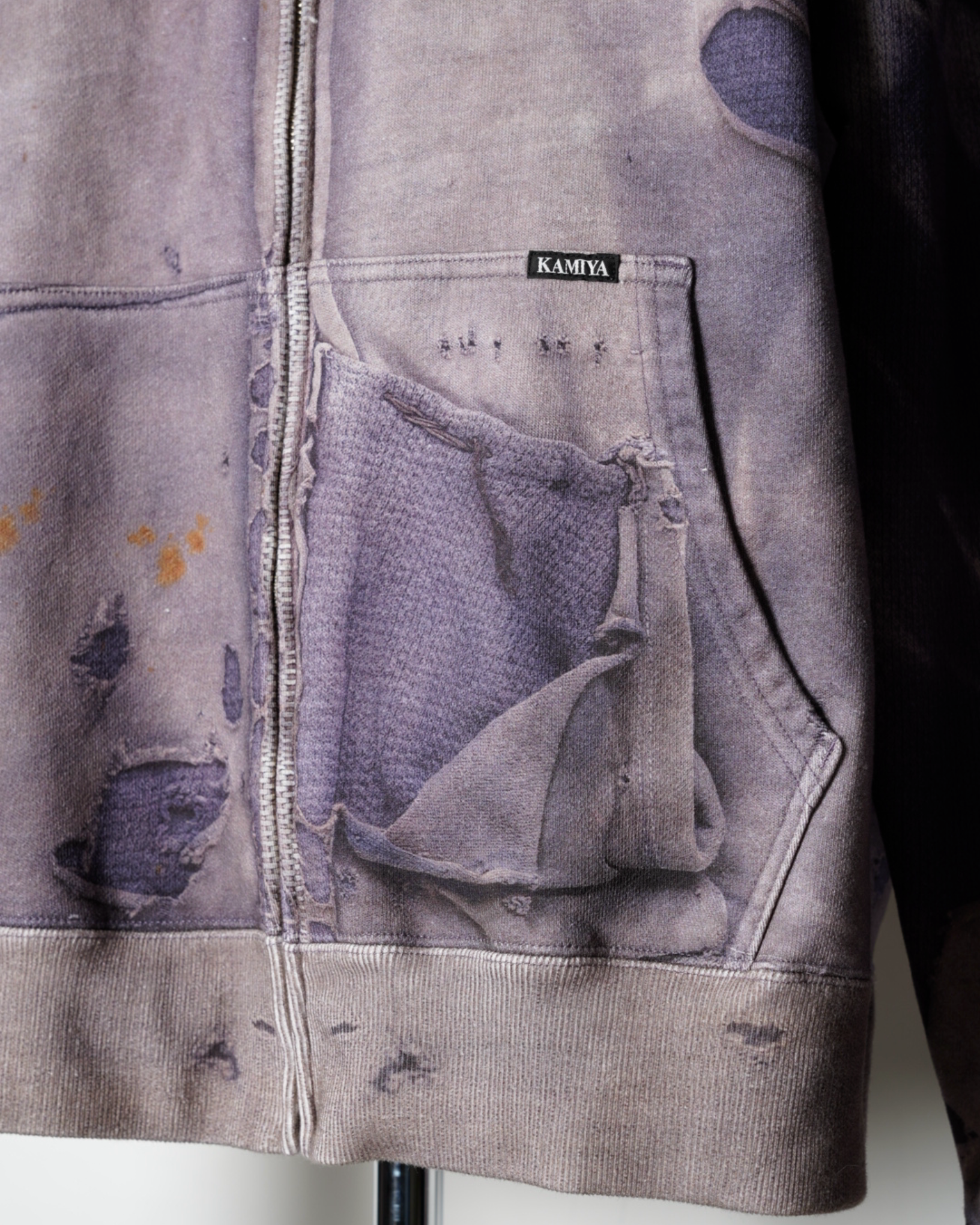 ・こちらはビンテージのジップアップフーディーをそのままに転写プリントしており、本当にダメージが施されたのかと錯覚するほどに非常にリアルで騙し絵的な仕上がりです。