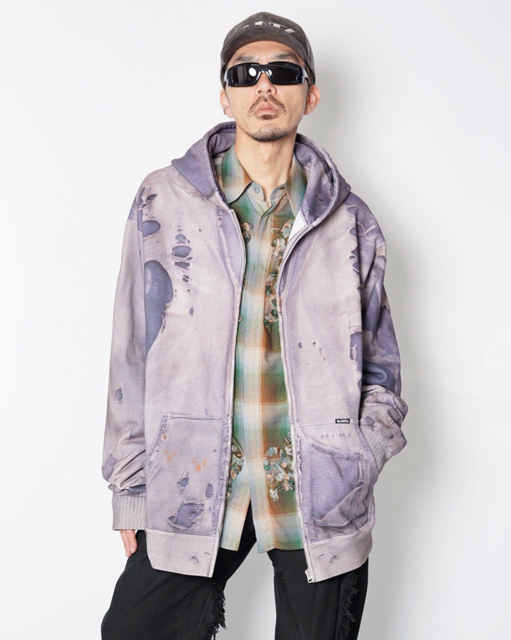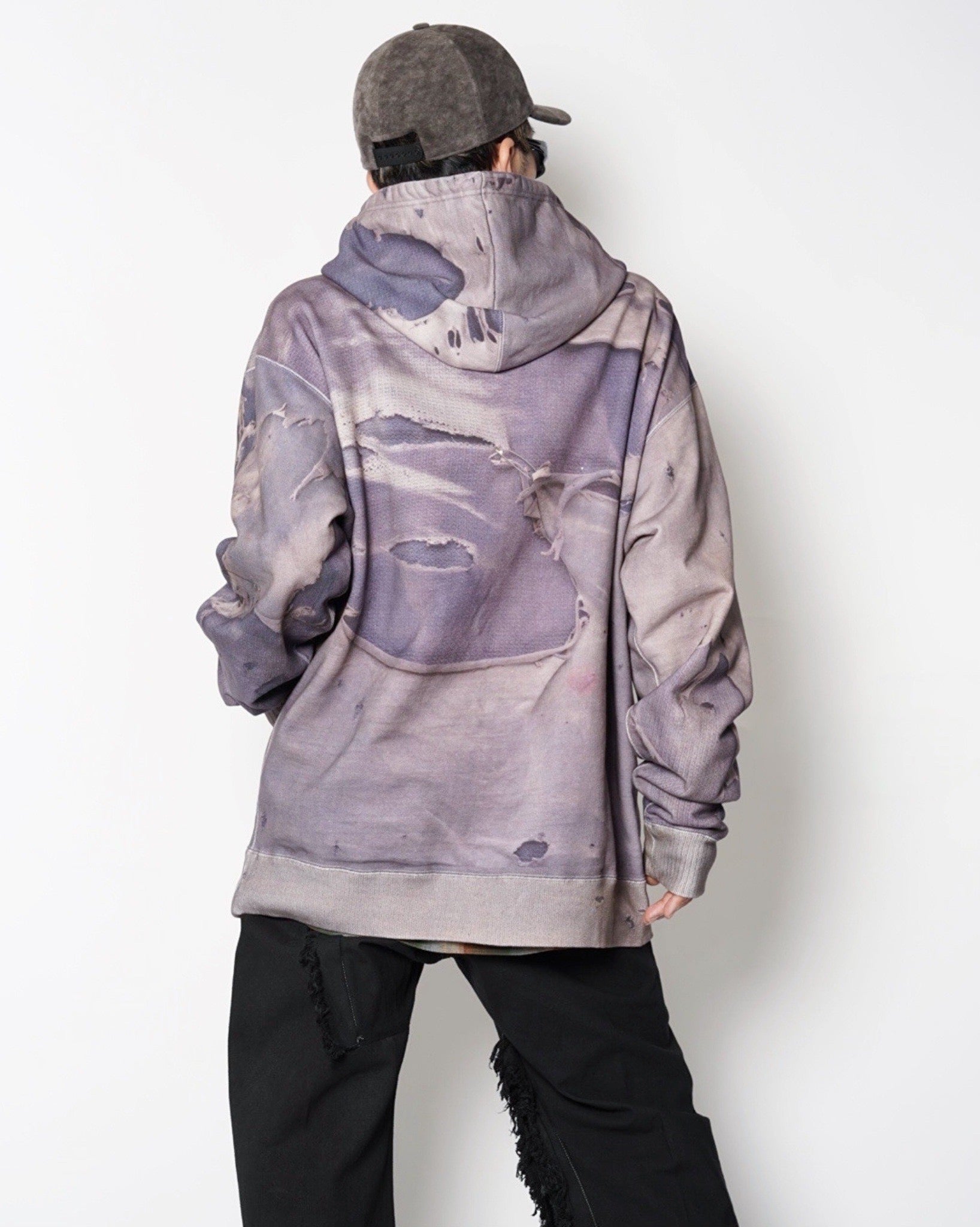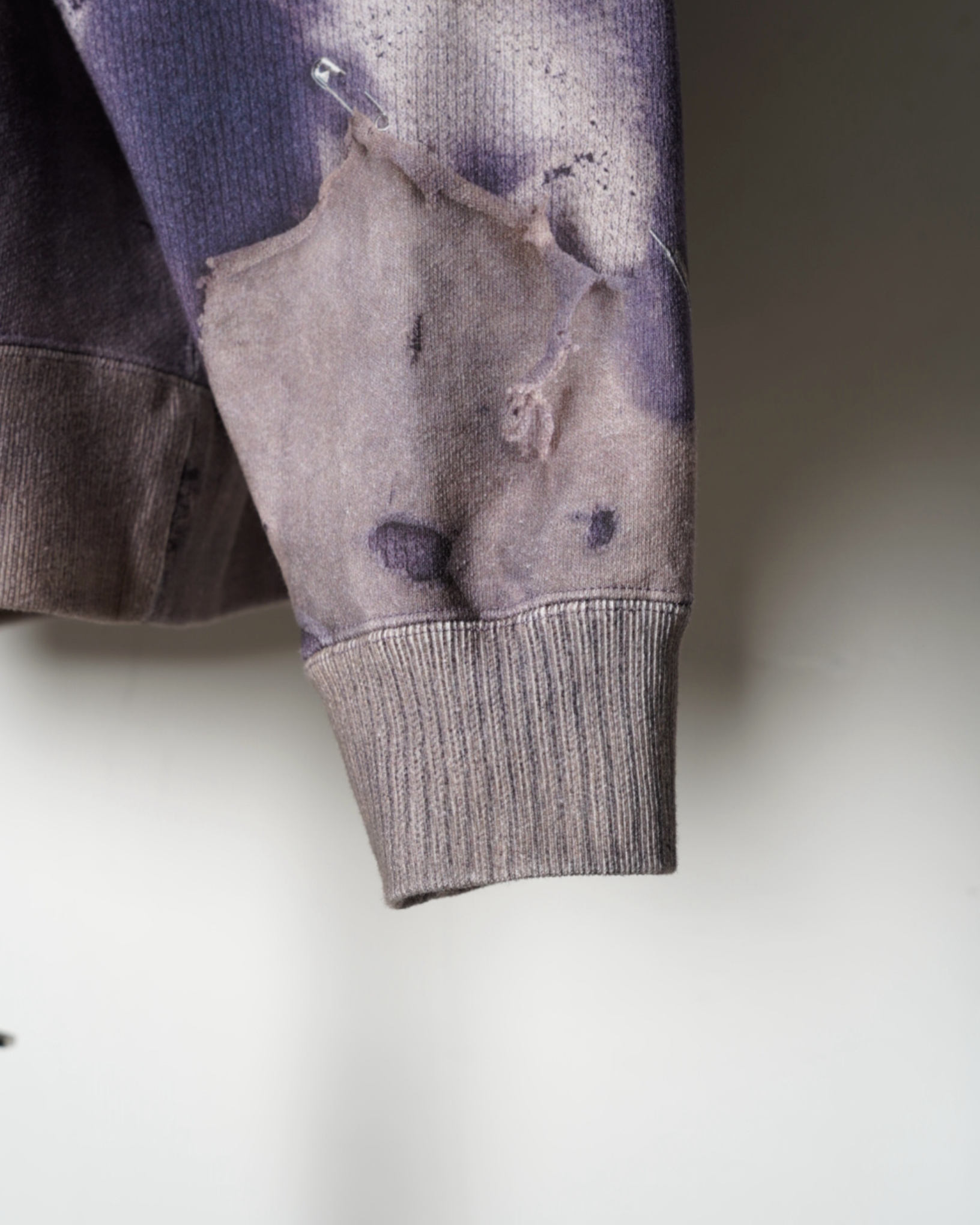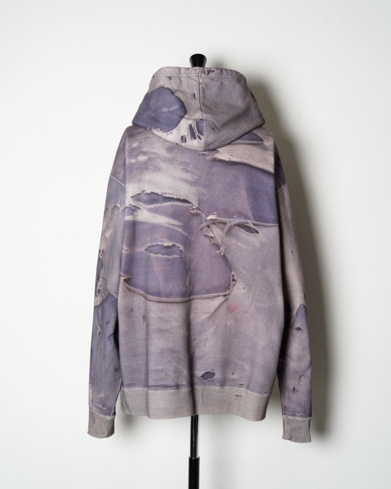・こちらはビンテージのジップアップフーディーをそのままに転写プリントしており、本当にダメージが施されたのかと錯覚するほどに非常にリアルで騙し絵的な仕上がりです。