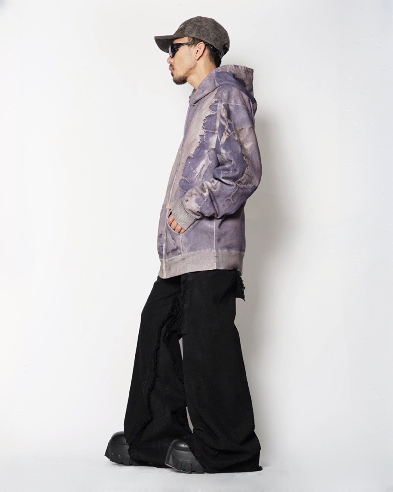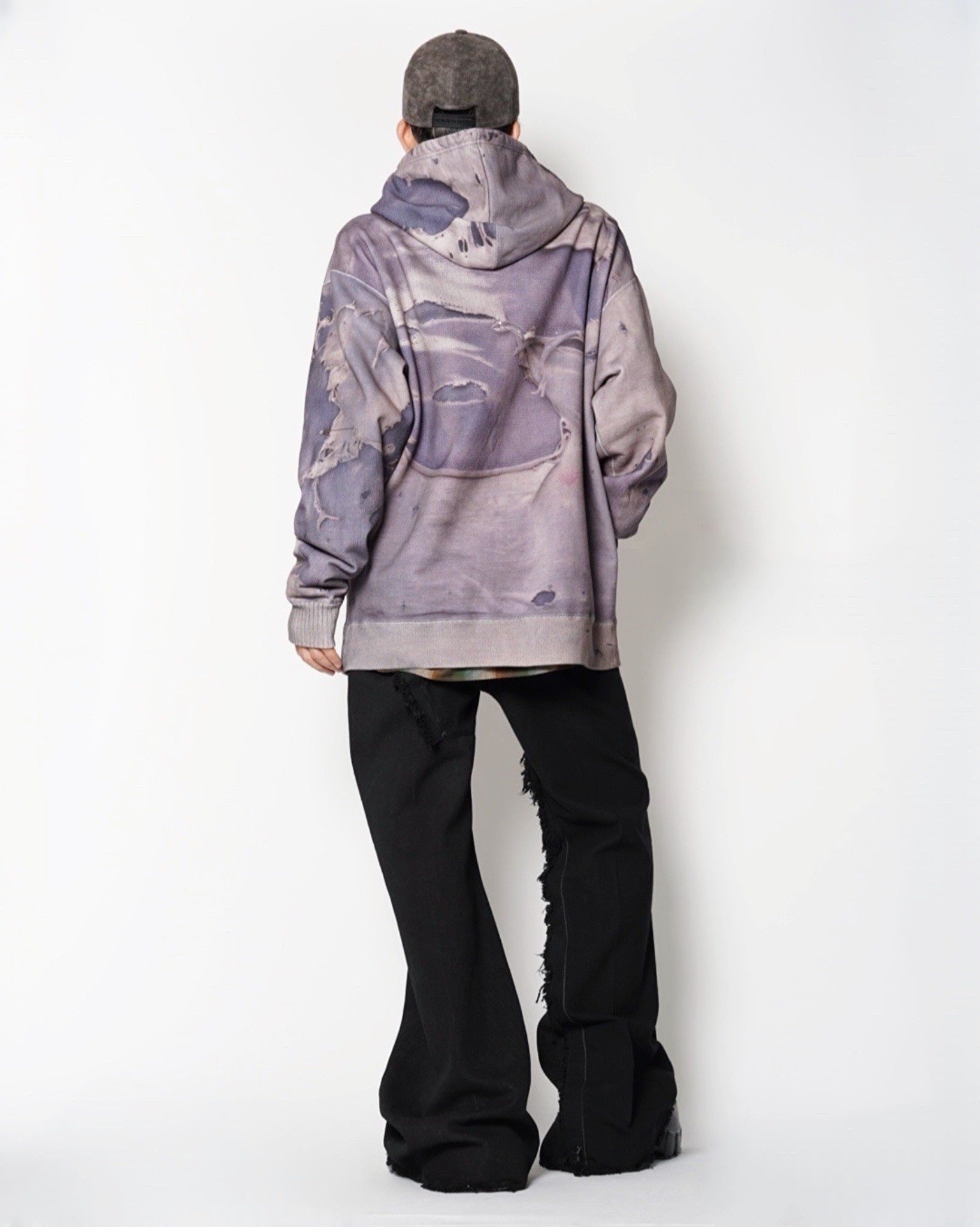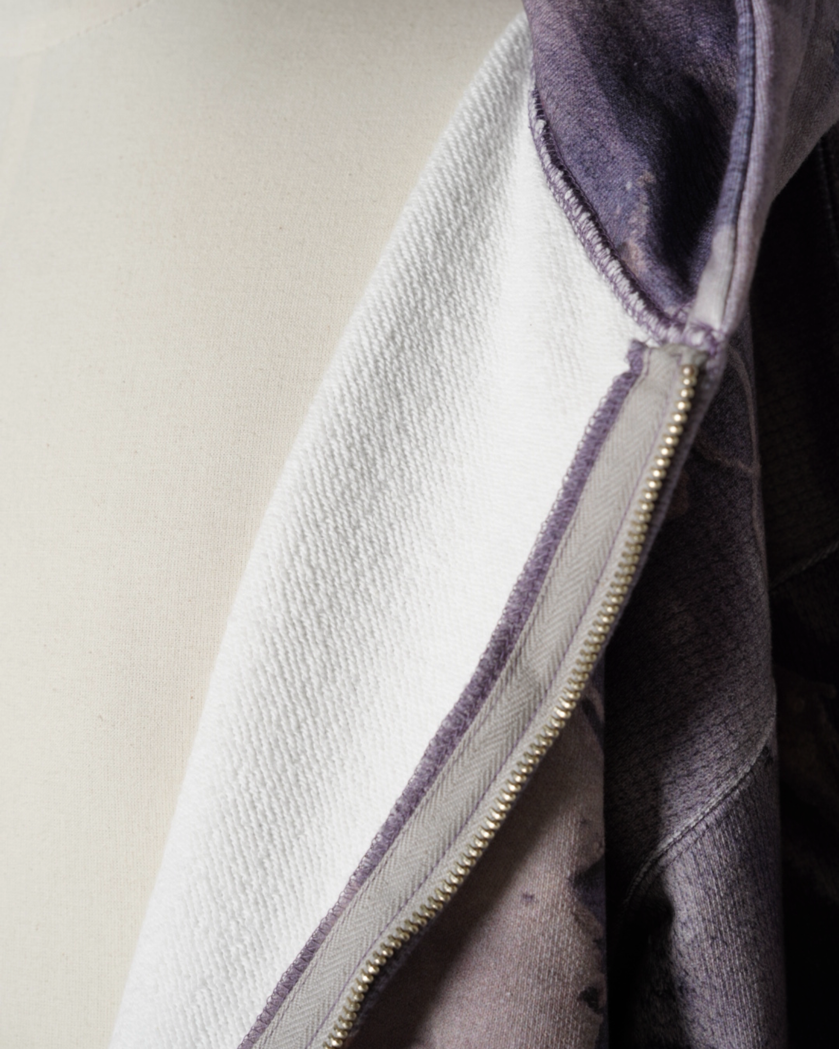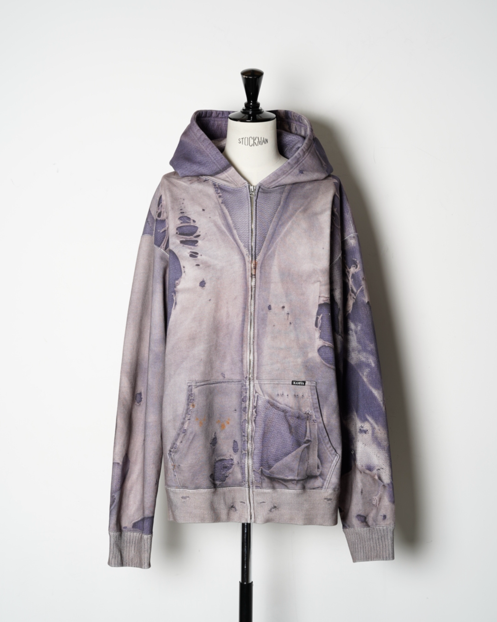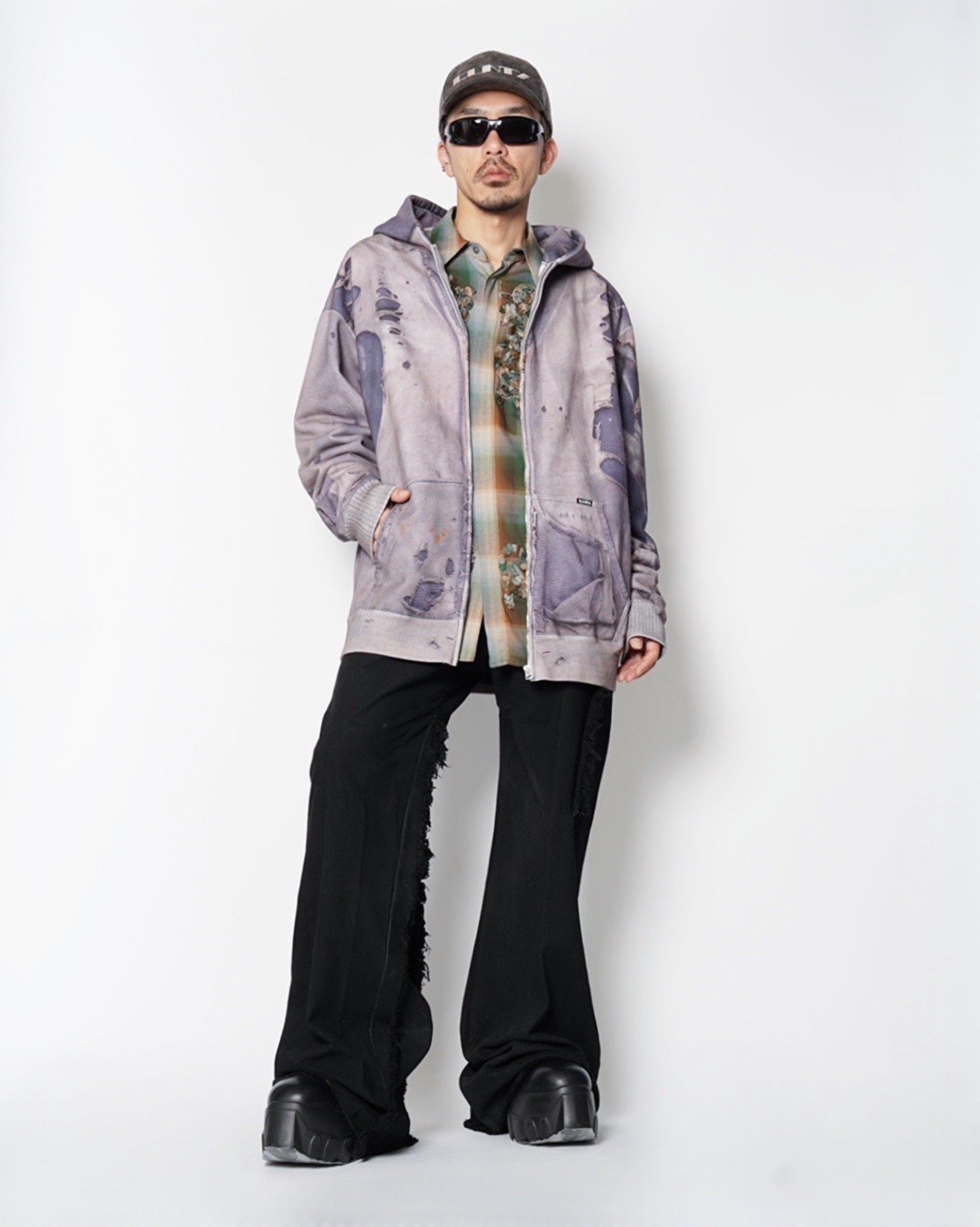 ・こちらはビンテージのジップアップフーディーをそのままに転写プリントしており、本当にダメージが施されたのかと錯覚するほどに非常にリアルで騙し絵的な仕上がりです。