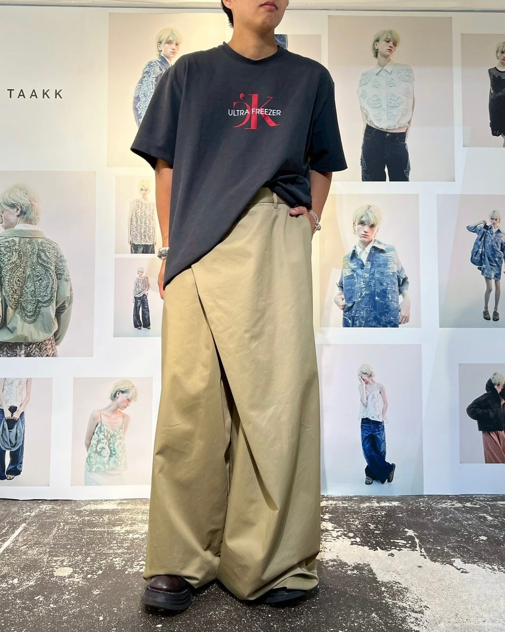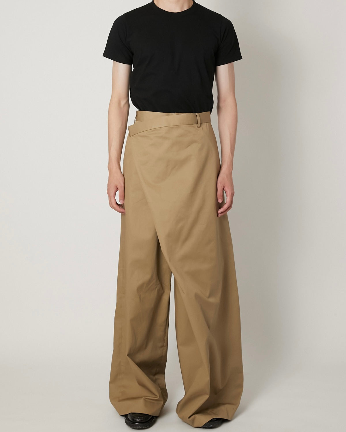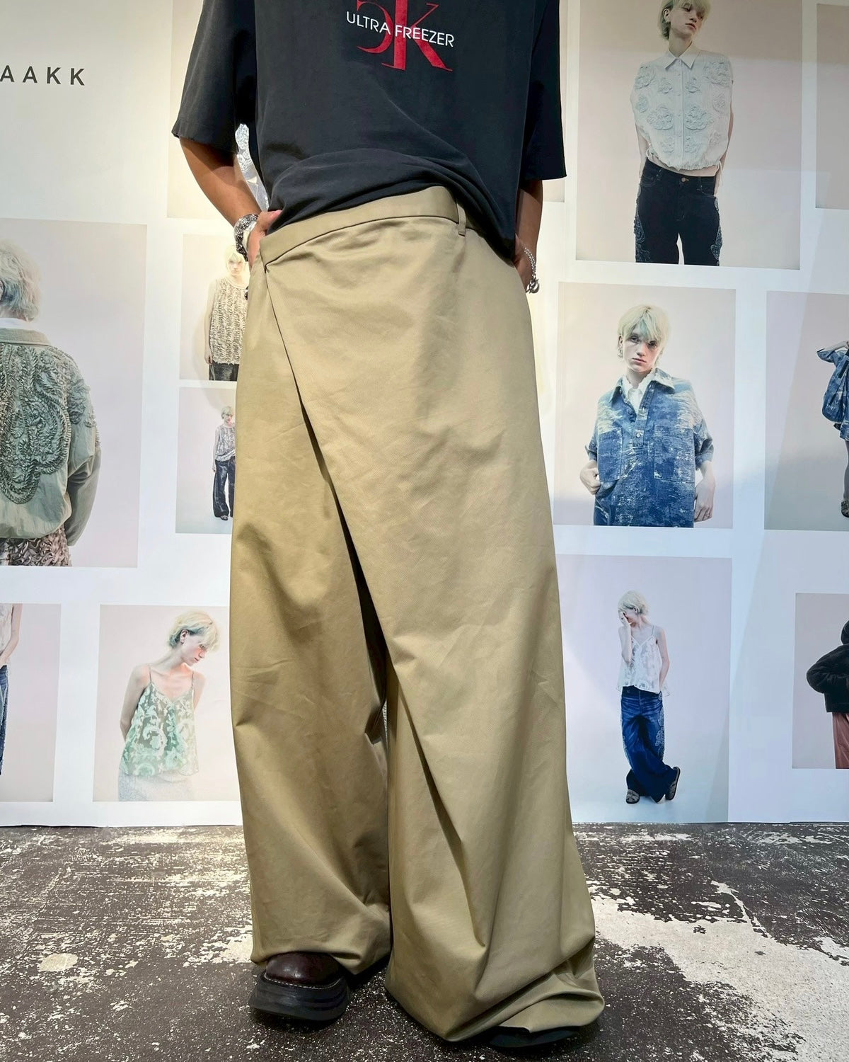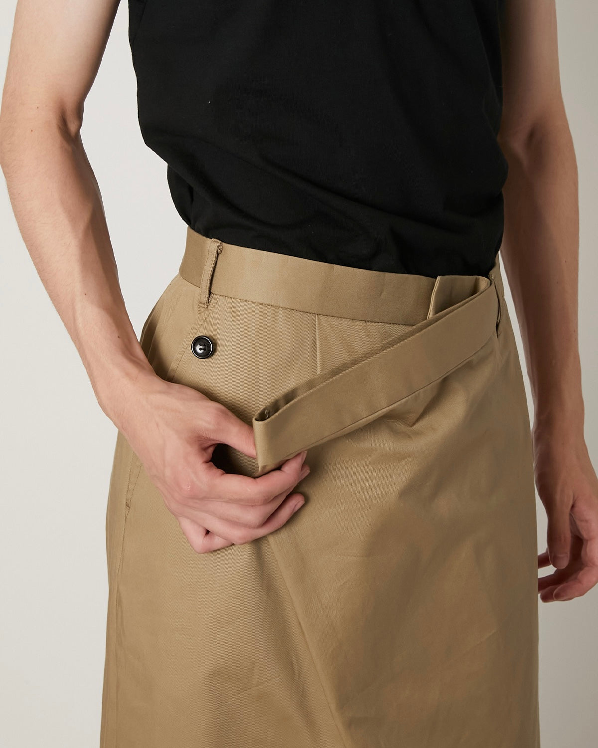 一見するとラップスカートのようにも見える、独創的なパターン構造を持つワイドチノパンツ。前面に大胆なラップディテールを重ねることで、パンツでありながらスカートのような流れと量感を生み出しています。 後ろ姿はクラシックなスラックスのようにまとめ、カジュアルさと上品さが共存。日常着としての実用性を保ちながら、視覚的なひねりを加えたTAAKKらしい一本です。