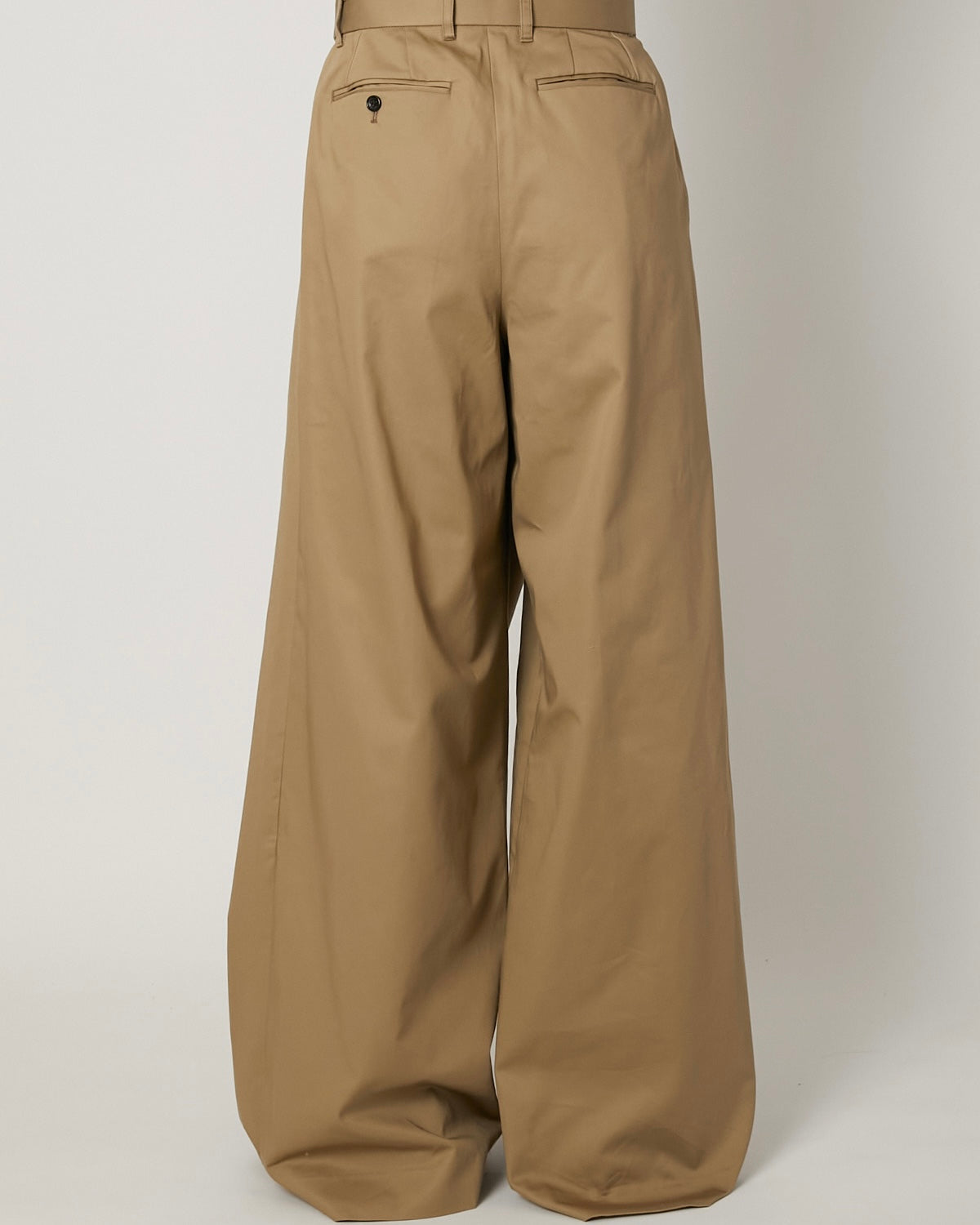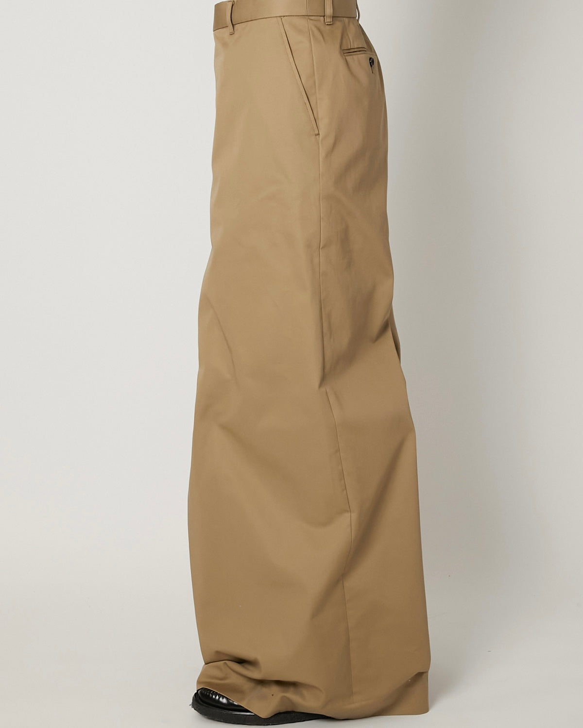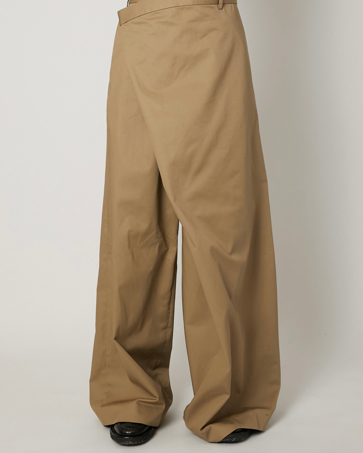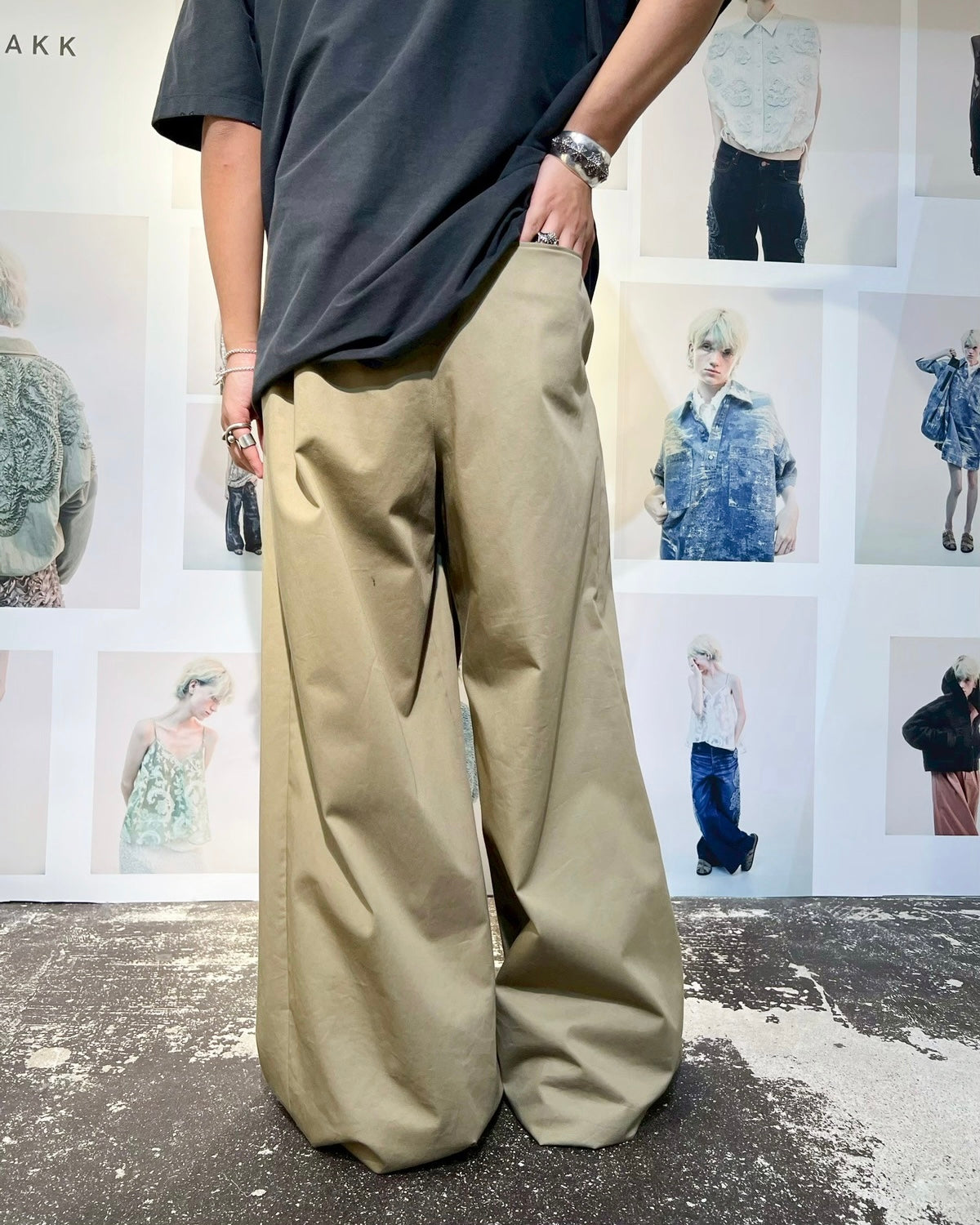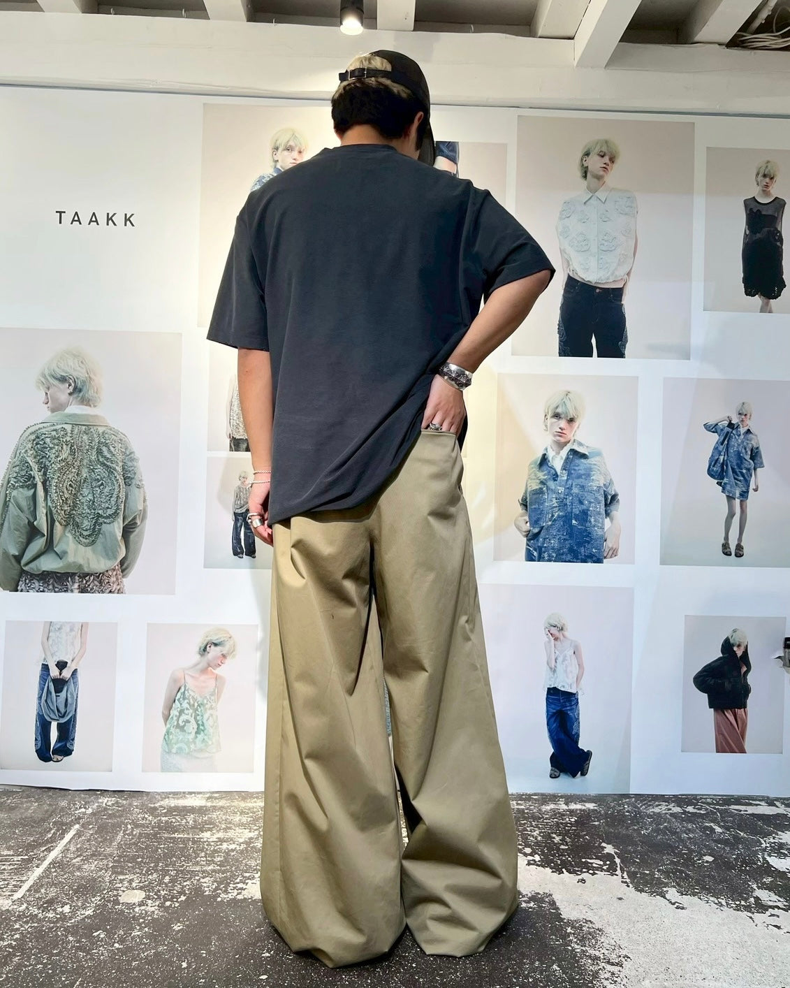 一見するとラップスカートのようにも見える、独創的なパターン構造を持つワイドチノパンツ。前面に大胆なラップディテールを重ねることで、パンツでありながらスカートのような流れと量感を生み出しています。 後ろ姿はクラシックなスラックスのようにまとめ、カジュアルさと上品さが共存。日常着としての実用性を保ちながら、視覚的なひねりを加えたTAAKKらしい一本です。