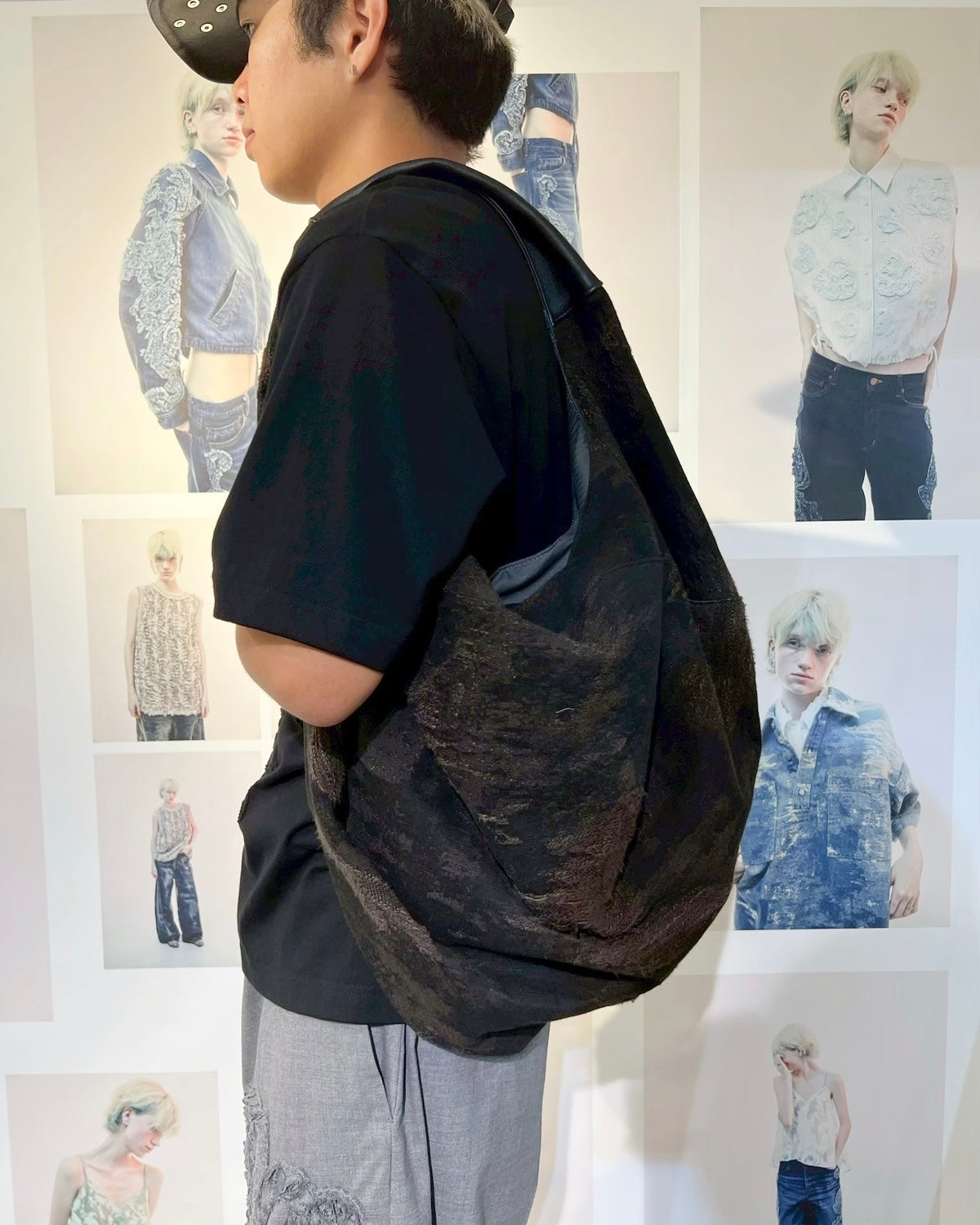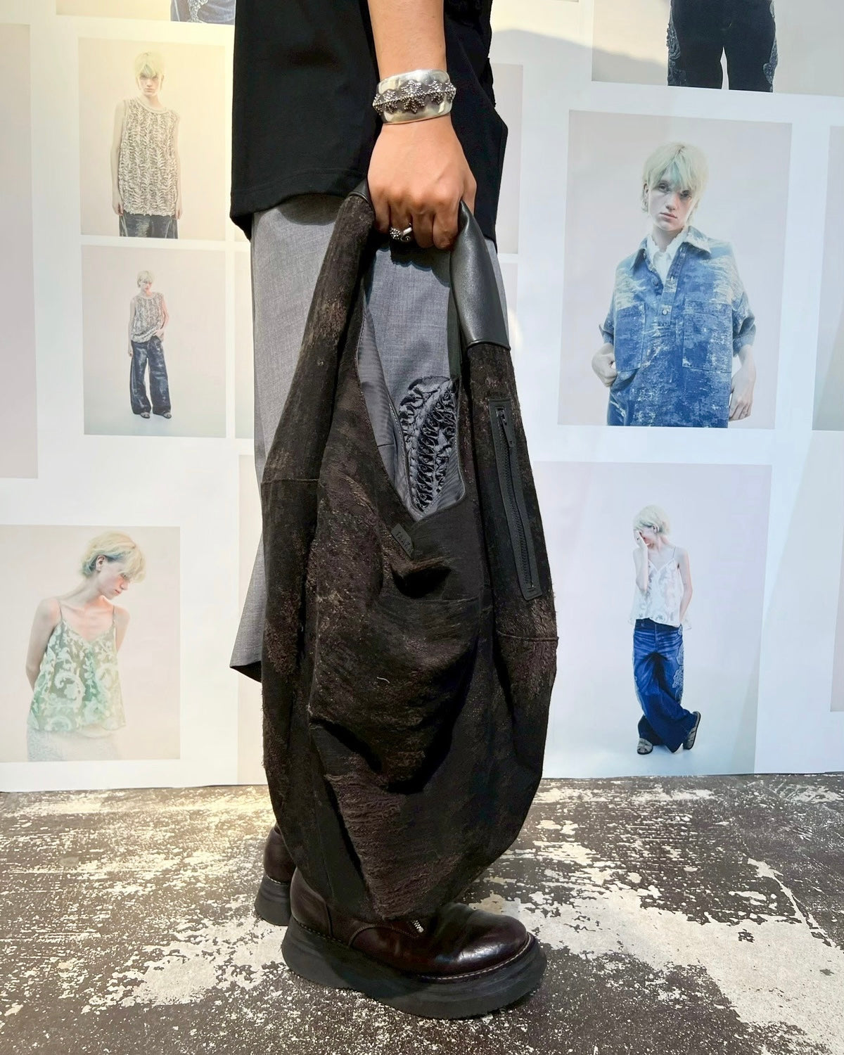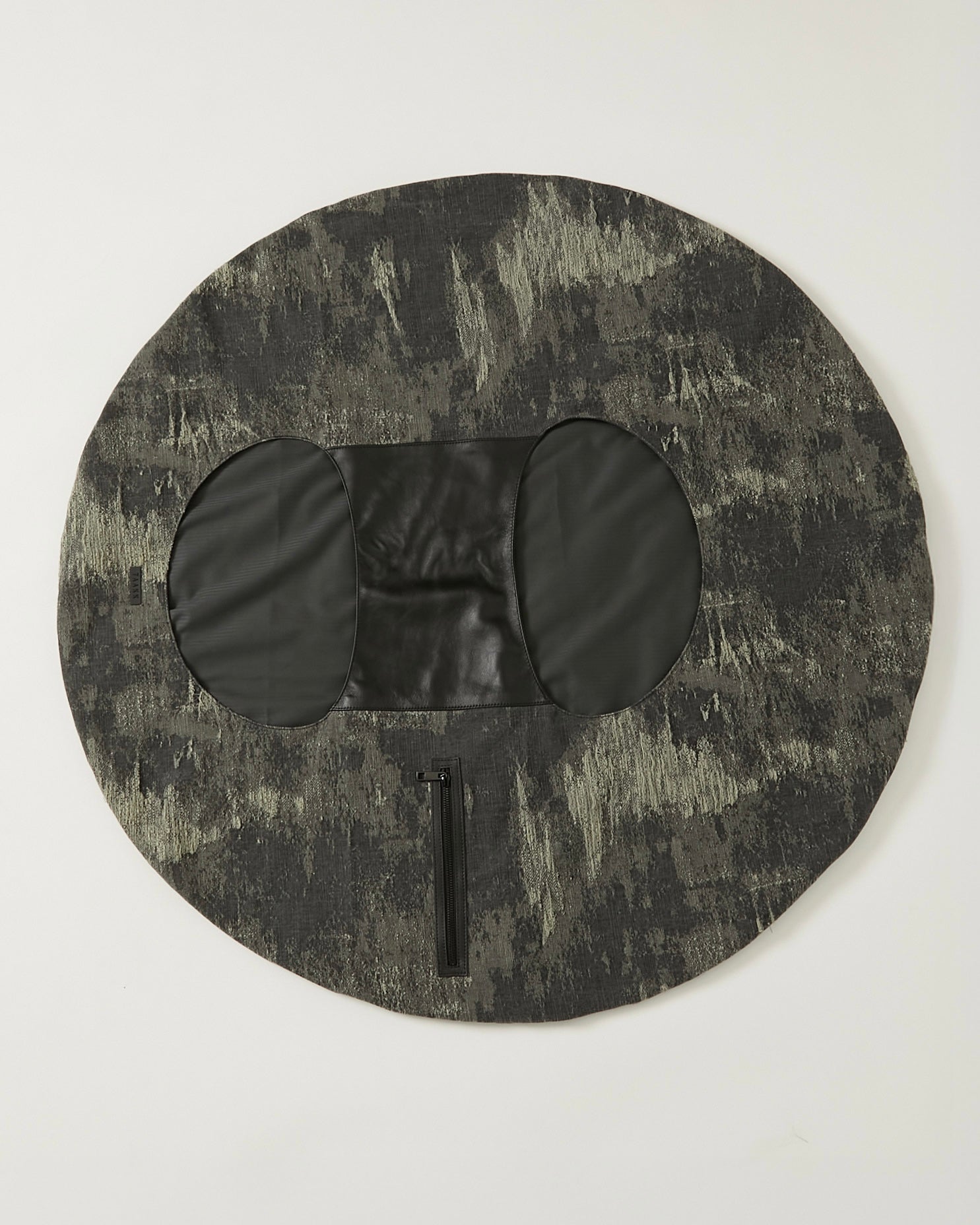 平面の円形から、持ち上げると立体的なバッグに変形するユニークなデザイン。身体に沿って自然にドレープが生まれ、ミニマルな構造ながら彫刻的な存在感を放つ。素材切り替えもポイントで、機能性と視覚的な変化を両立。