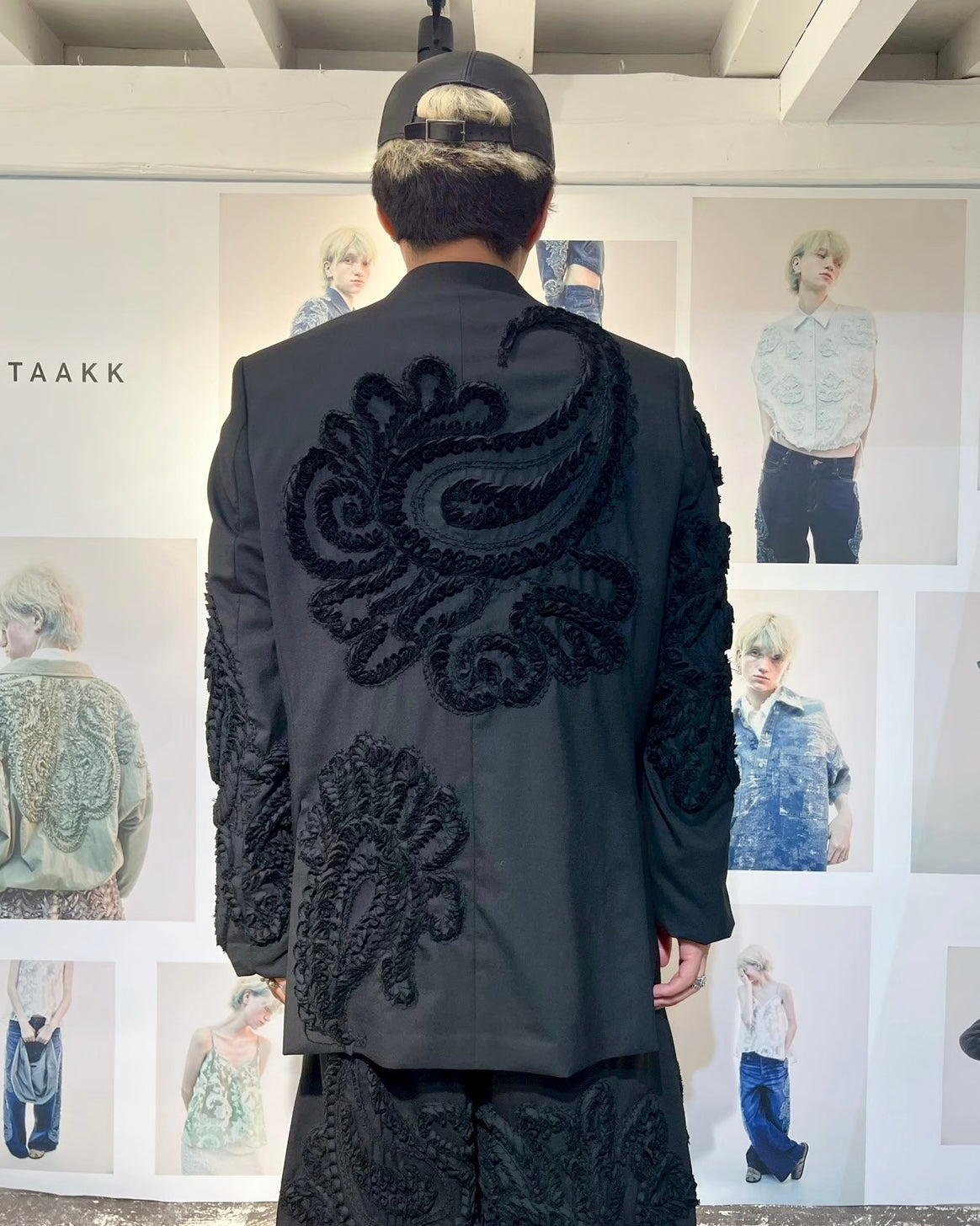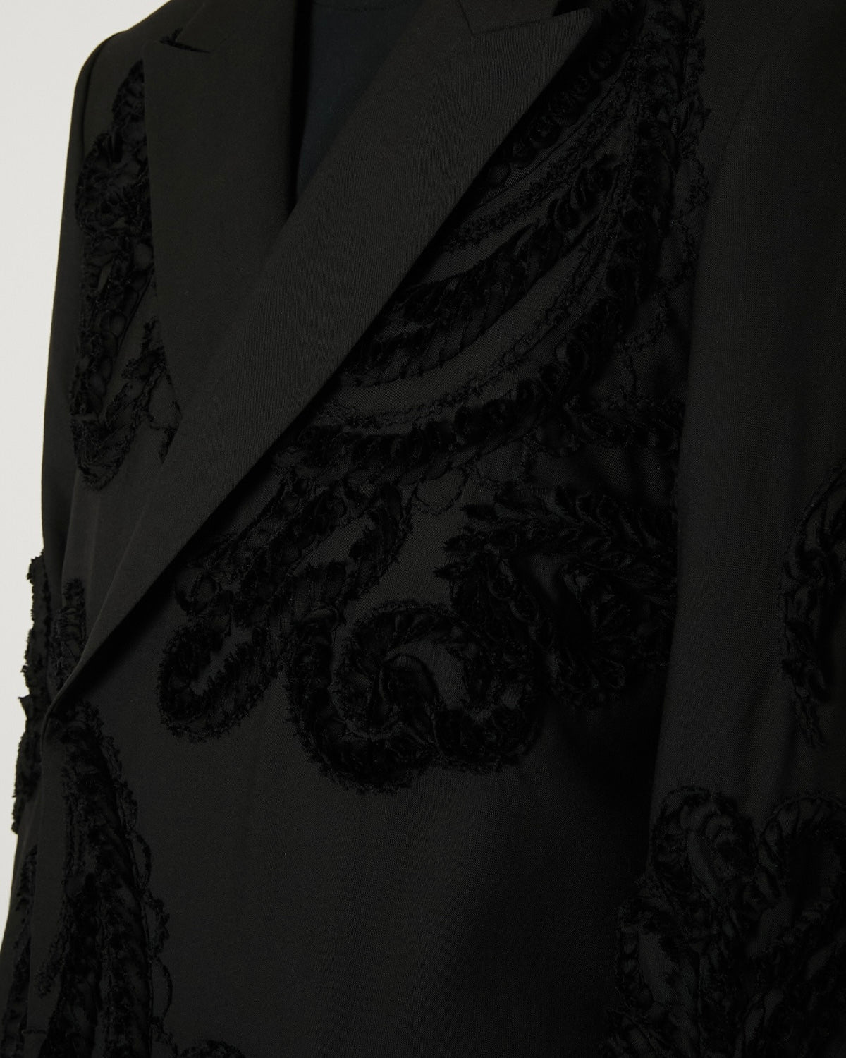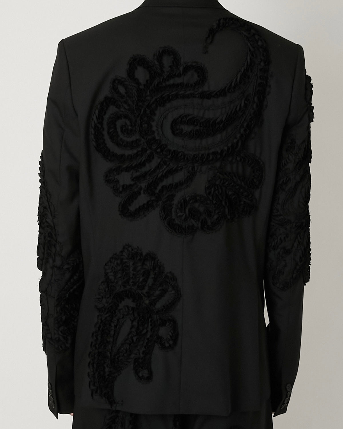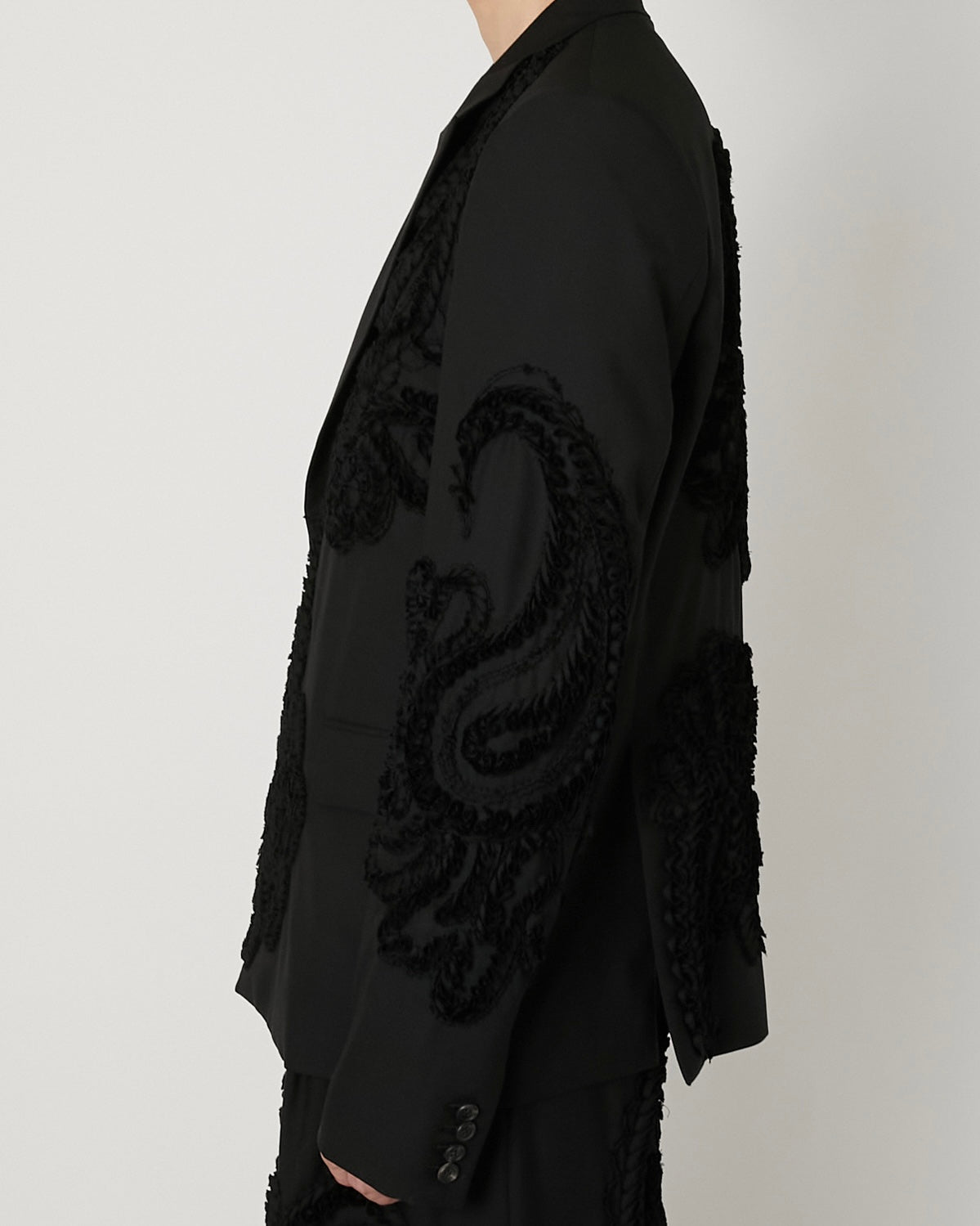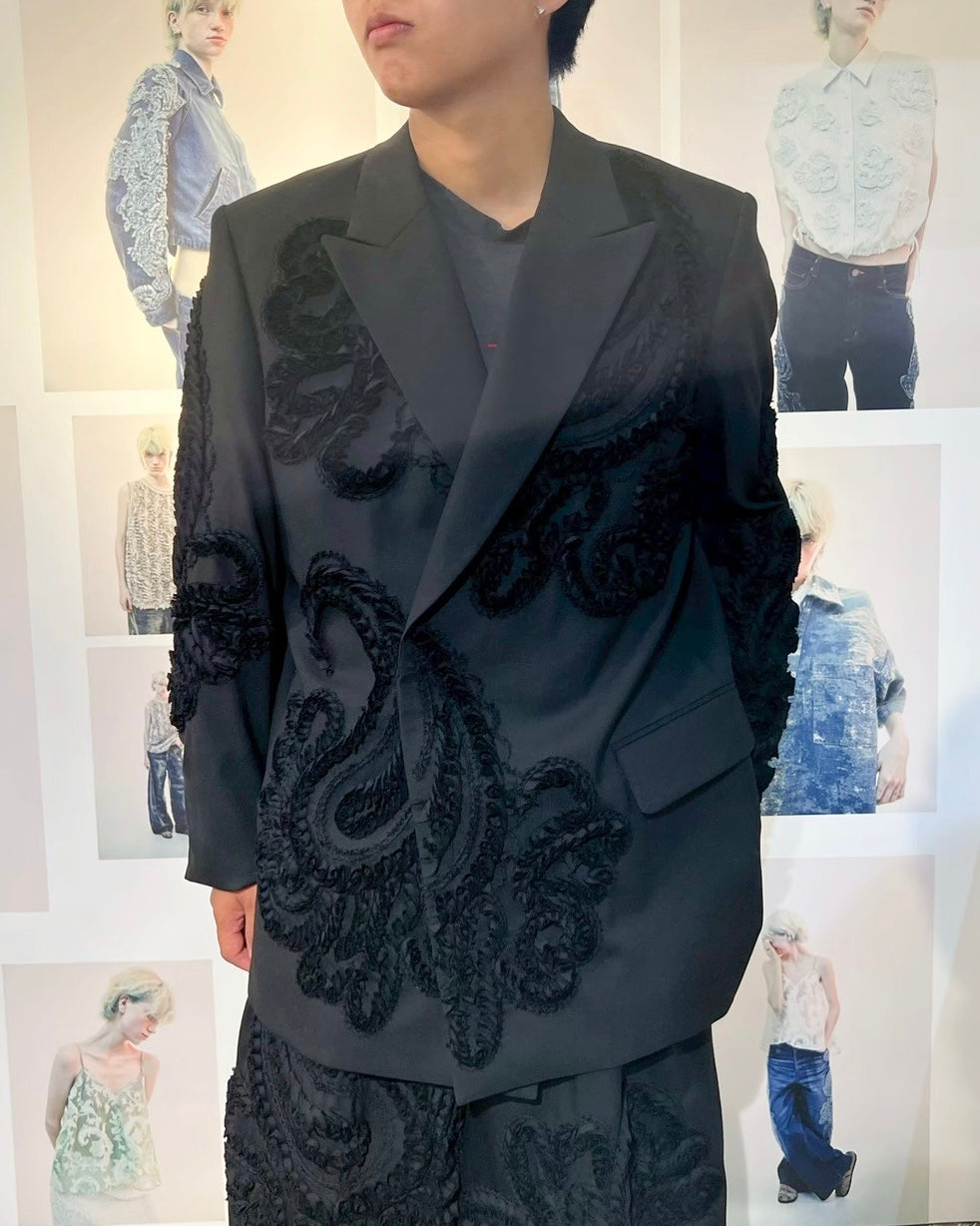 スーパー100’sの上質なウールに、彫刻的な立体刺繍を全面に施したテーラードジャケット。 細く裁断したウールテープを一針一針縫い留めることで生まれる刺繍は、布の表面に陰影と奥行きを与え、服そのものを一つの彫刻として再構築しています。 クラシックなテーラリングとクラフトの実験が交差する、TAAKKを象徴する一着。