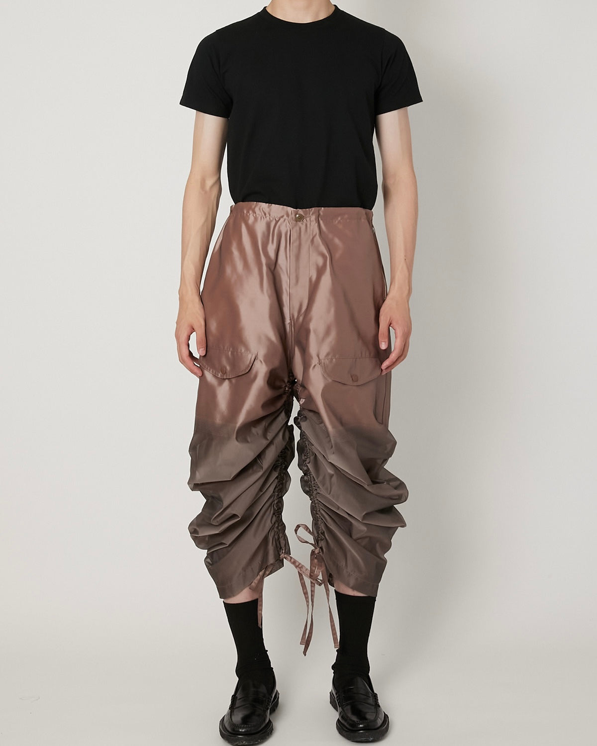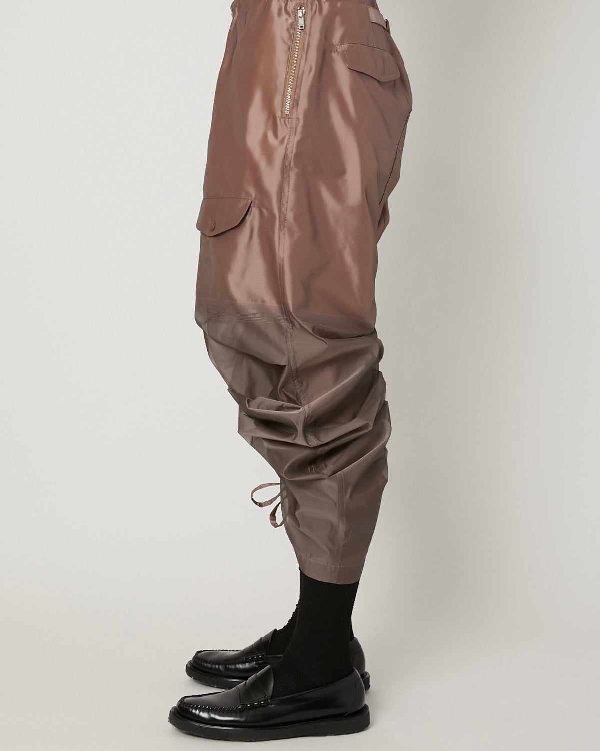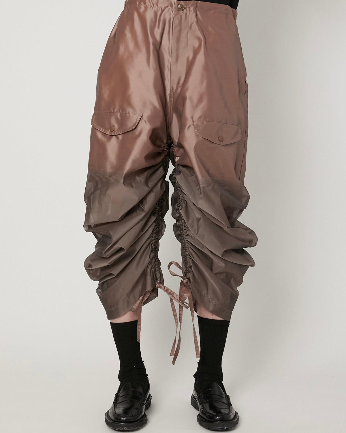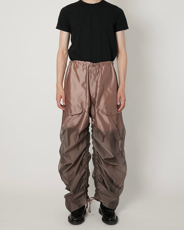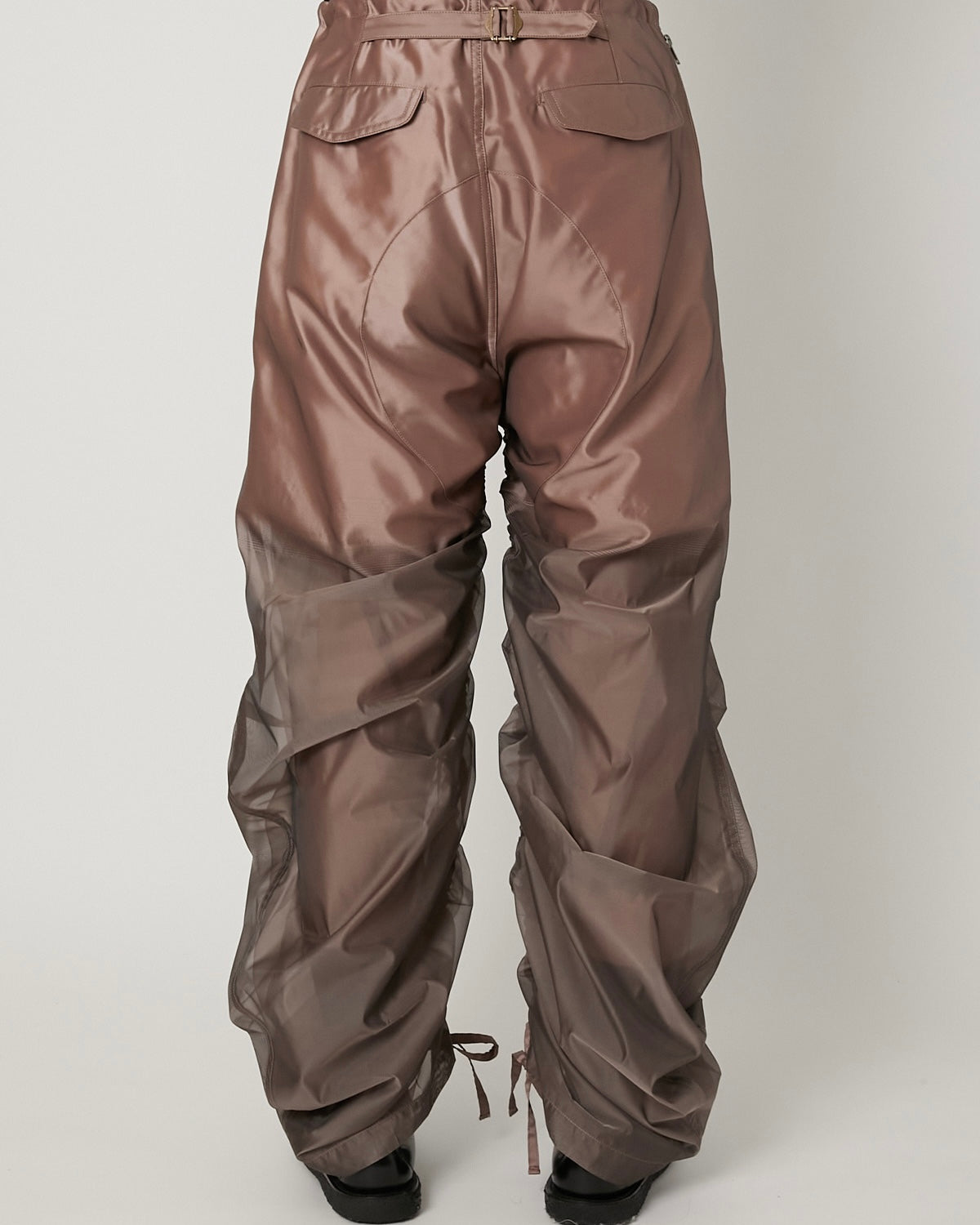 TAAKKならではの特徴のあるMA-1素材で仕立てたパラシュートパンツ。 上部は光沢感のある生地、裾に向かって徐々にシアー素材へと切り替わり、軽やかな透け感を生み出しています。 ドローコードでシルエットの調整も可能で、スタイリングに合わせて自在に表情を変えられる一本です