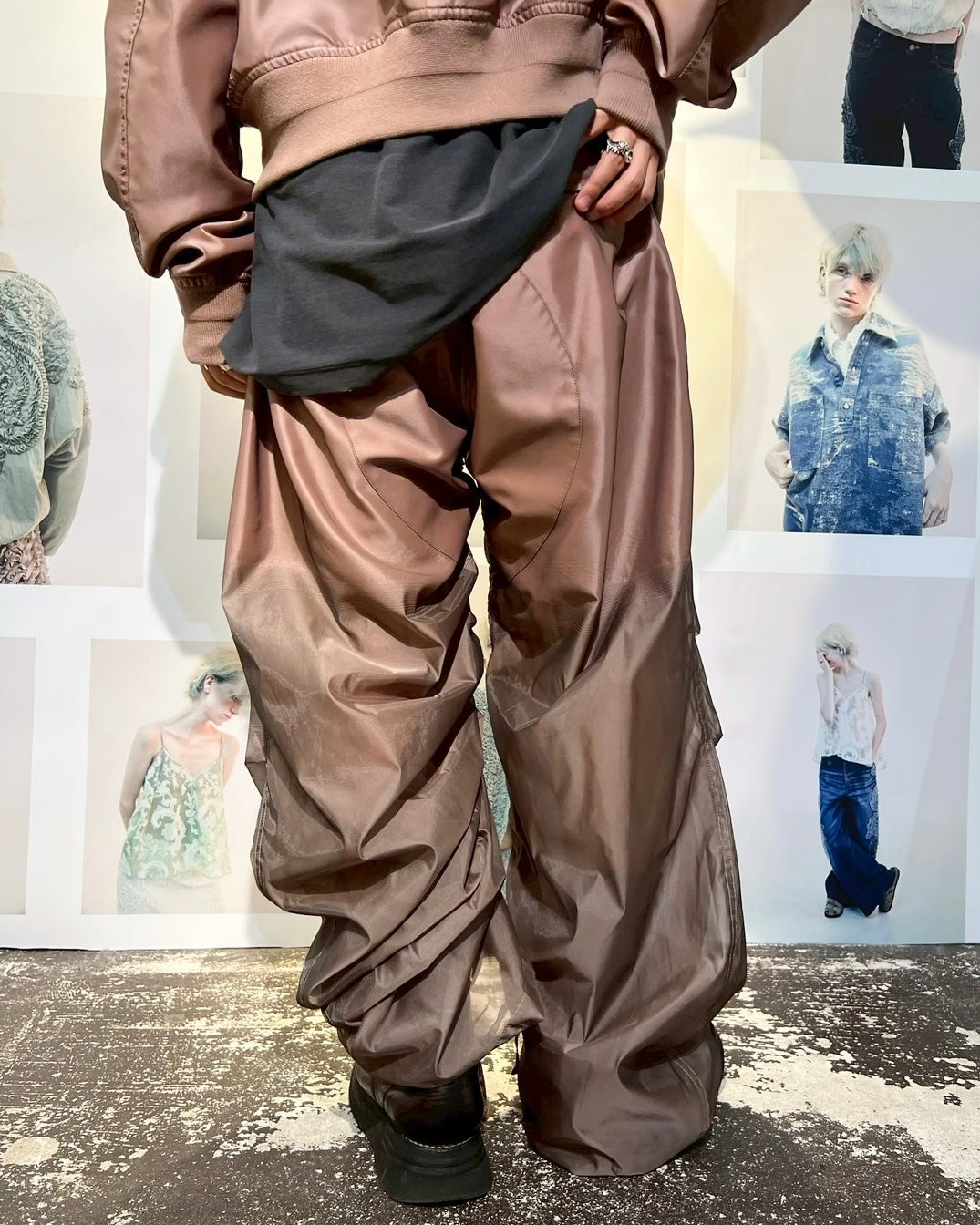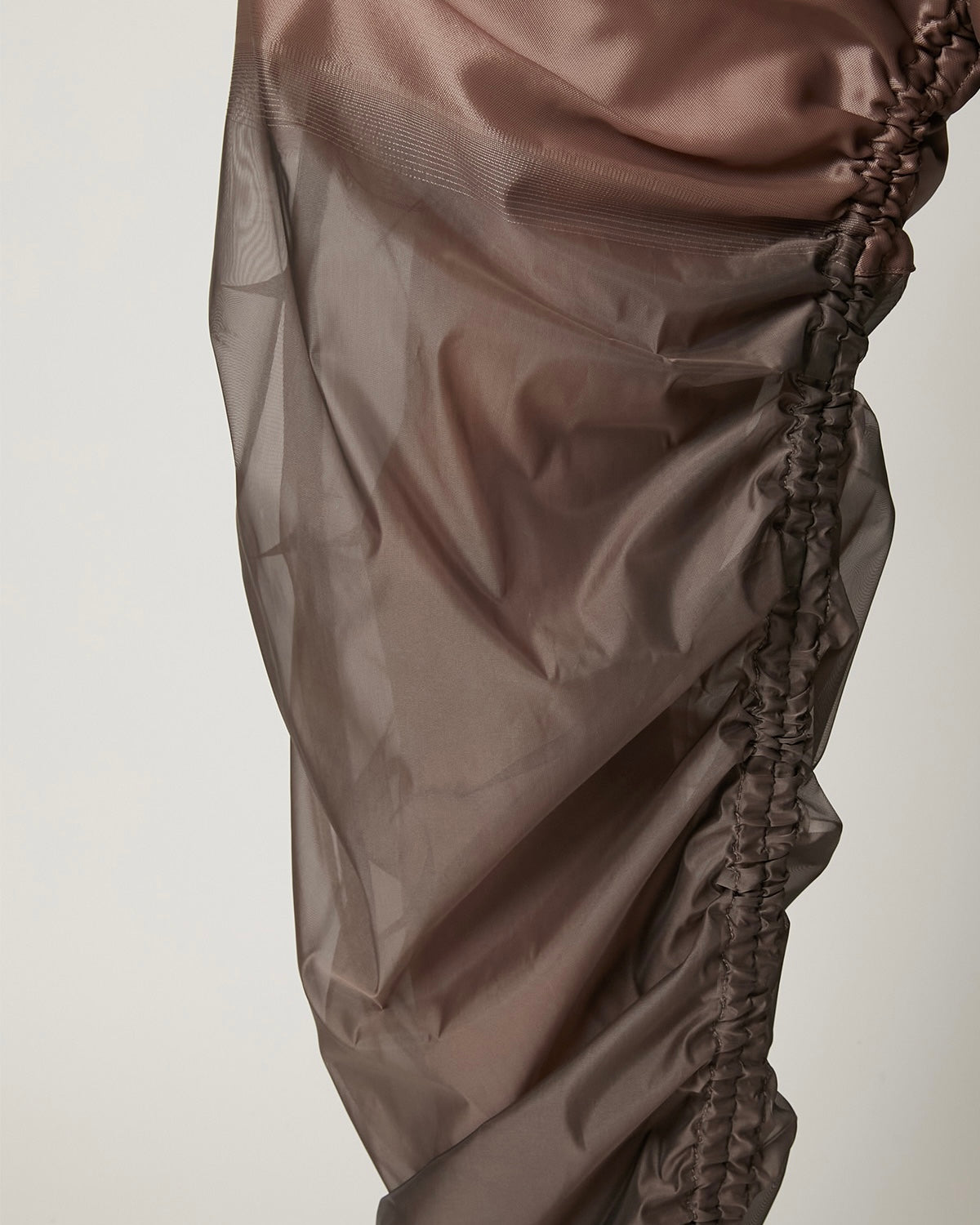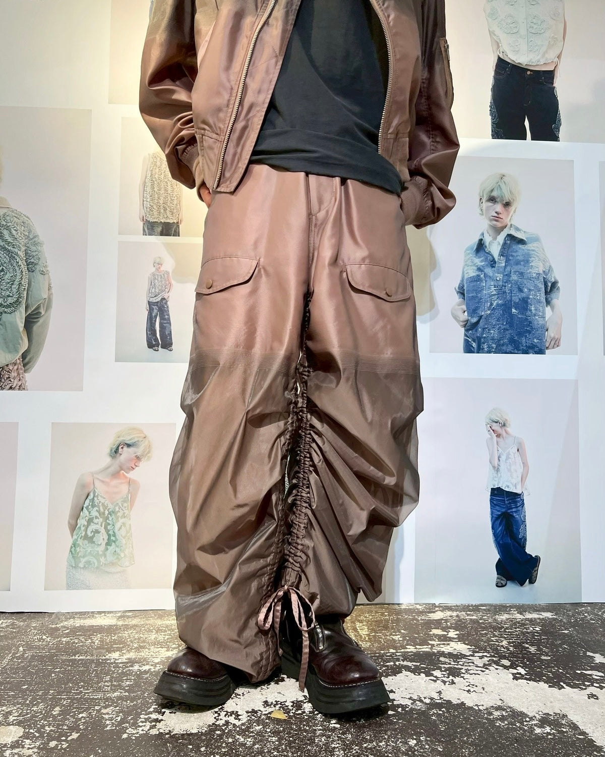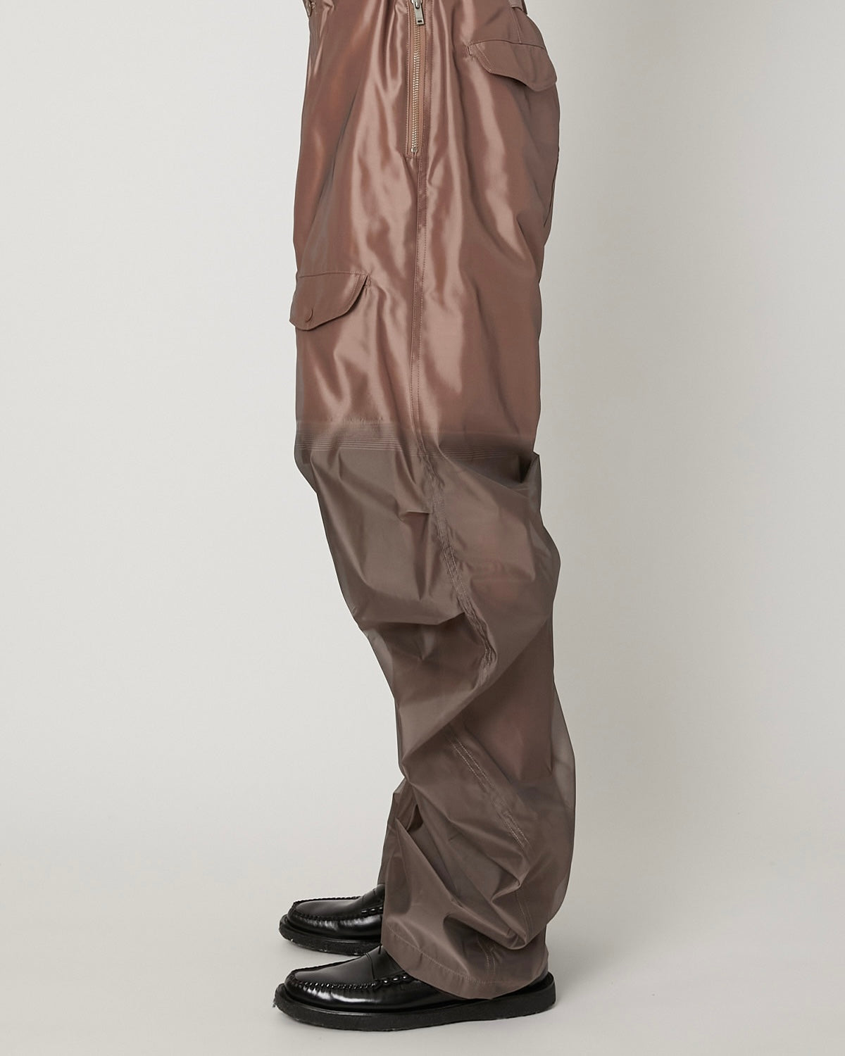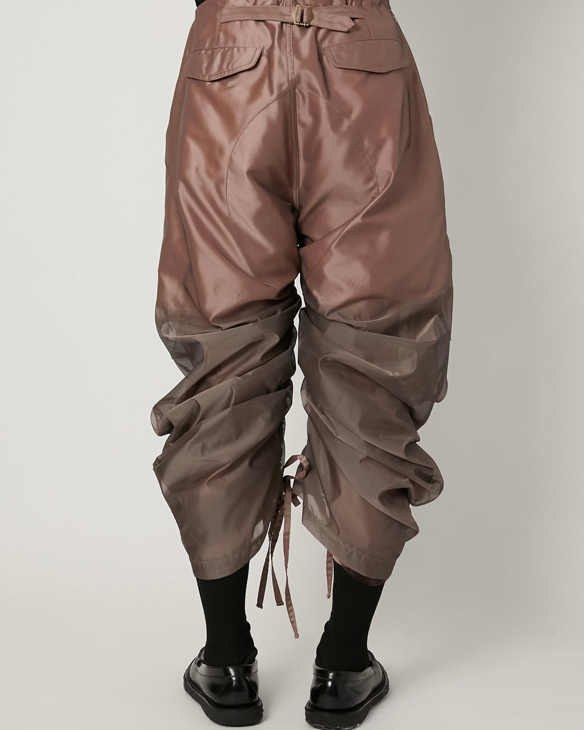 TAAKKならではの特徴のあるMA-1素材で仕立てたパラシュートパンツ。 上部は光沢感のある生地、裾に向かって徐々にシアー素材へと切り替わり、軽やかな透け感を生み出しています。 ドローコードでシルエットの調整も可能で、スタイリングに合わせて自在に表情を変えられる一本です
