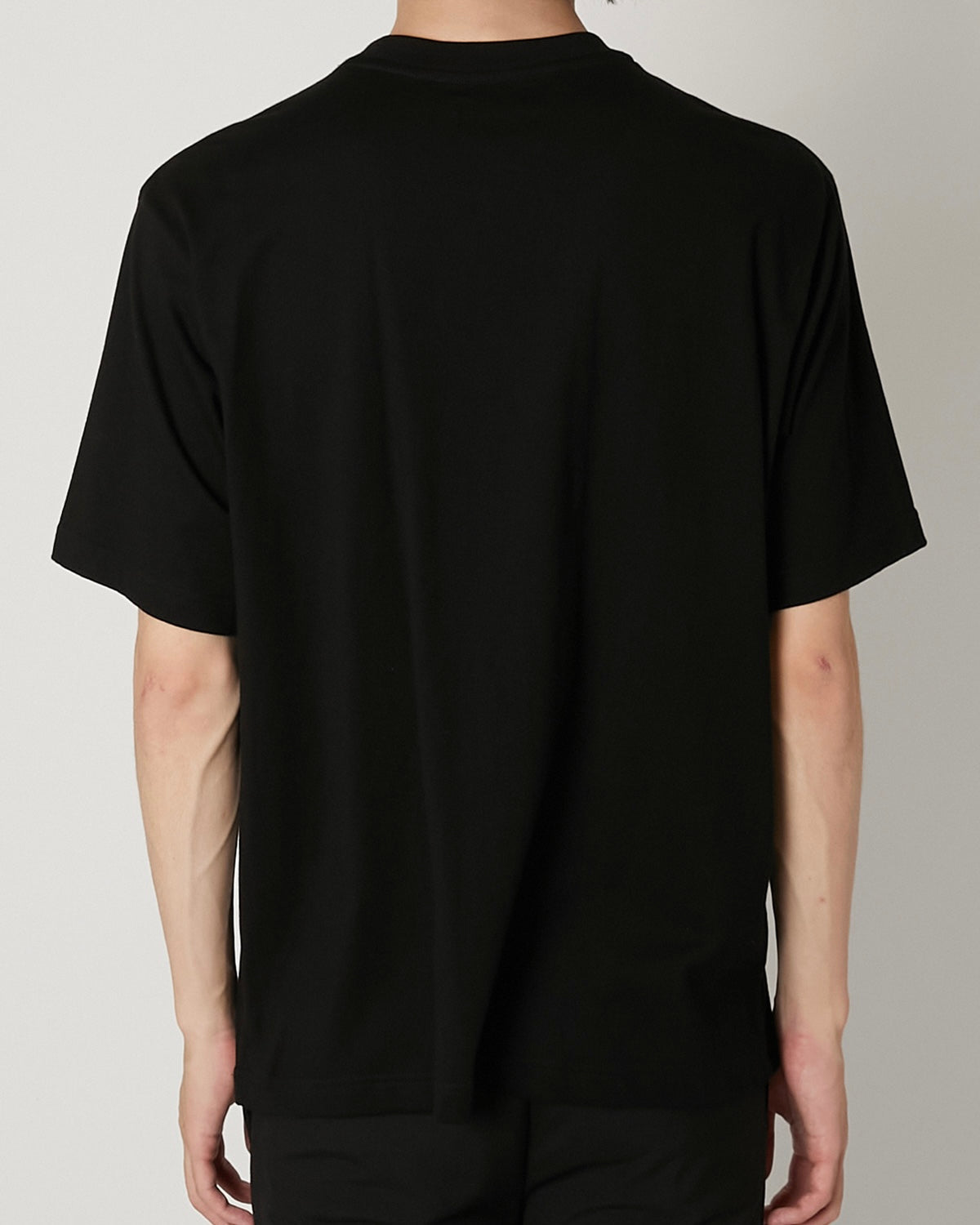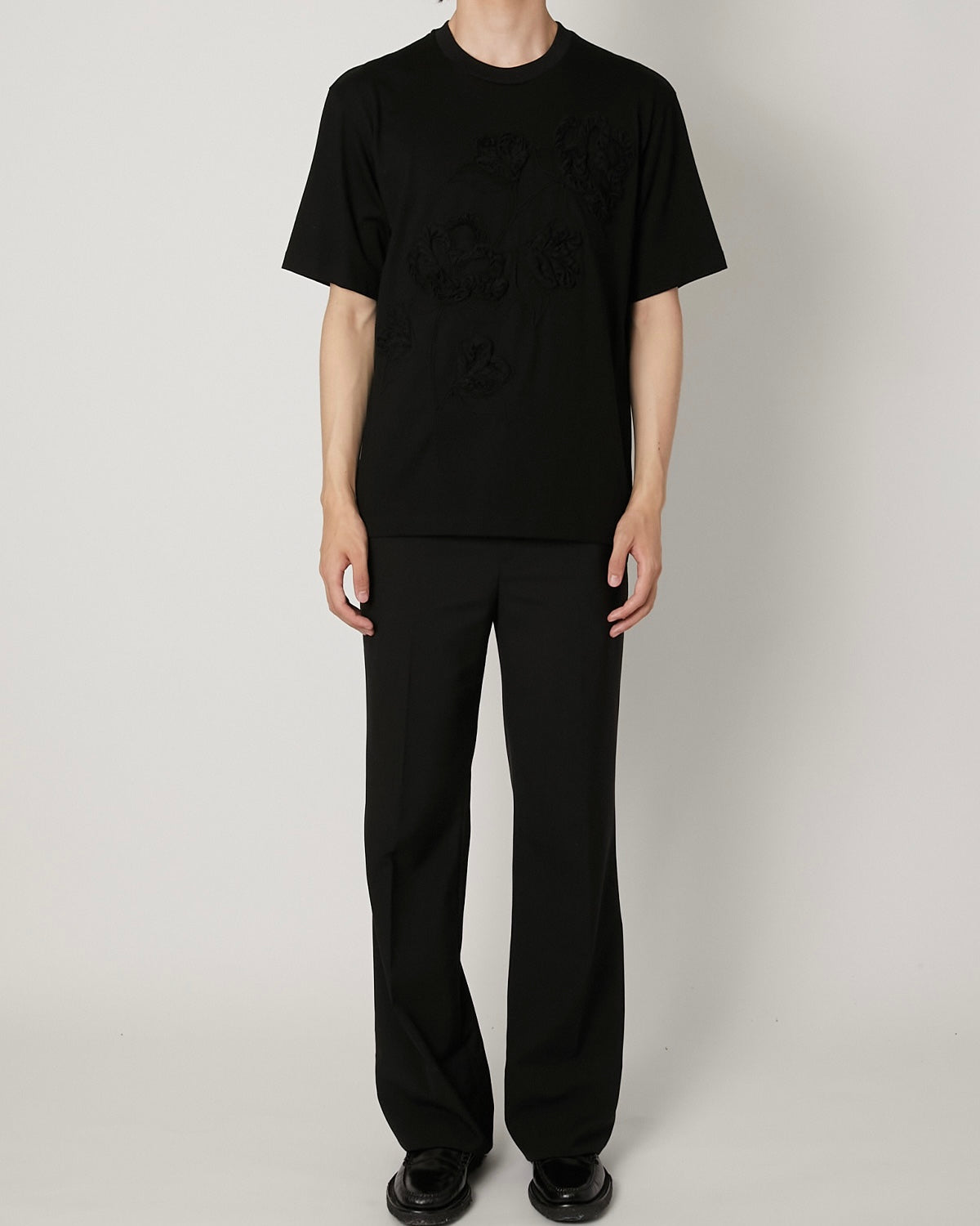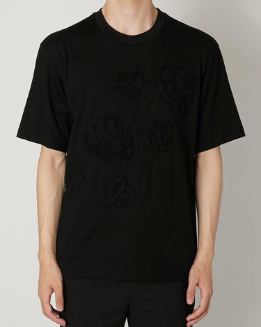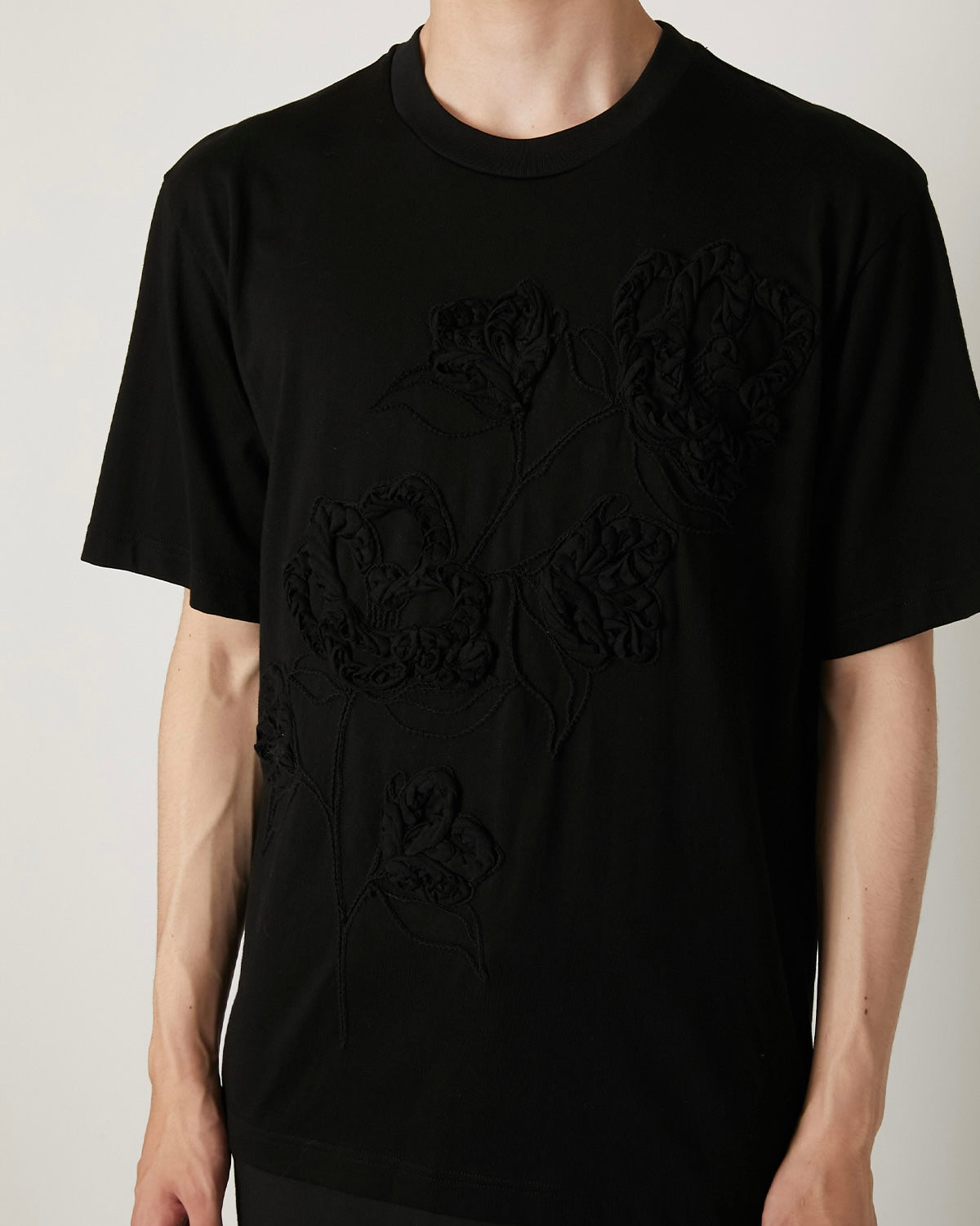 共生地を細かくバイアス方向に裁断し、一本一本を繋ぎ合わせて刺繍した図案は、布に彫刻を施すかのような立体感を生む。 繊細で途方もない手間を要するこの技術を、あえてTシャツという日常的なアイテムに落とし込んだ。 ベーシックな形に潜むアートピースとしての側面。