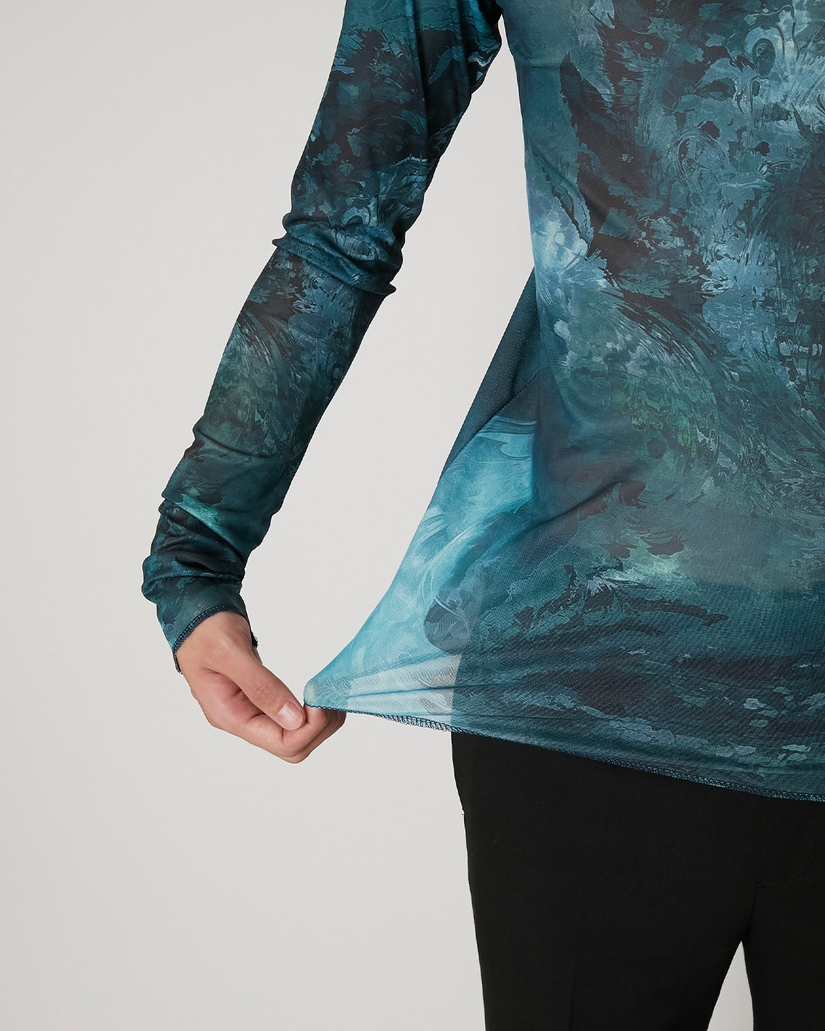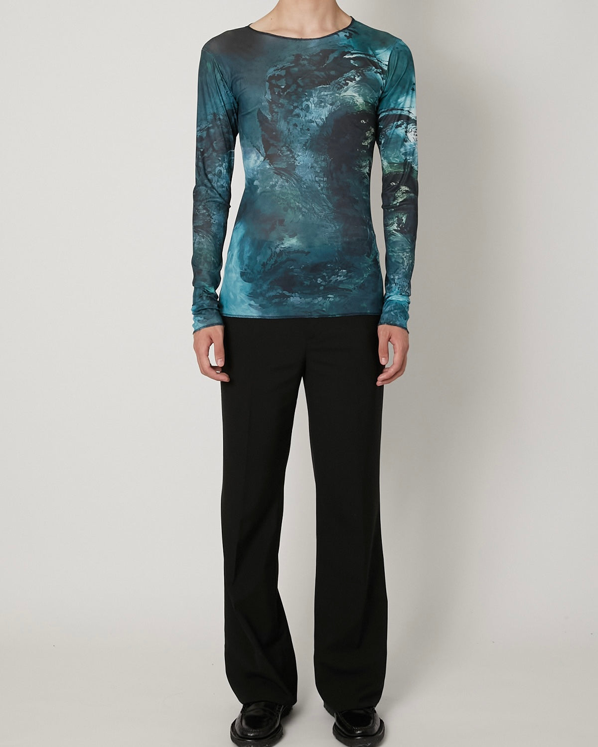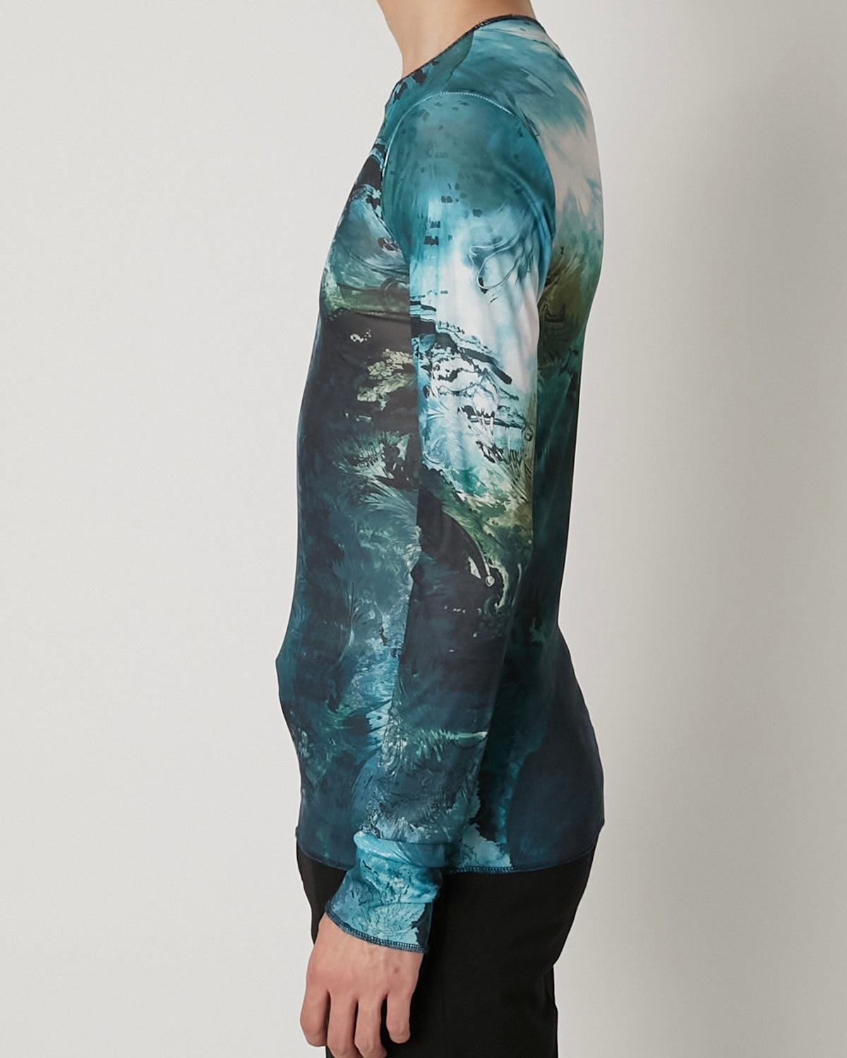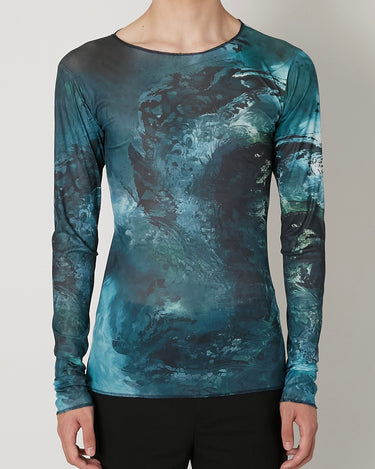 滑らかで艶やかなチュール素材に、ペイズリー柄がマーブリングのように溶け出した印象のアートワークをのせたT-シャツ 伝統的なモチーフを解体し、流動的に再構築することで、静と動が共存する視覚的なテキスタイルに仕上げています。 軽やかな素材感と抽象的なグラフィックが、1枚でスタイルを完成させる存在感を持った一着。