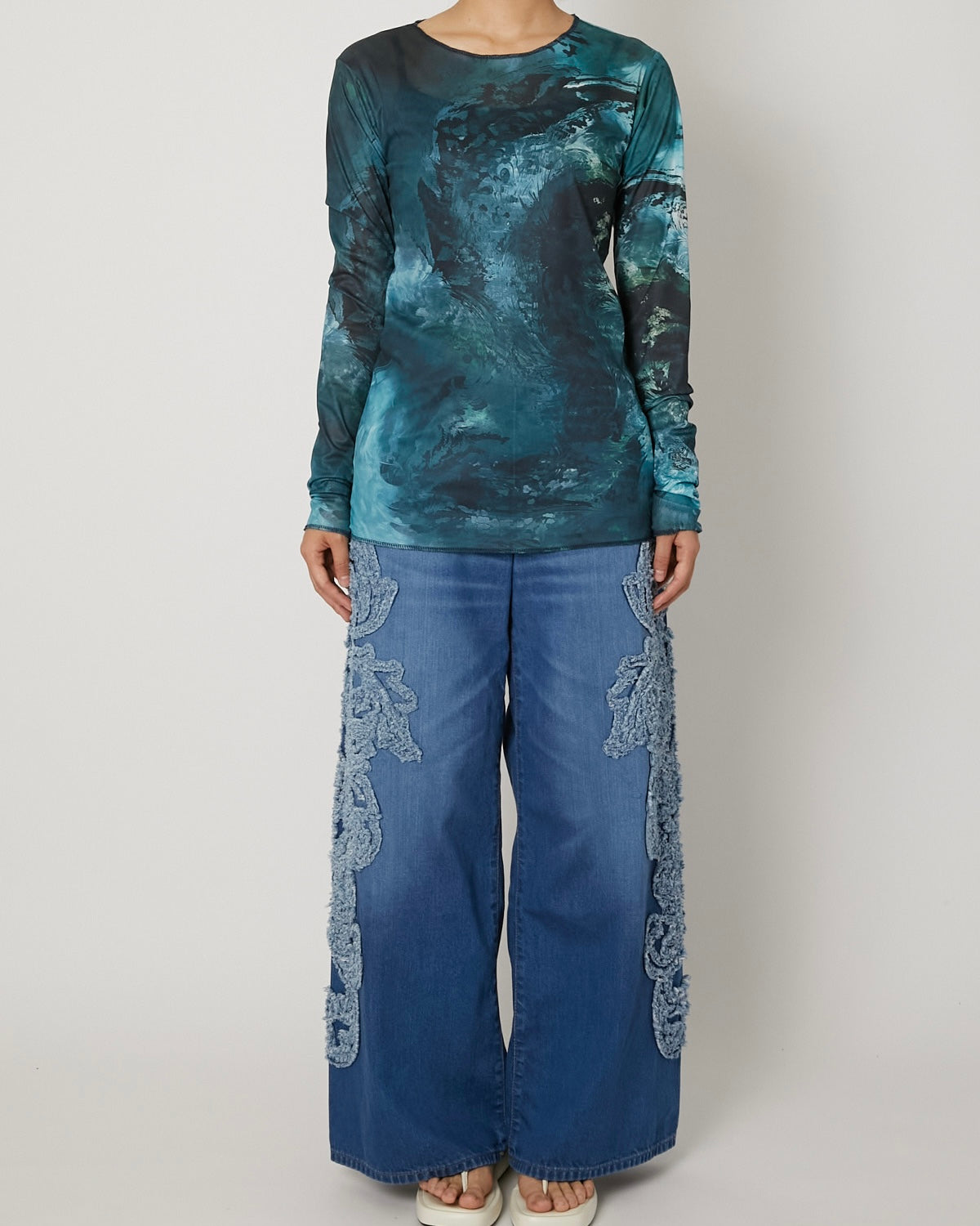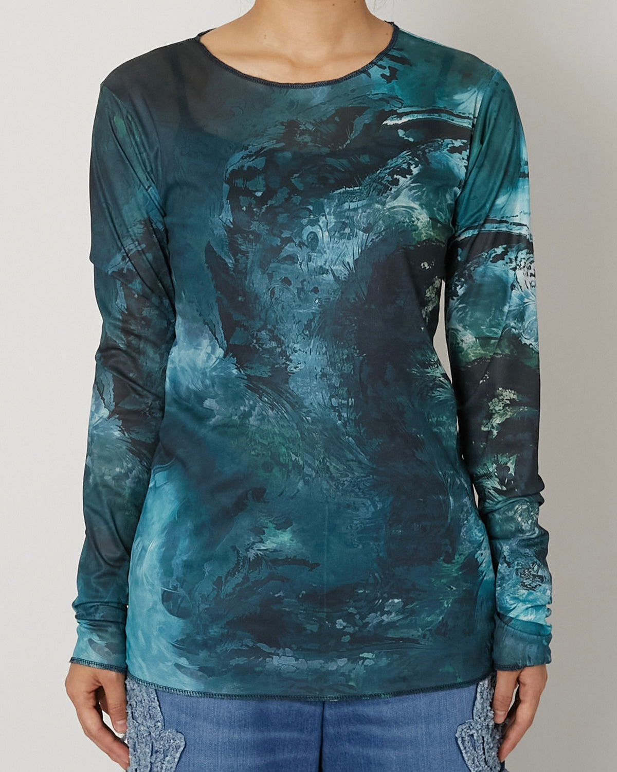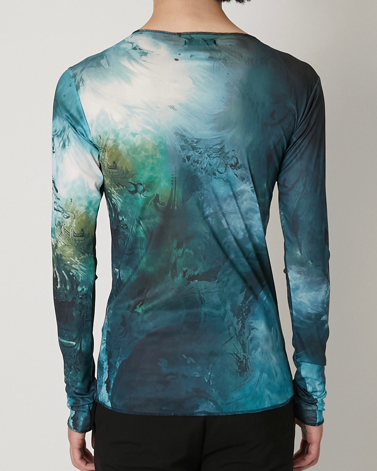滑らかで艶やかなチュール素材に、ペイズリー柄がマーブリングのように溶け出した印象のアートワークをのせたT-シャツ 伝統的なモチーフを解体し、流動的に再構築することで、静と動が共存する視覚的なテキスタイルに仕上げています。 軽やかな素材感と抽象的なグラフィックが、1枚でスタイルを完成させる存在感を持った一着。
