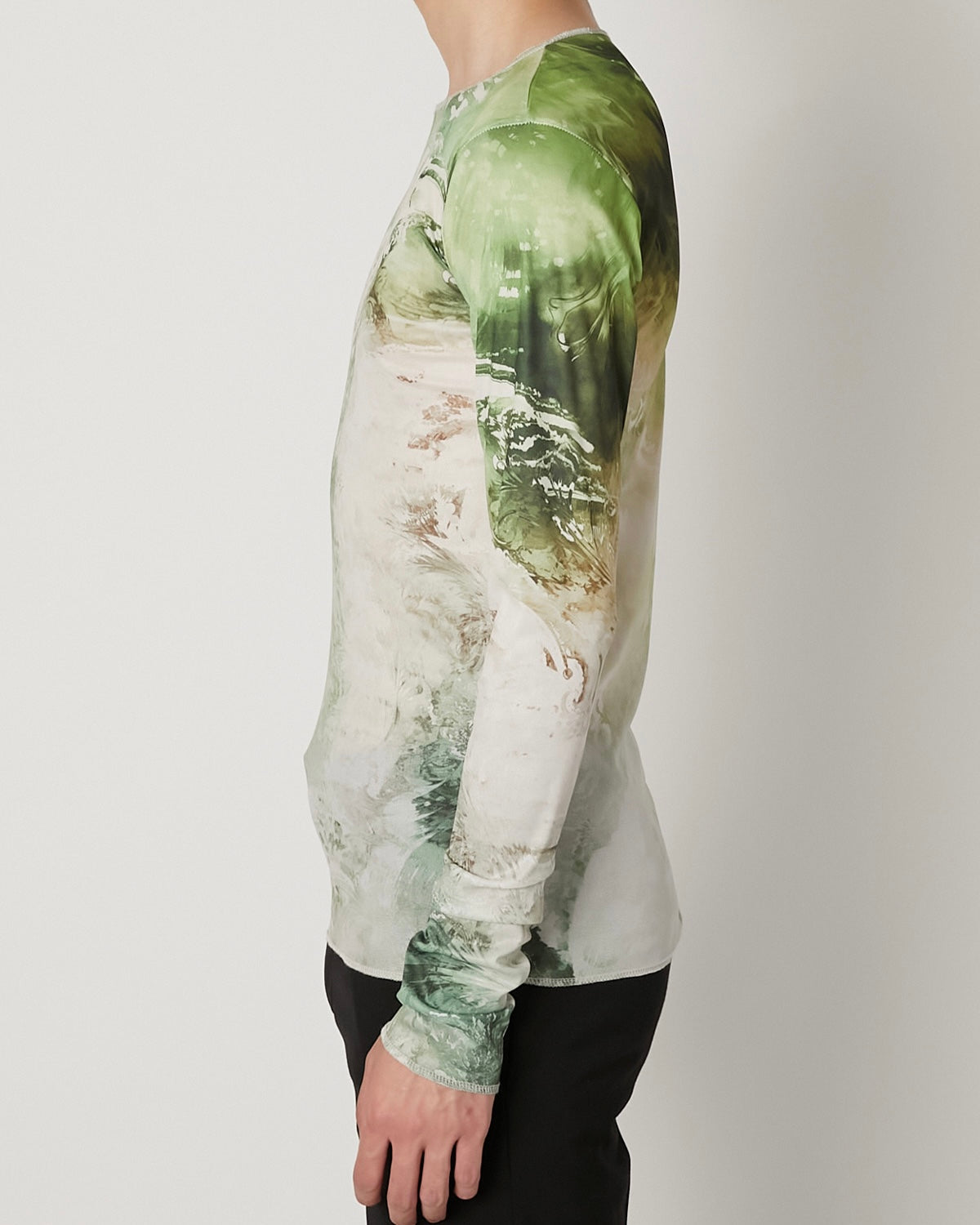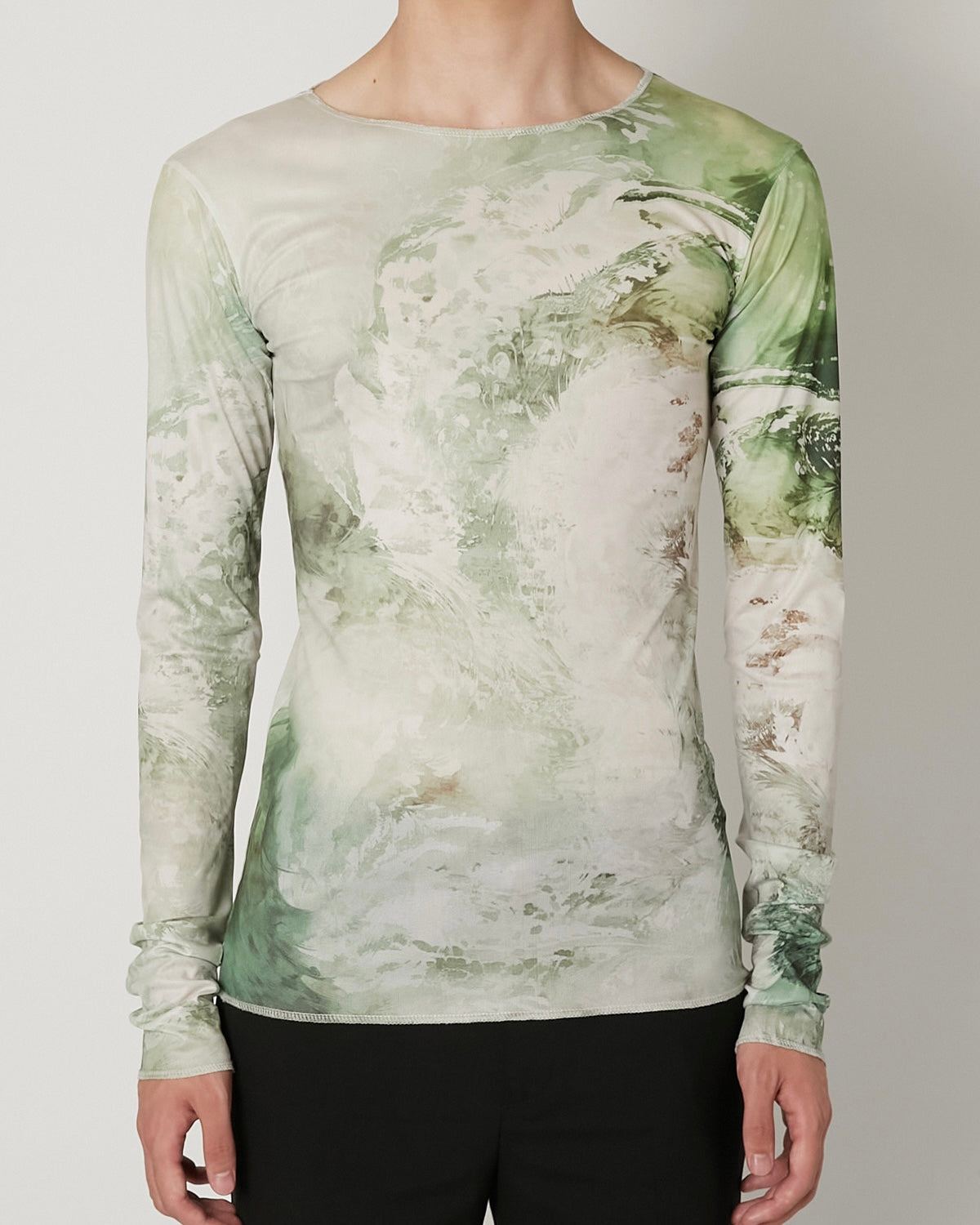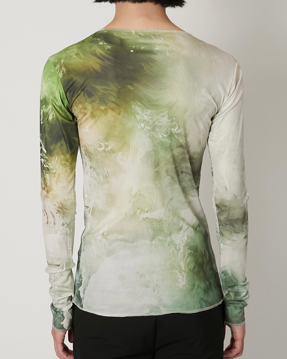 滑らかで艶やかなチュール素材に、ペイズリー柄がマーブリングのように溶け出した印象のアートワークをのせたT-シャツ 伝統的なモチーフを解体し、流動的に再構築することで、静と動が共存する視覚的なテキスタイルに仕上げています。 軽やかな素材感と抽象的なグラフィックが、1枚でスタイルを完成させる存在感を持った一着。