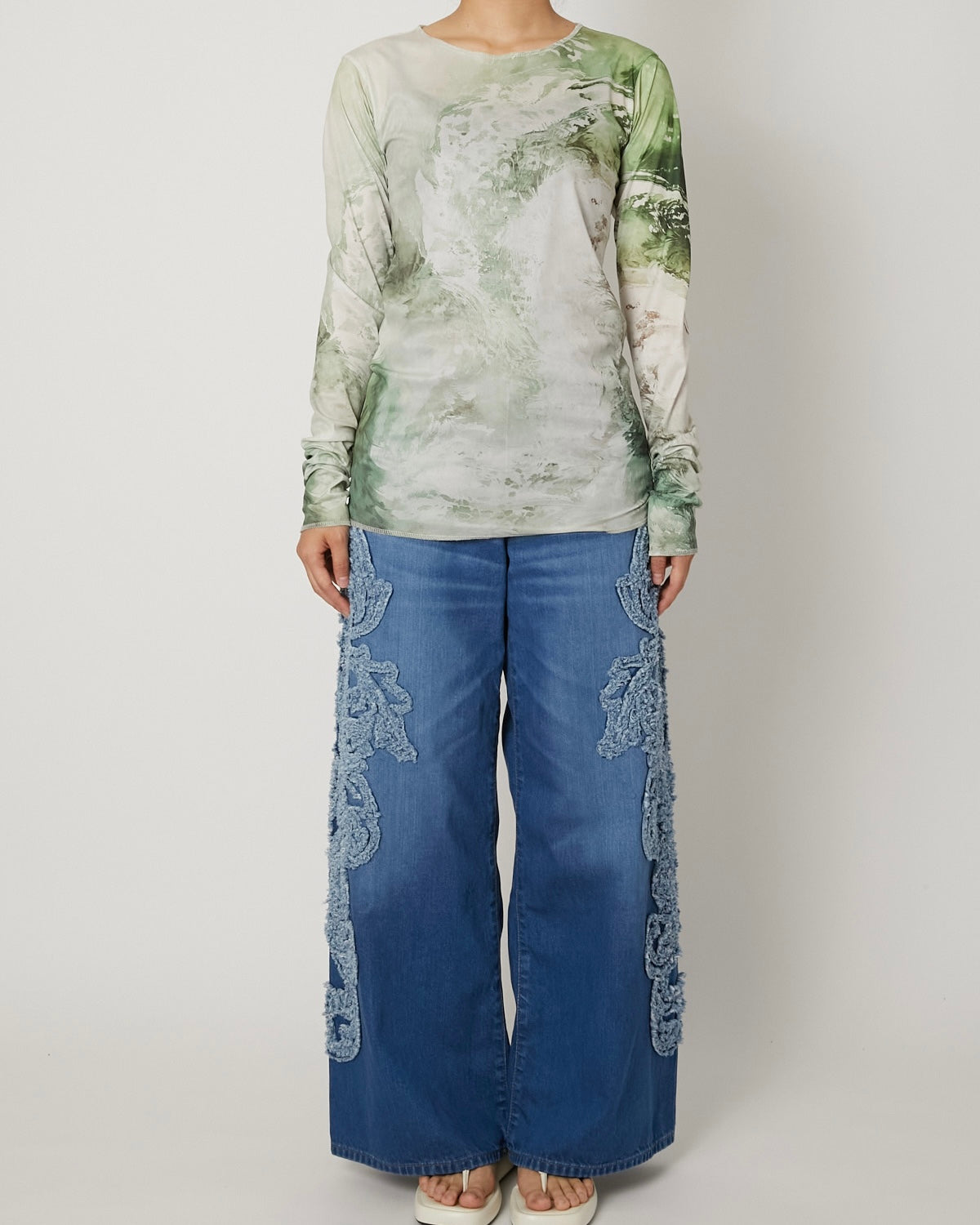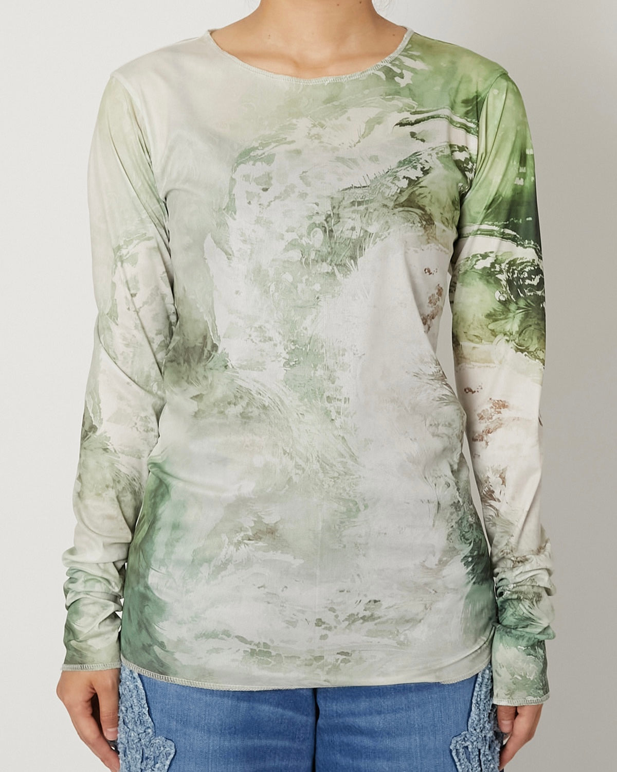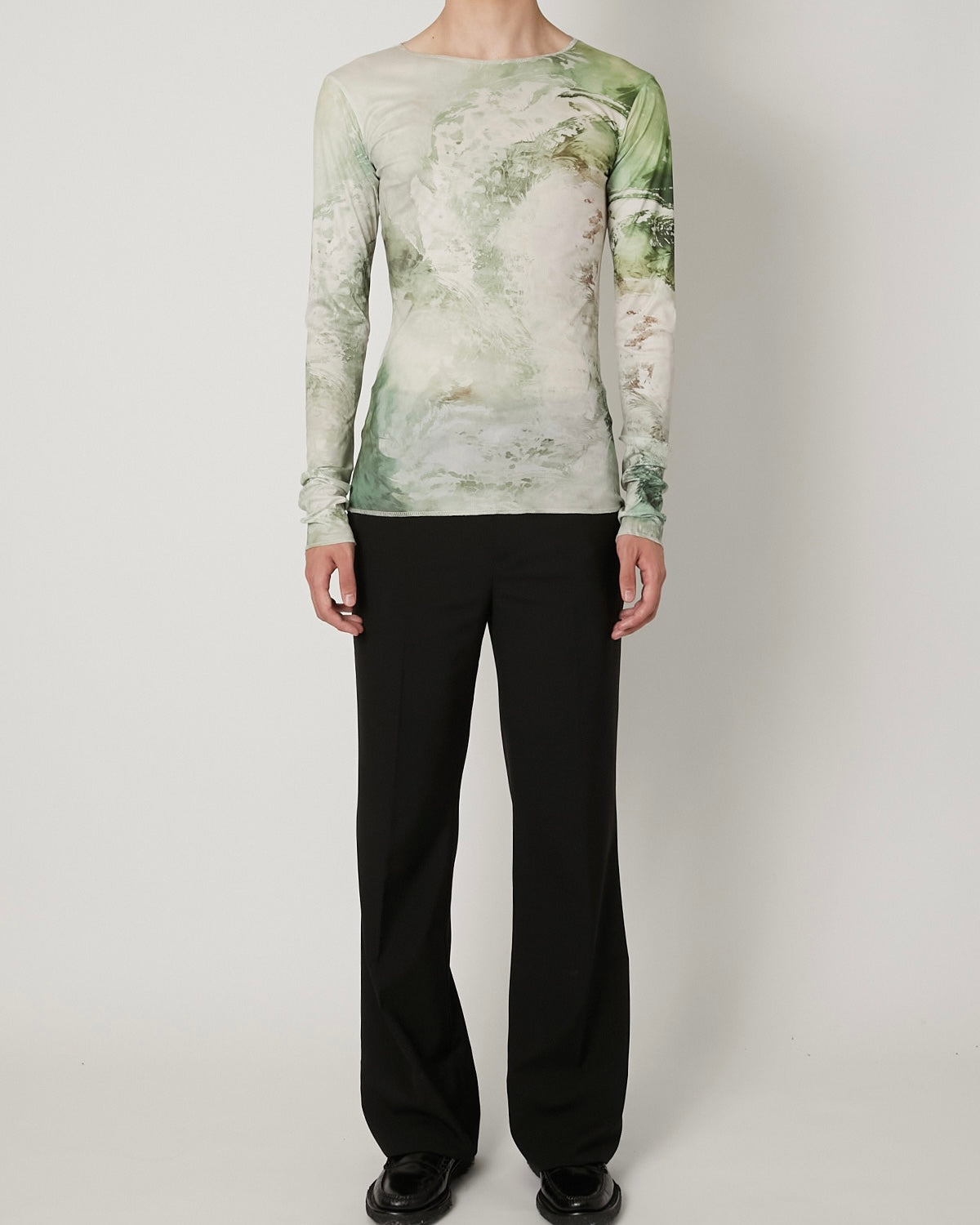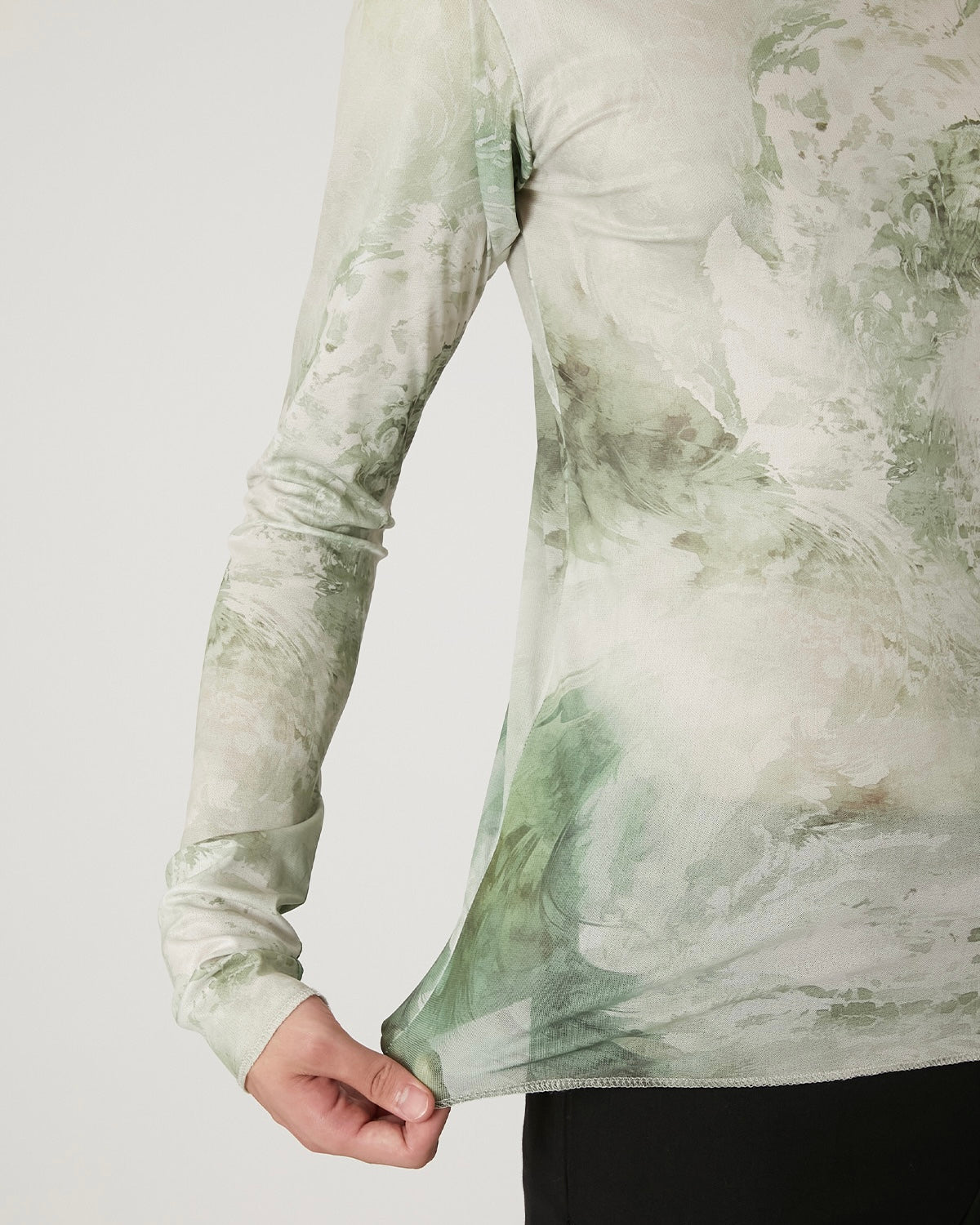 滑らかで艶やかなチュール素材に、ペイズリー柄がマーブリングのように溶け出した印象のアートワークをのせたT-シャツ 伝統的なモチーフを解体し、流動的に再構築することで、静と動が共存する視覚的なテキスタイルに仕上げています。 軽やかな素材感と抽象的なグラフィックが、1枚でスタイルを完成させる存在感を持った一着。