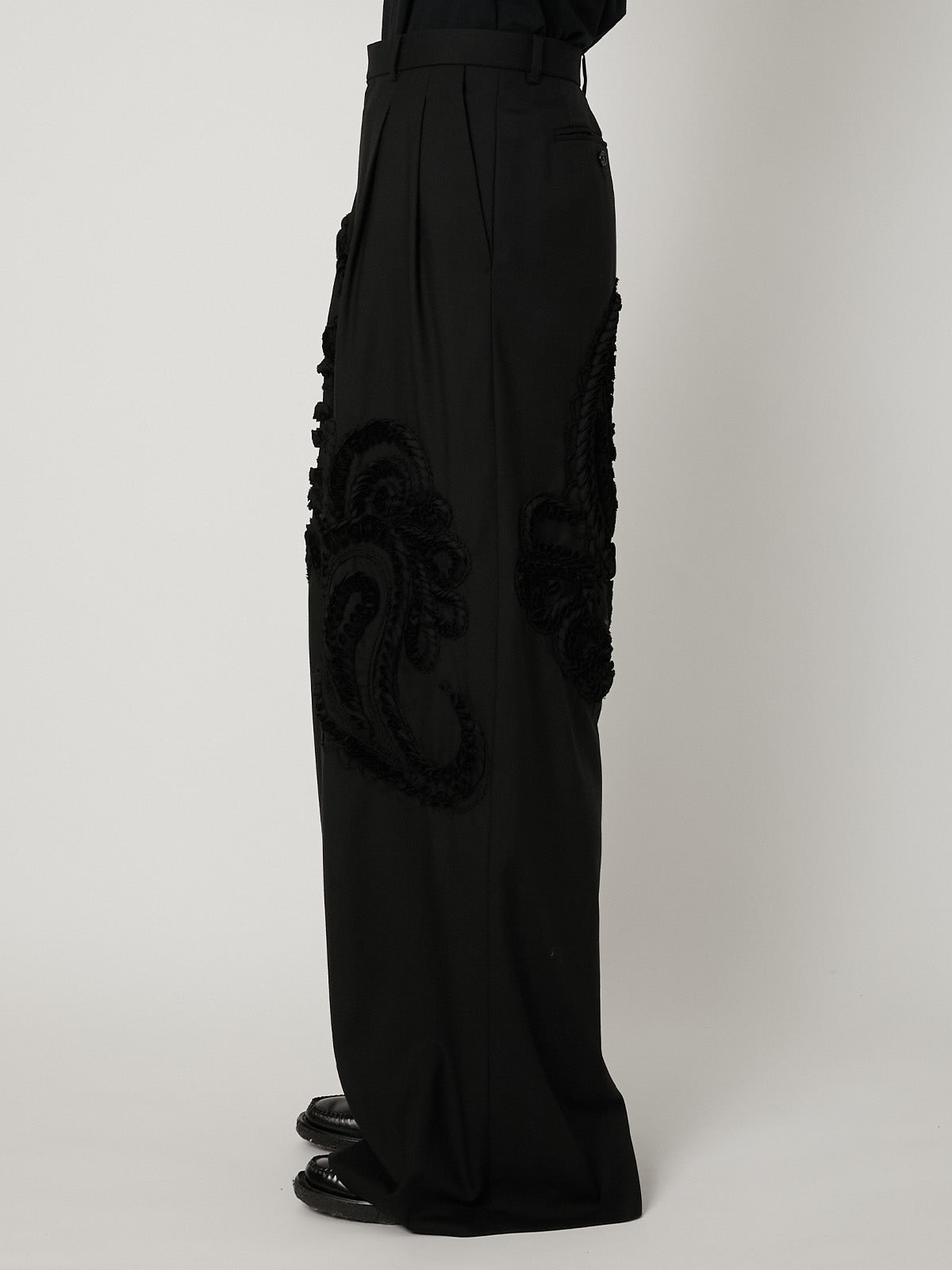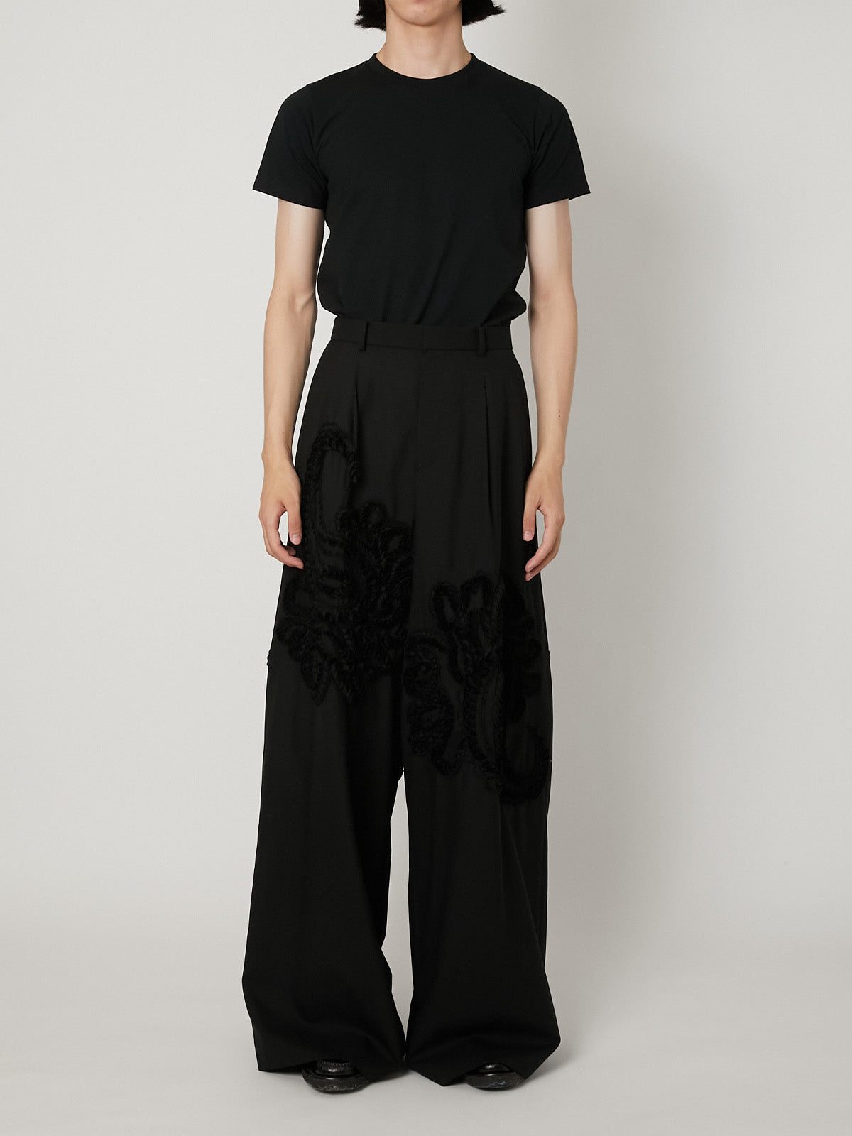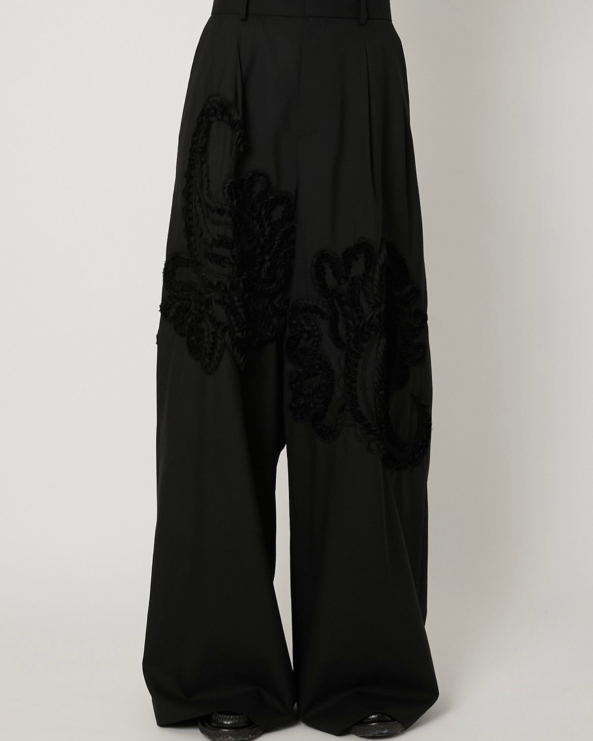 スーパー100’sの上質なウールに、彫刻的な立体刺繍を大胆に配置したロングワイドパンツ。 たっぷりと分量を取ったシルエットに、陰影と奥行きを生む刺繍が施されることで、パンツでありながら彫刻作品のような存在感を放ちます。 クラシックなテーラリングを再解釈した、TAAKKらしい構築的な一着です。