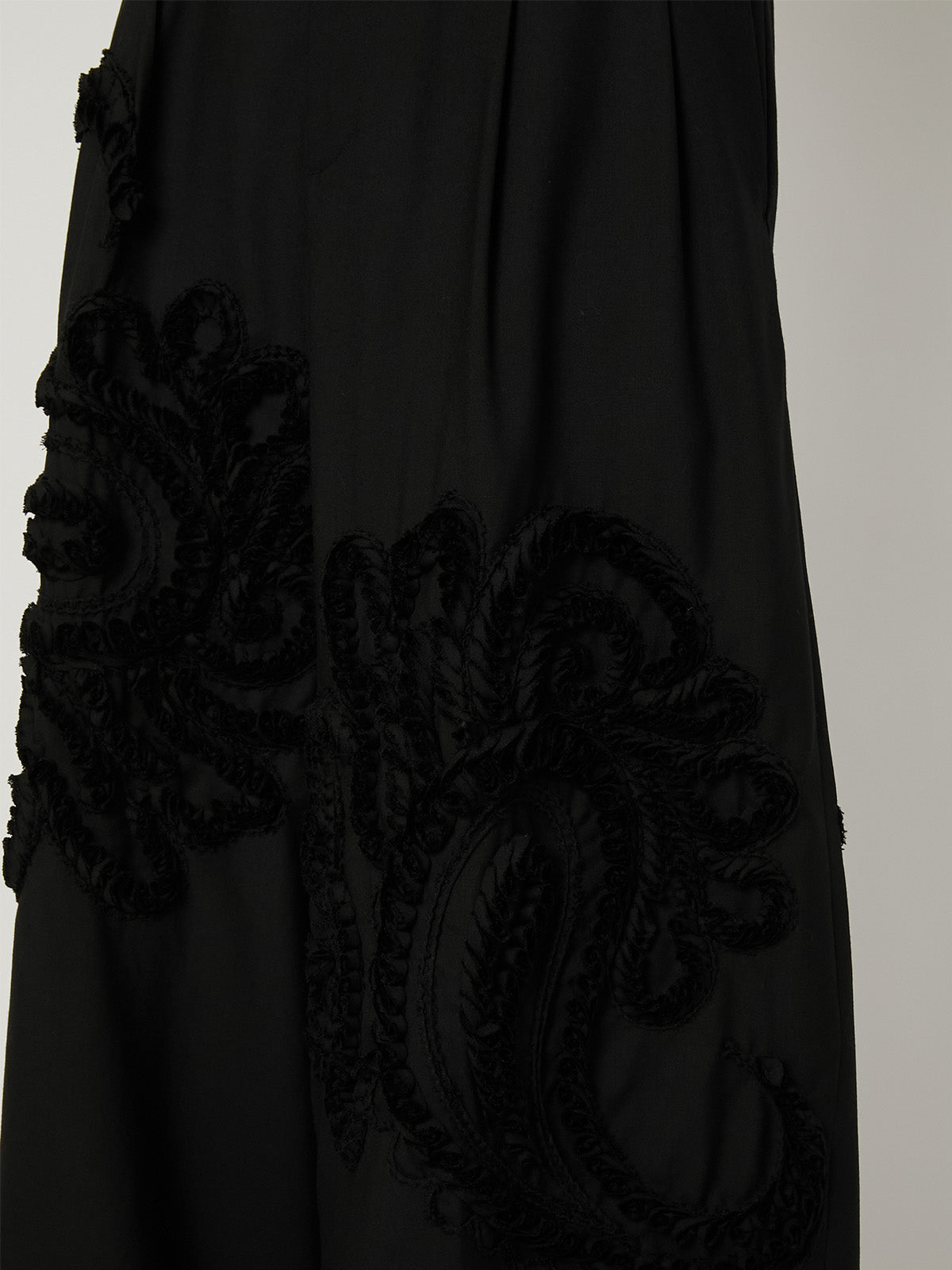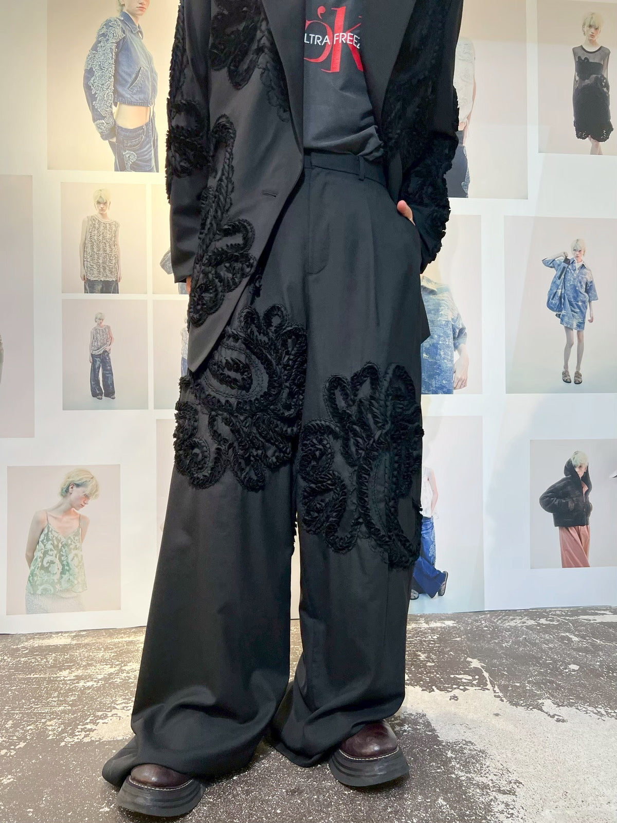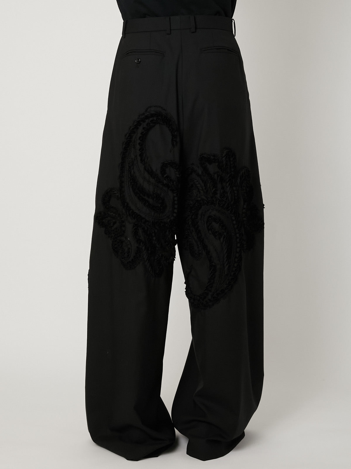 スーパー100’sの上質なウールに、彫刻的な立体刺繍を大胆に配置したロングワイドパンツ。 たっぷりと分量を取ったシルエットに、陰影と奥行きを生む刺繍が施されることで、パンツでありながら彫刻作品のような存在感を放ちます。 クラシックなテーラリングを再解釈した、TAAKKらしい構築的な一着です。