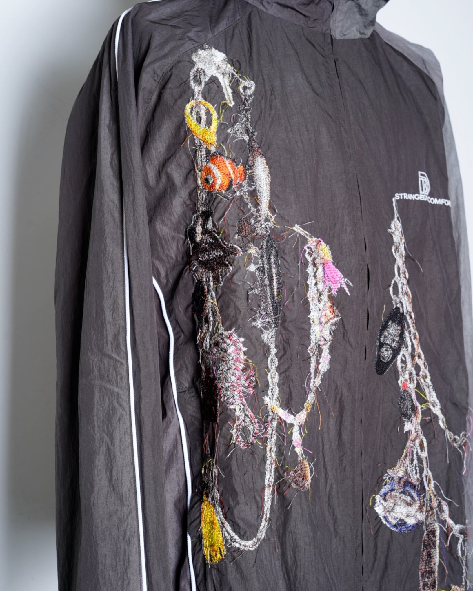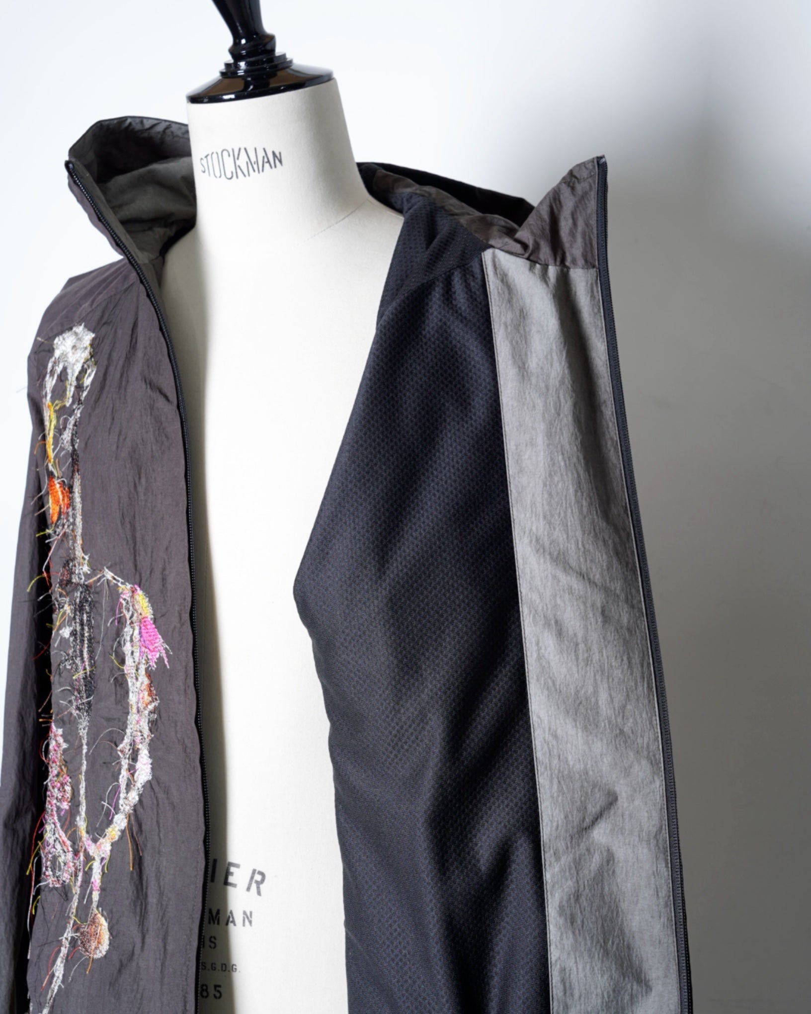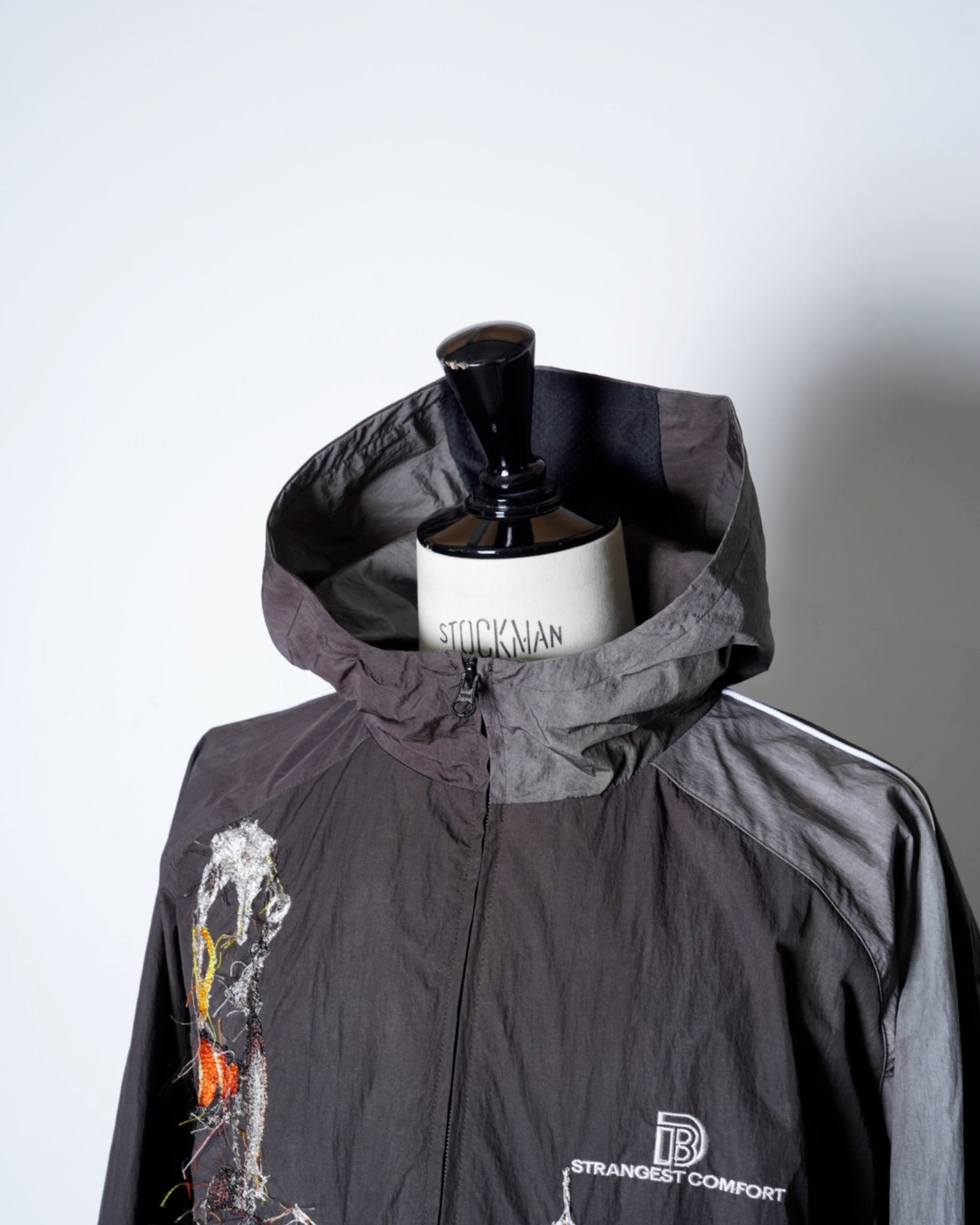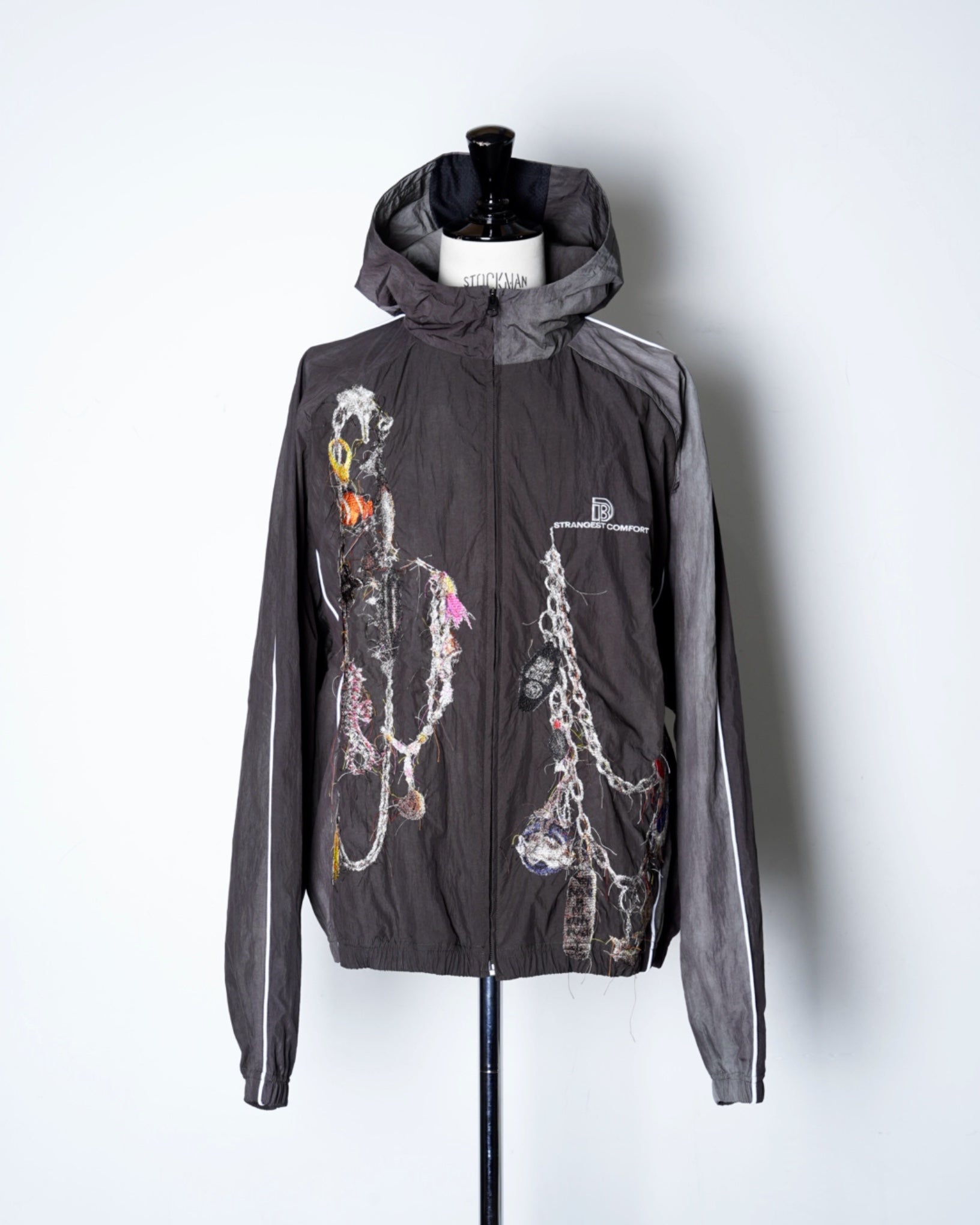 ・スプレーでムラ染め加工を施したナイロン生地に、魚やルアーをモチーフにしたチャーム付きのチェーンを、写真のようにリアルな刺繍で表現したトラックジャケット。フード一体型の軽やかなシルエットは、都会と自然の間を行き来するような佇まいです。