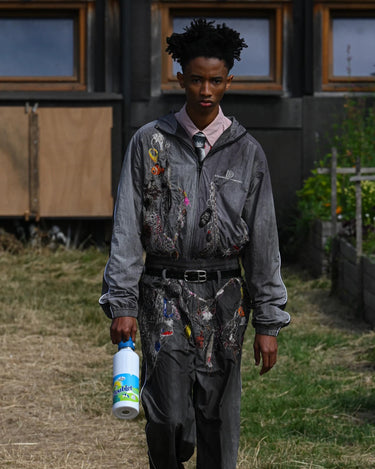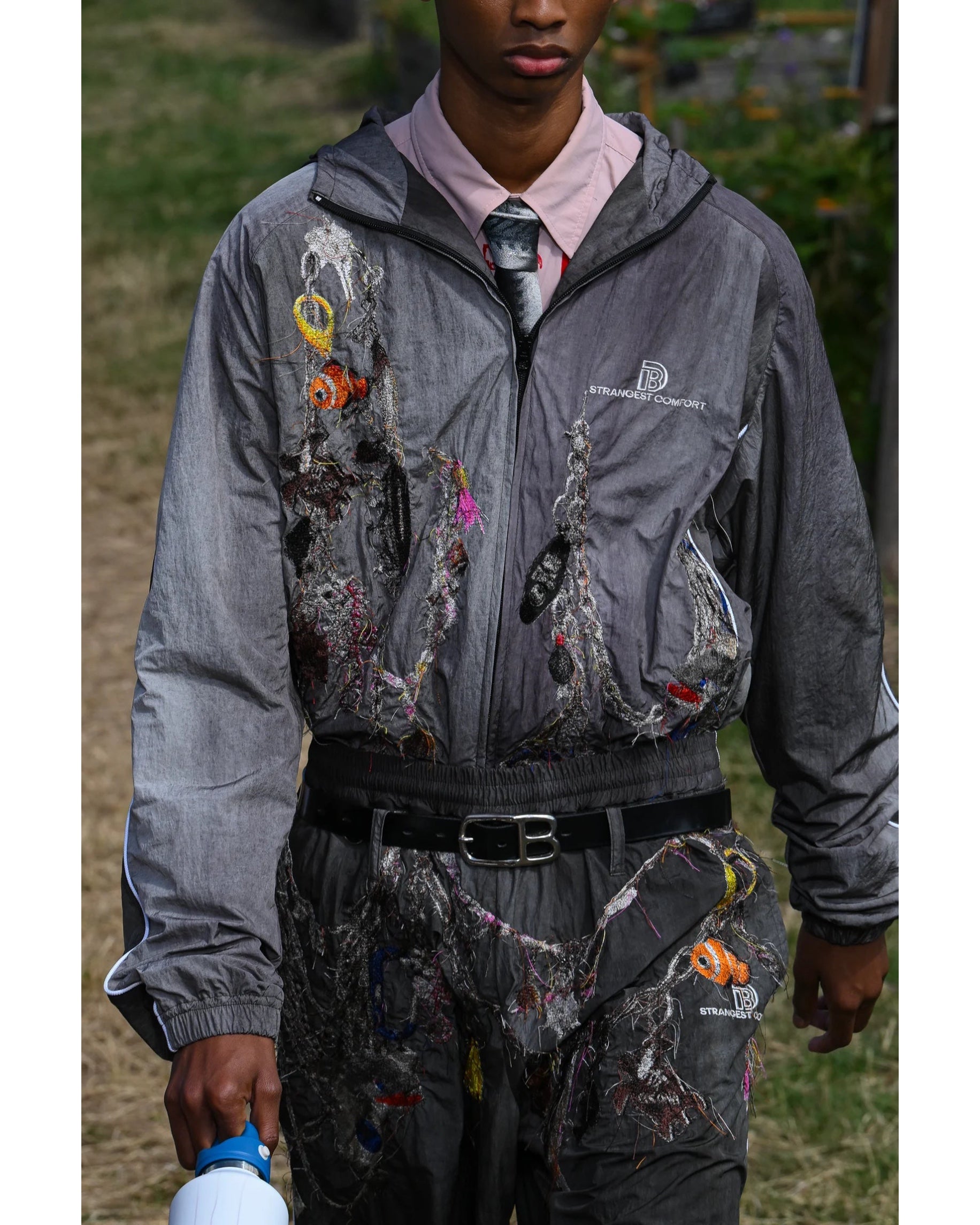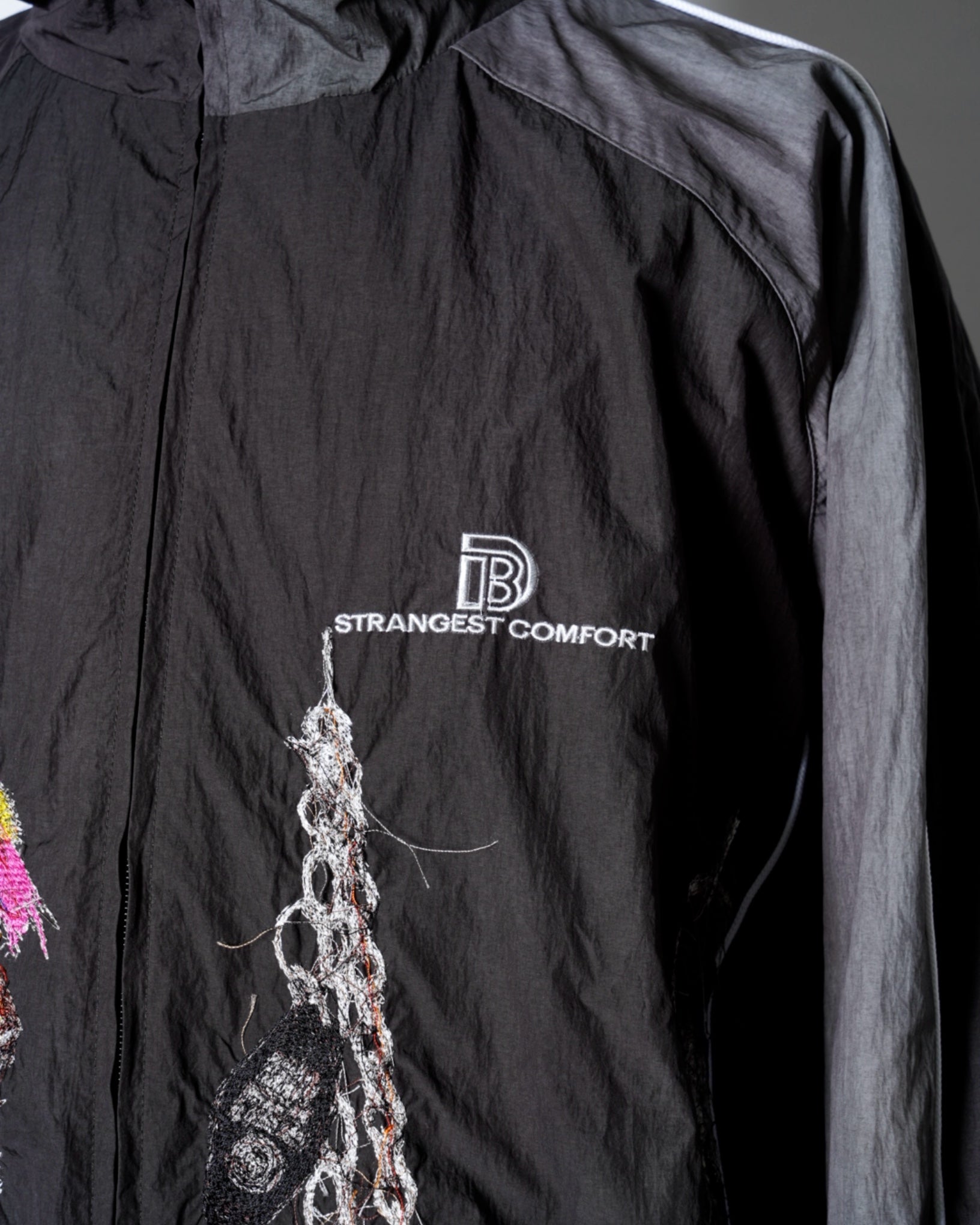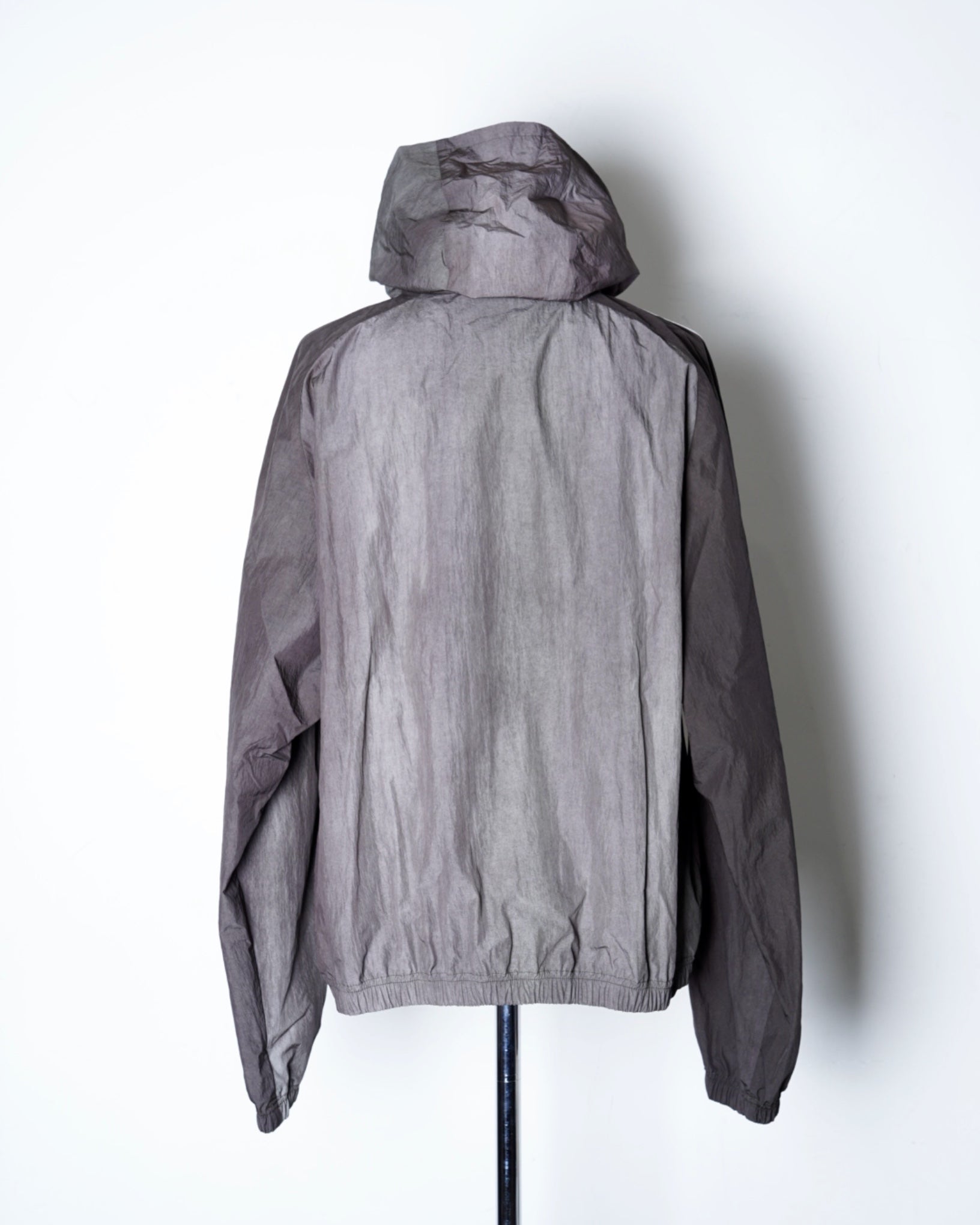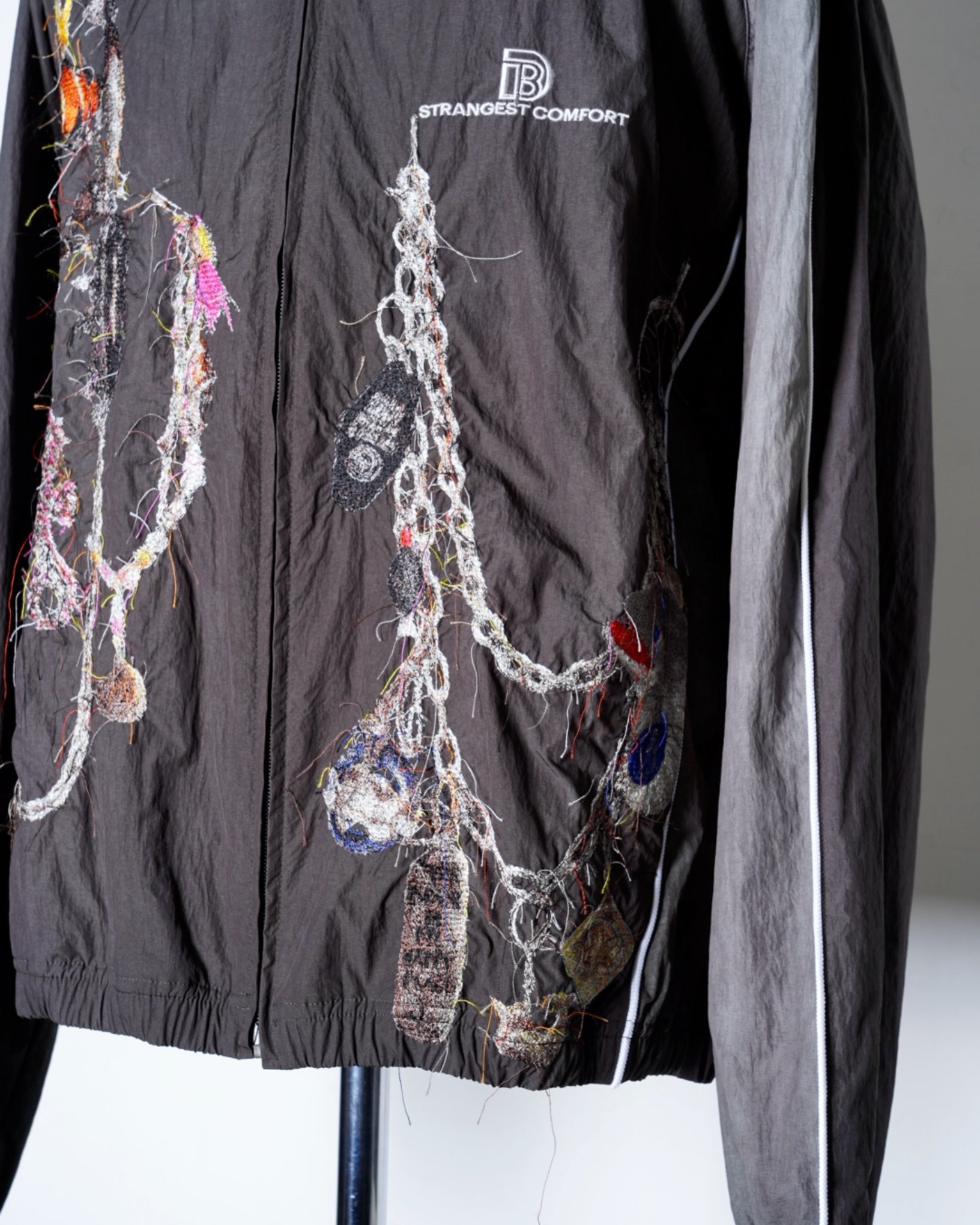・スプレーでムラ染め加工を施したナイロン生地に、魚やルアーをモチーフにしたチャーム付きのチェーンを、写真のようにリアルな刺繍で表現したトラックジャケット。フード一体型の軽やかなシルエットは、都会と自然の間を行き来するような佇まいです。