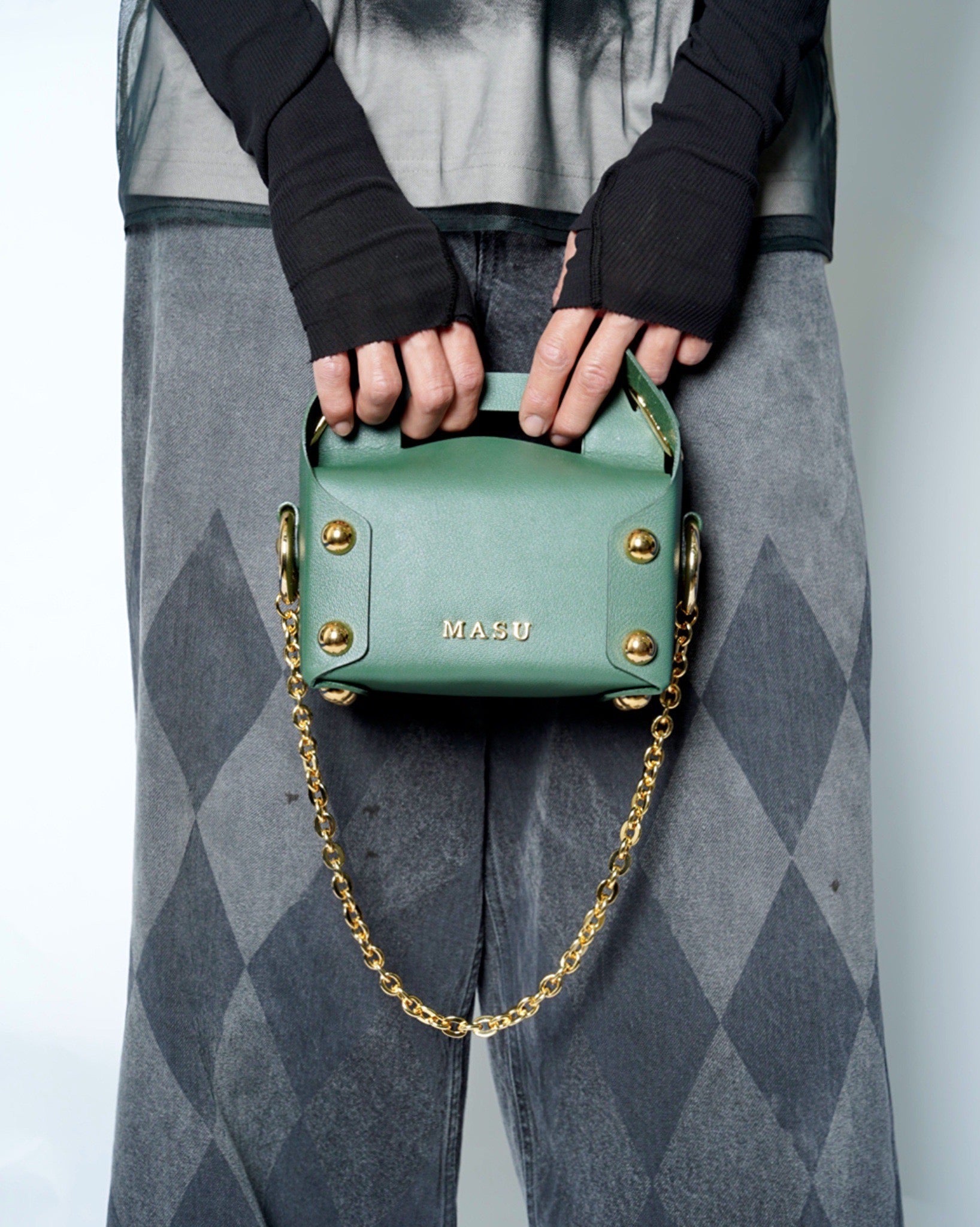 ツヤのある牛革を使用し、縫製は一切入れず丸型の鋲の打ち込みのみで形作られ、ゴールドのチェーンが実用性と共に魅力を際立たせた。