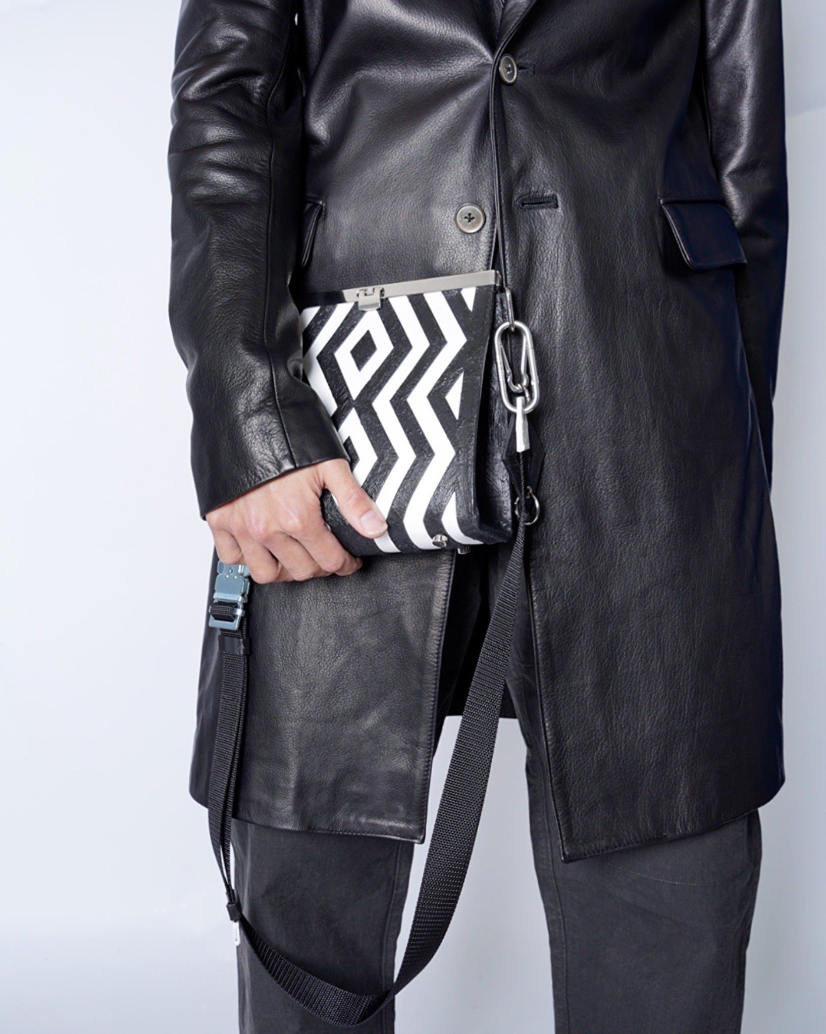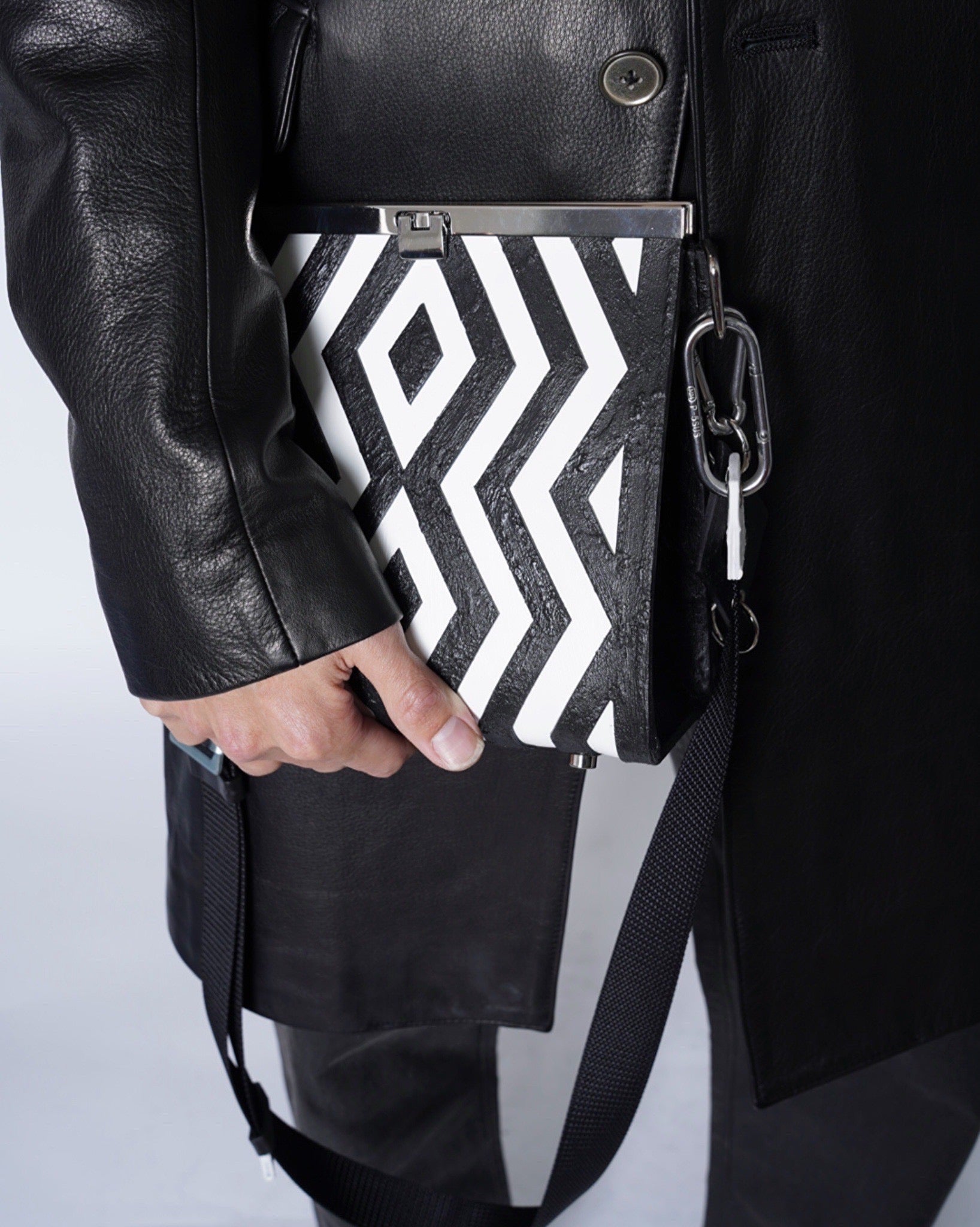 閂(かんぬき)をイメージした金具を用いたショルダーバッグ。