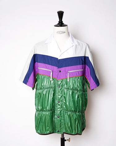 ・オープンカラーシャツをベースに、3層に素材や色を切り替えた、エッジの効いたデザイン。