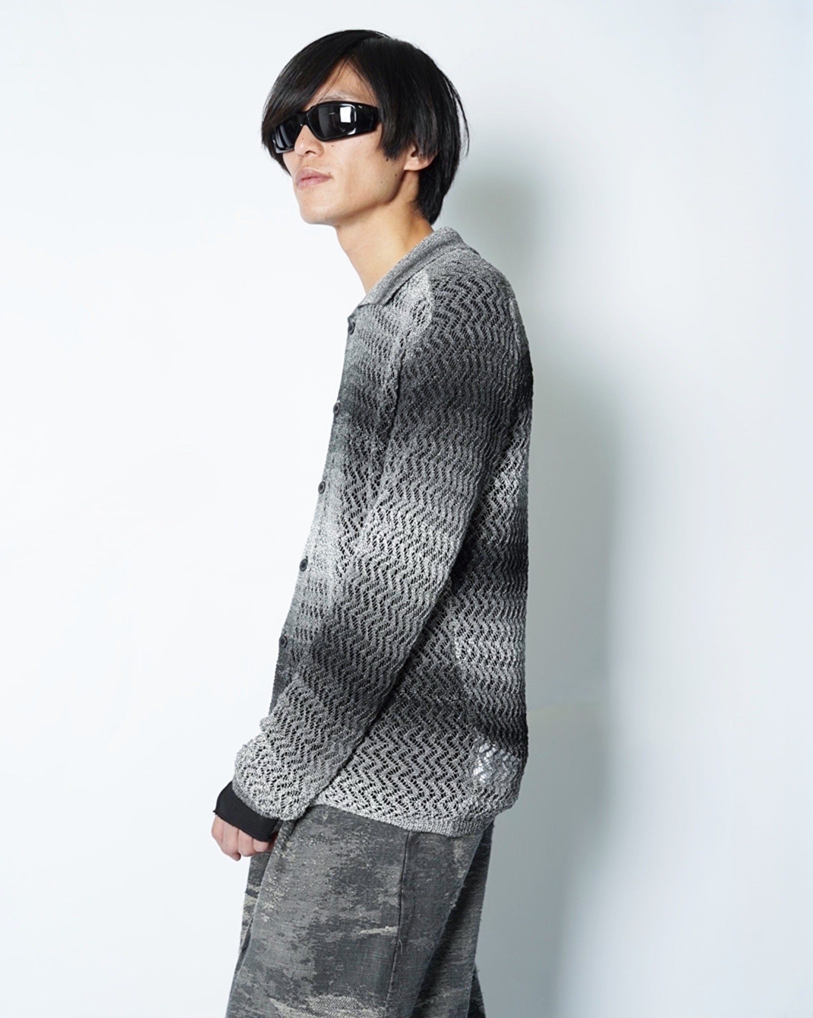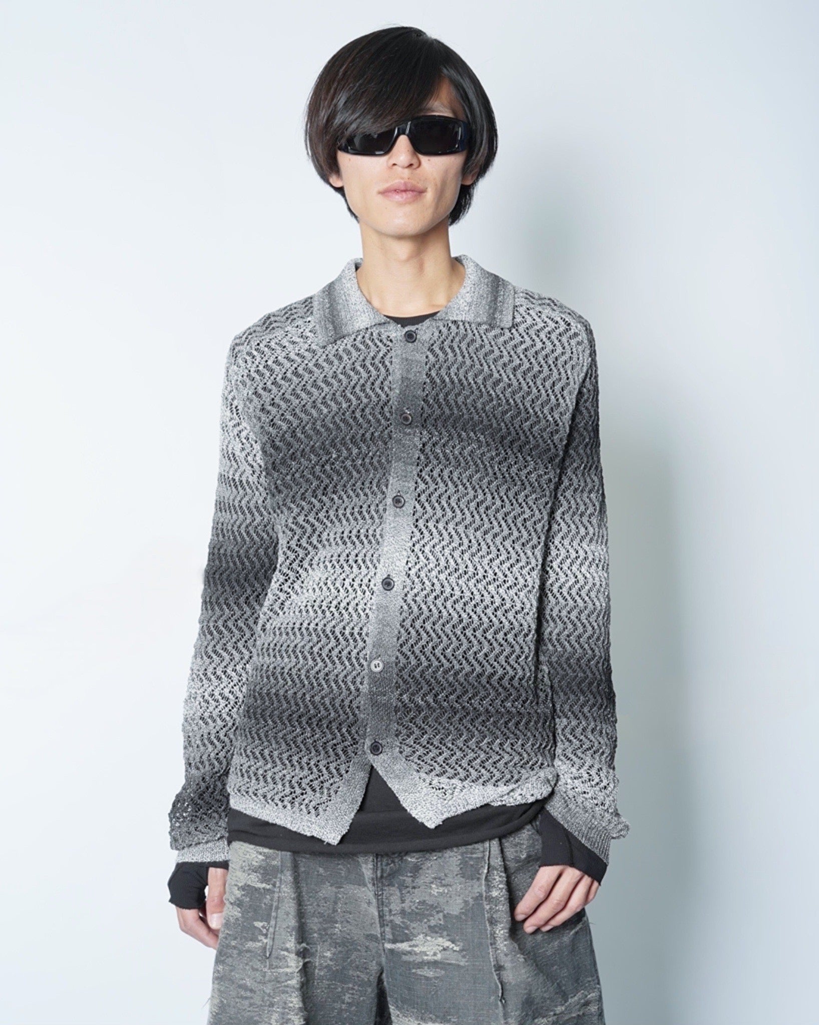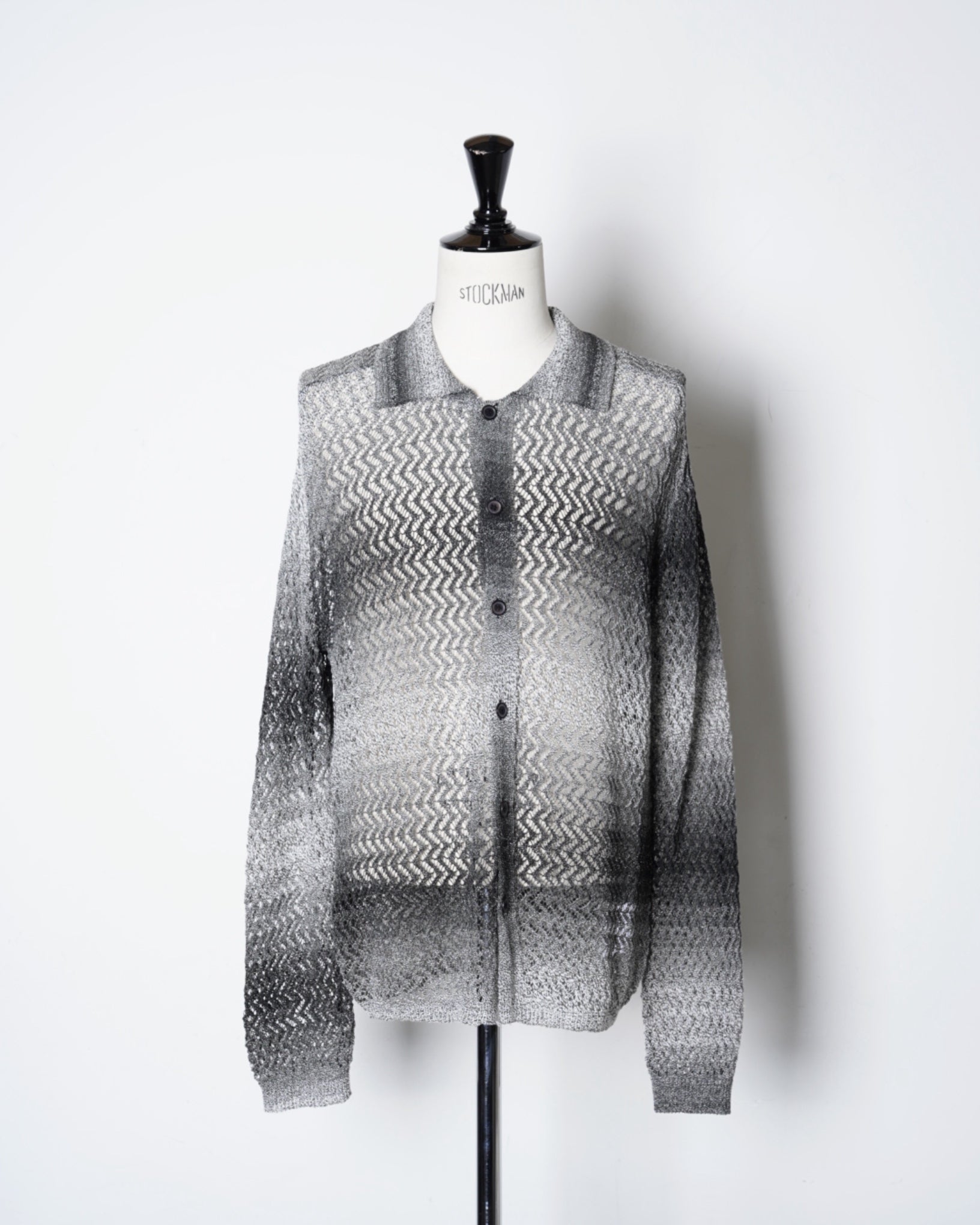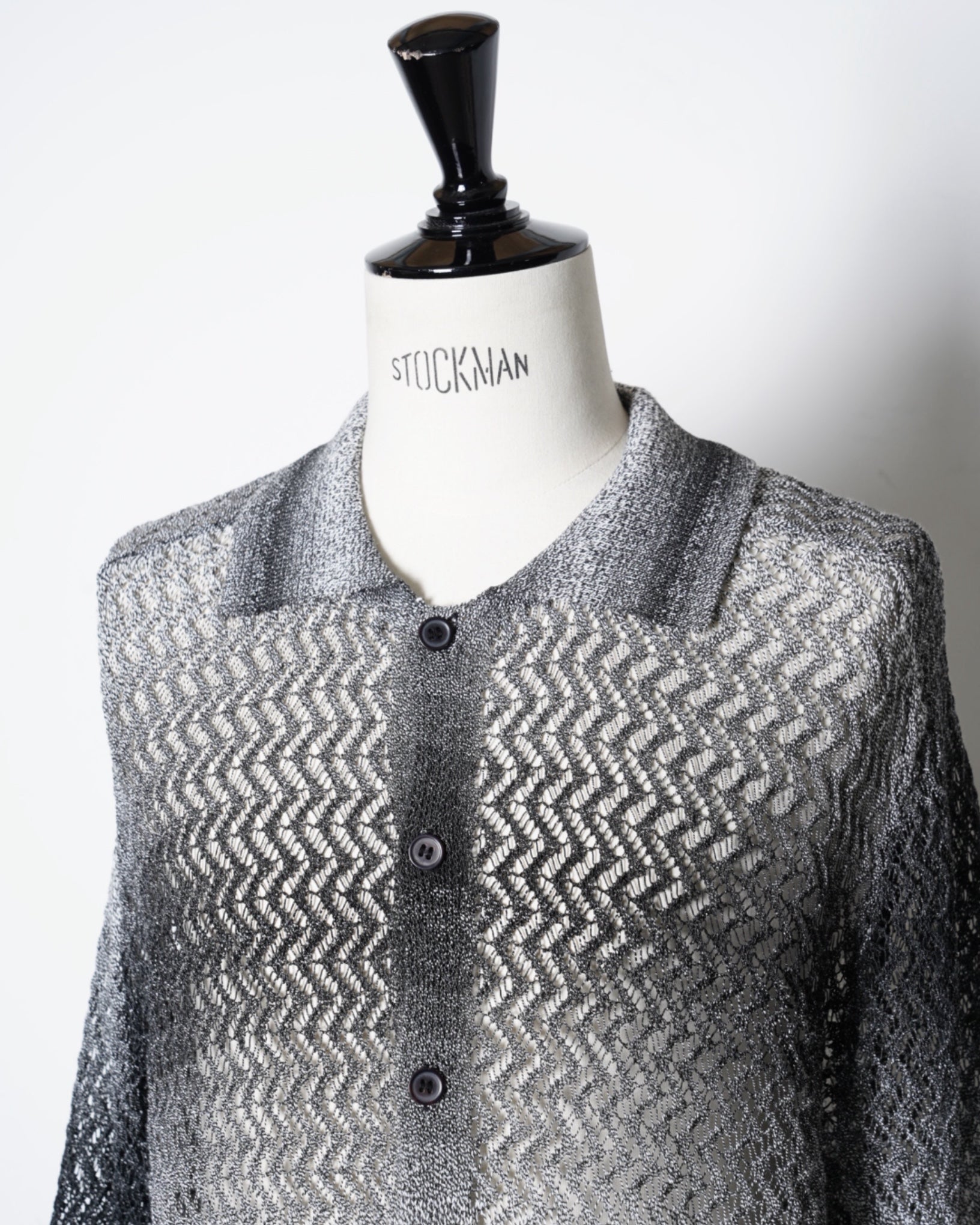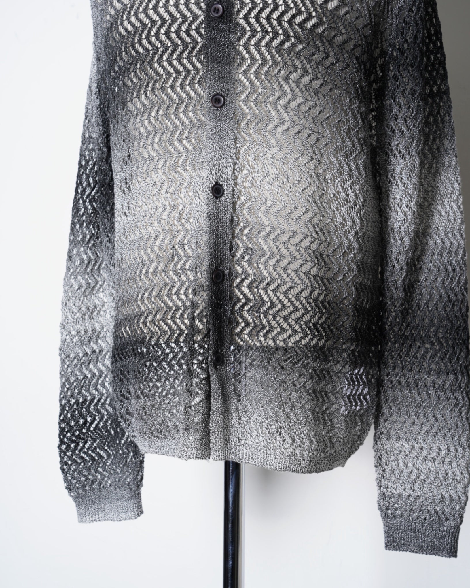 ・細かな透け感のあるメッシュ編みに、色の濃淡が揺らぐような繊細なグラデーションをのせたニットトップ。
