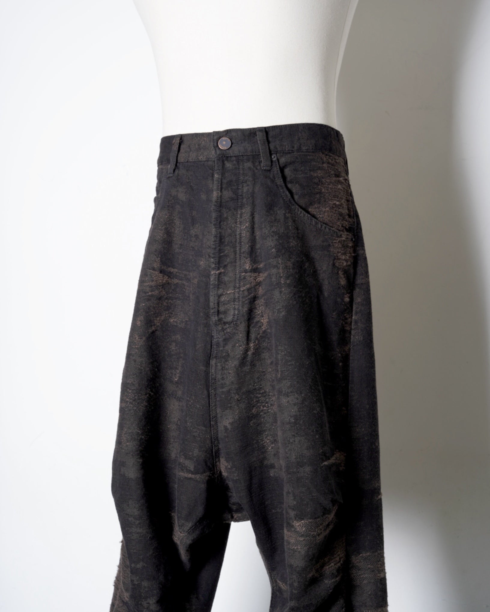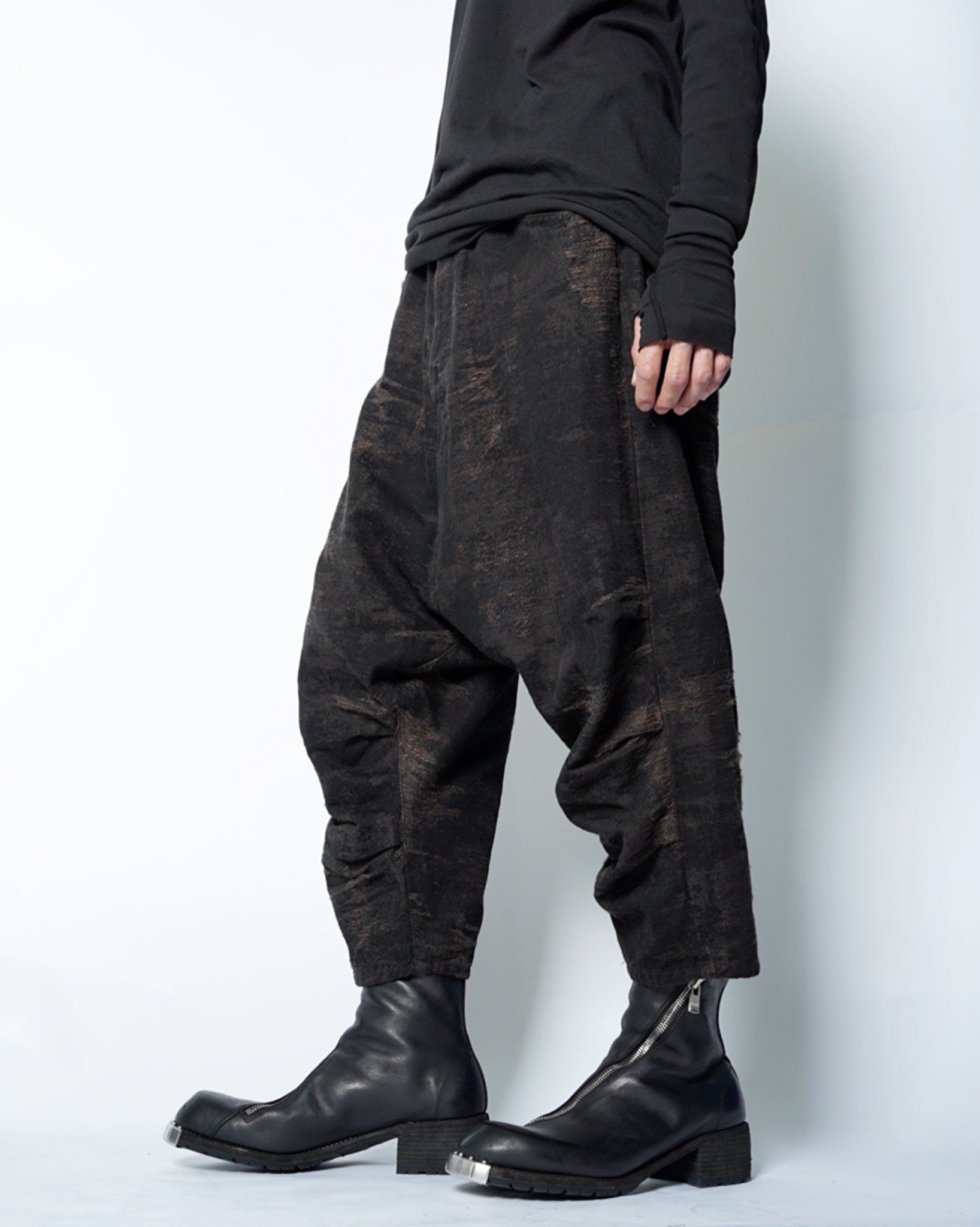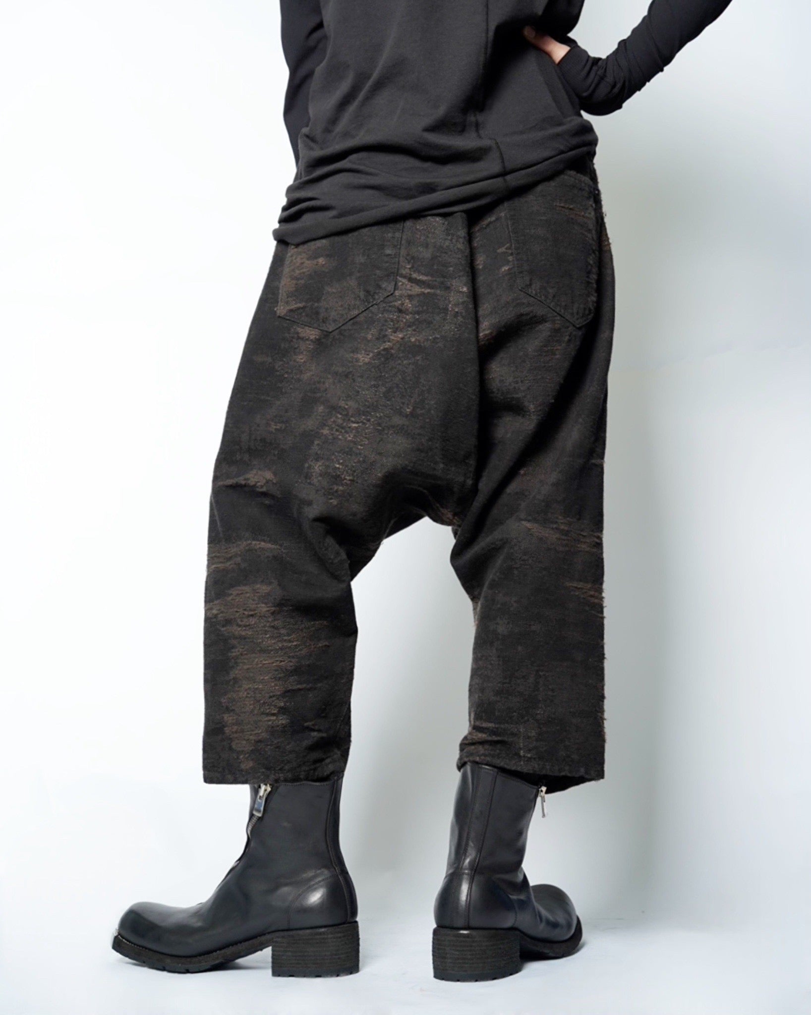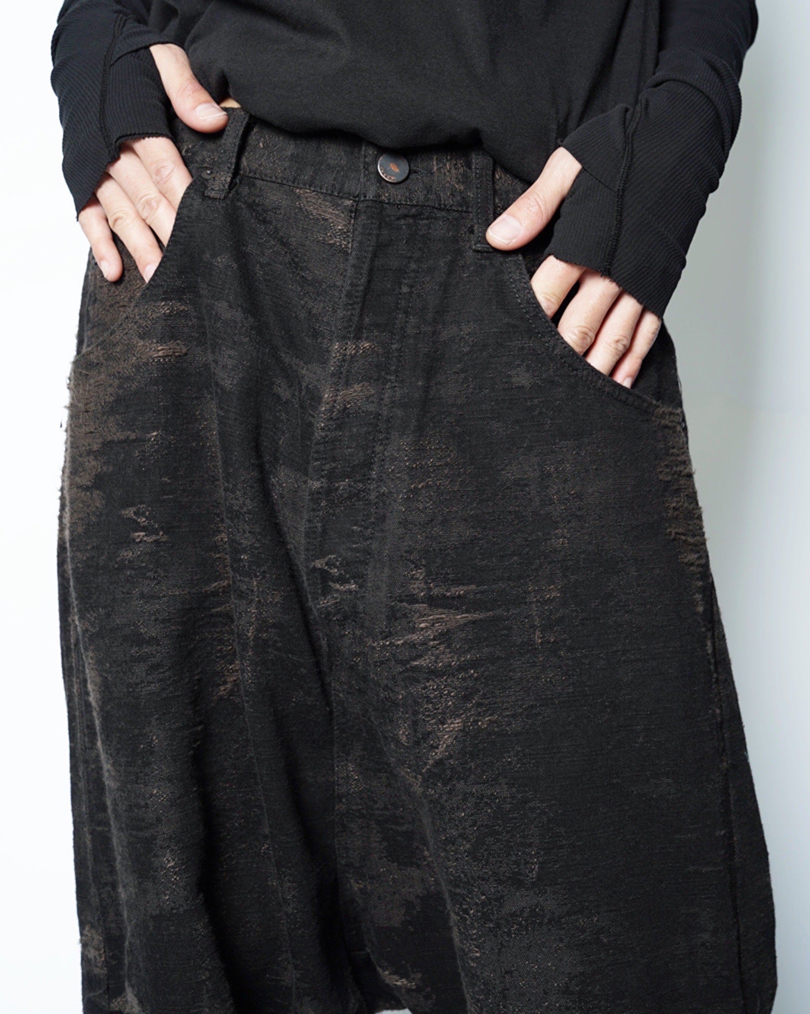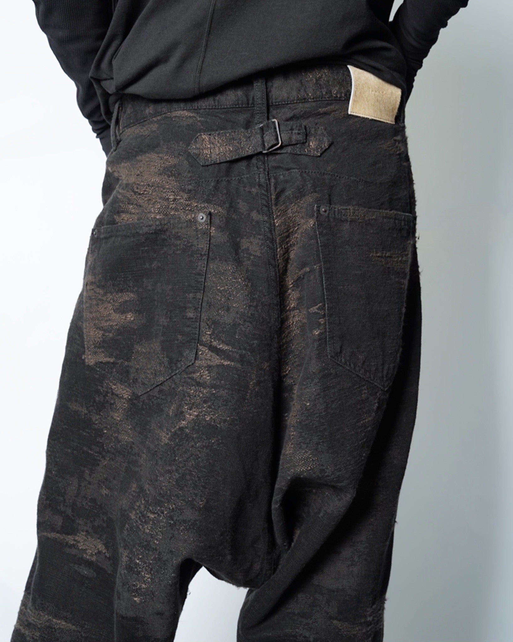 ・どこか緊張感のあるストリート感を放つサルエルパンツをハードなジャカードデニムで表現することで、ストイックな仕上がりの一本となっています。