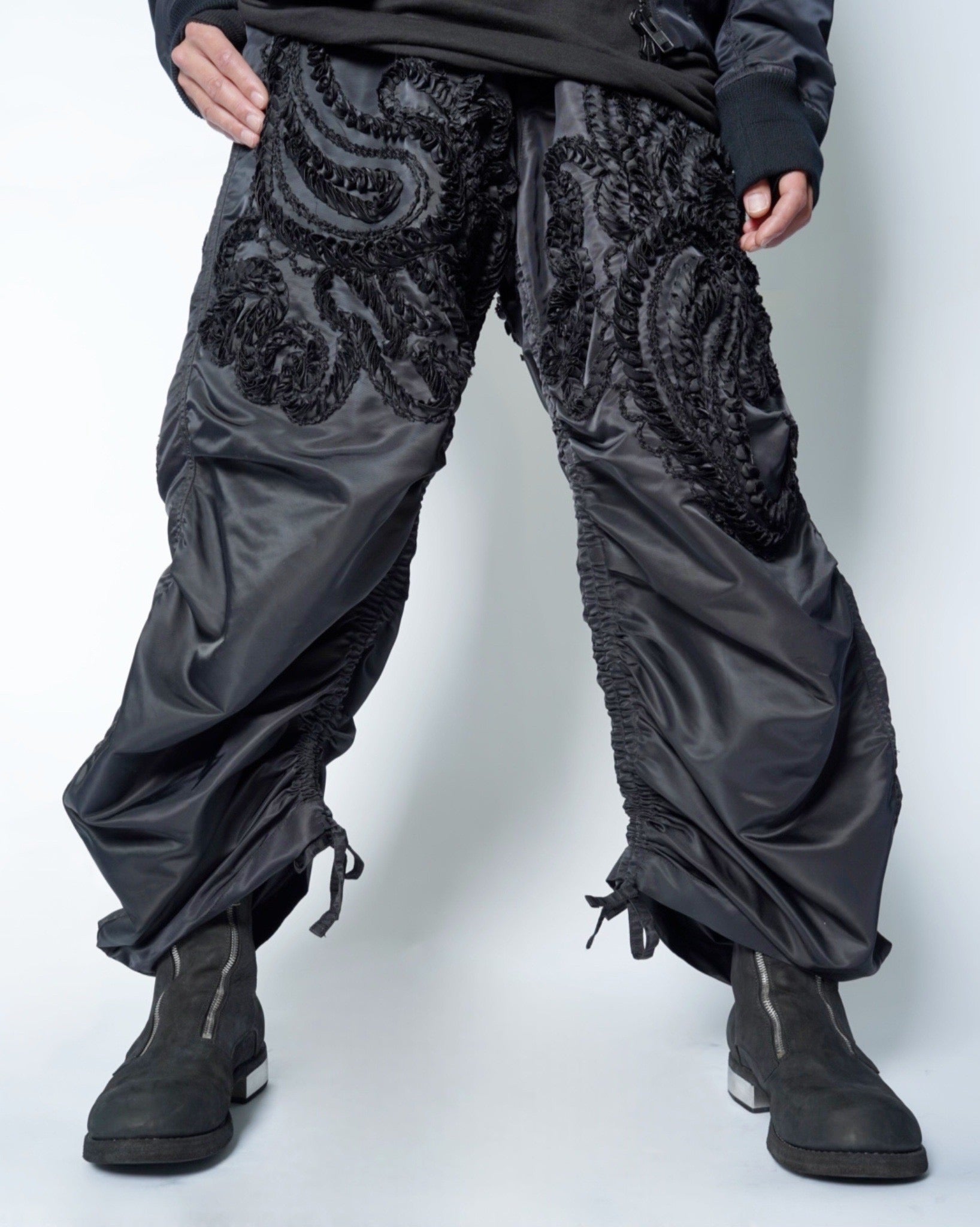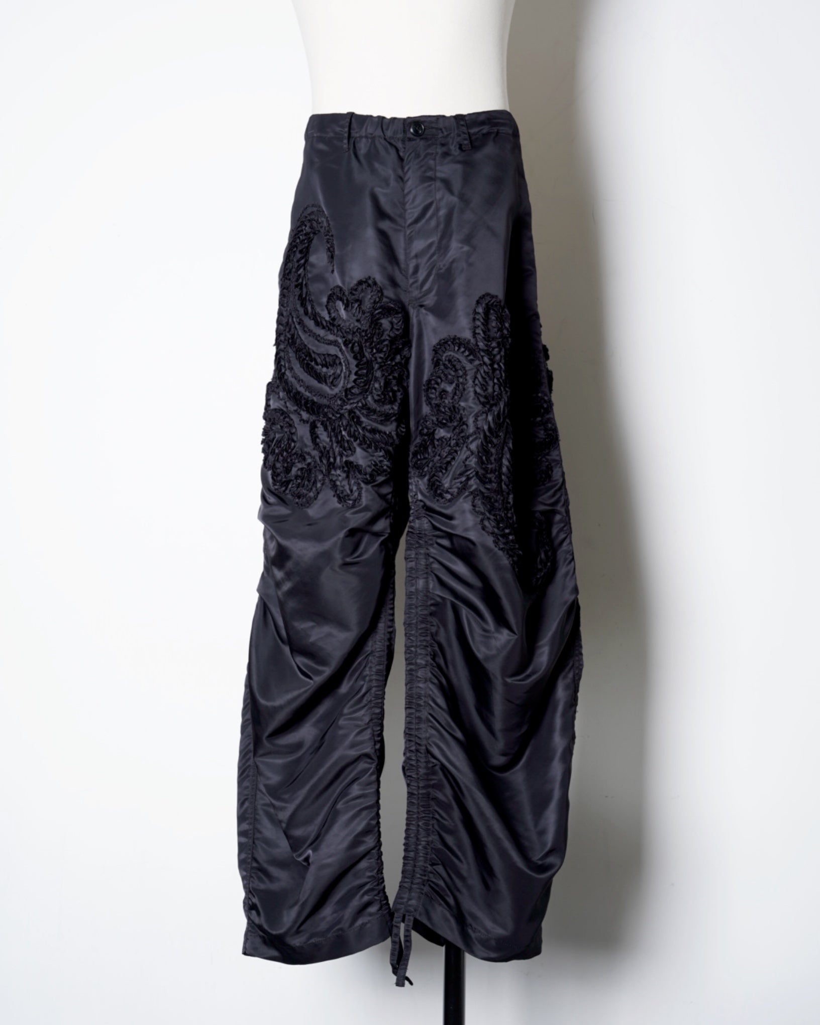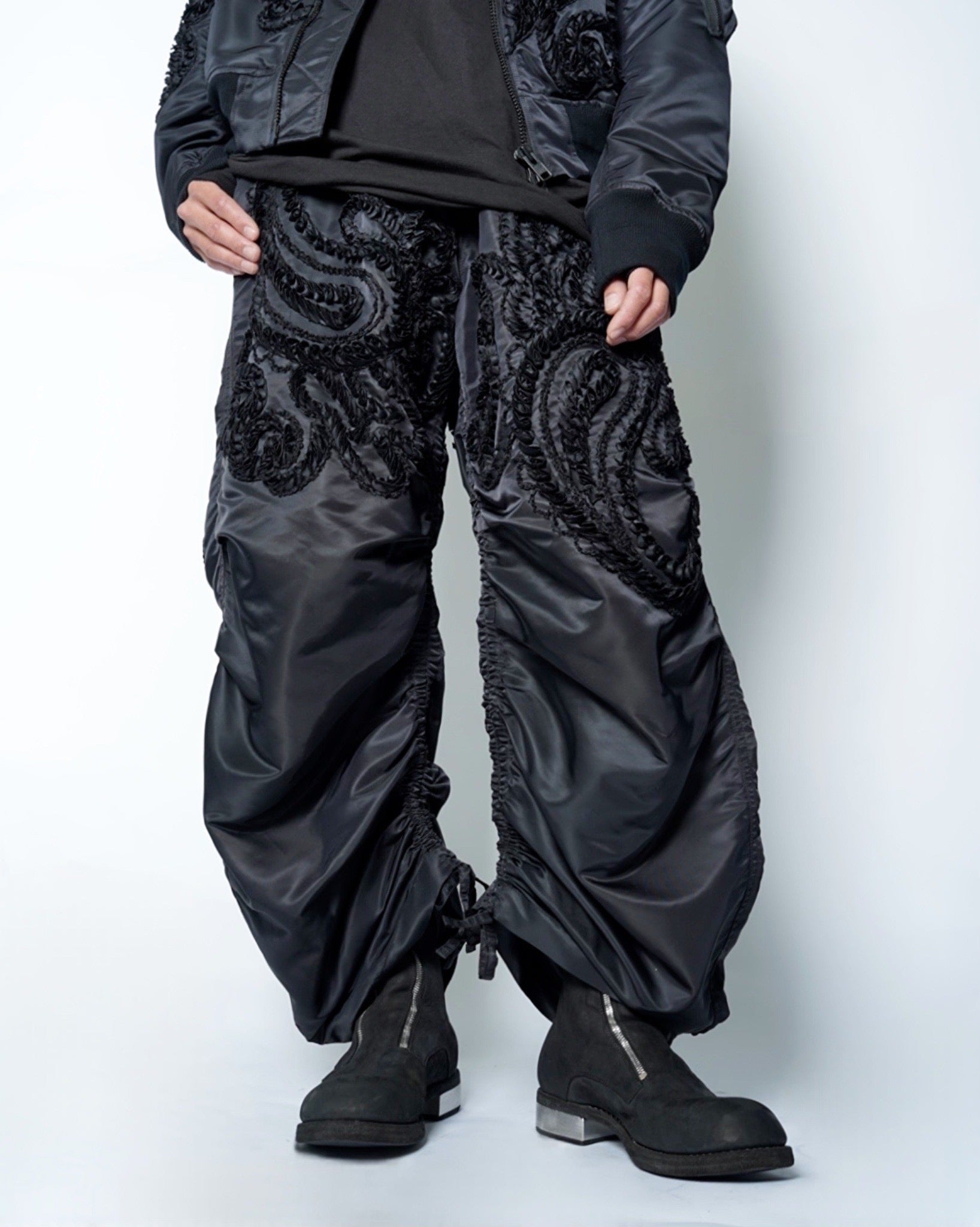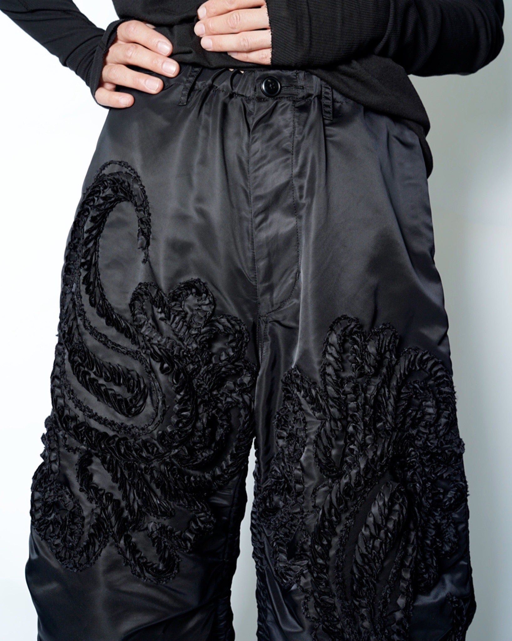 ・このパラシュートパンツには、立体的で彫刻的な刺繍を施しています。