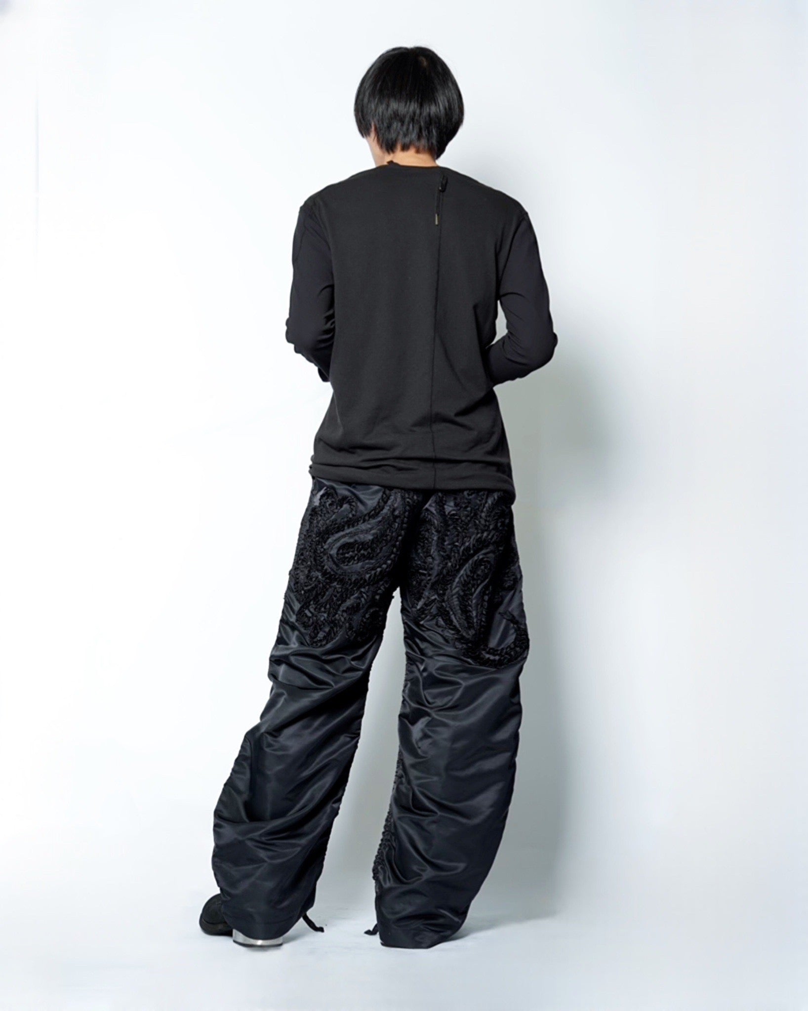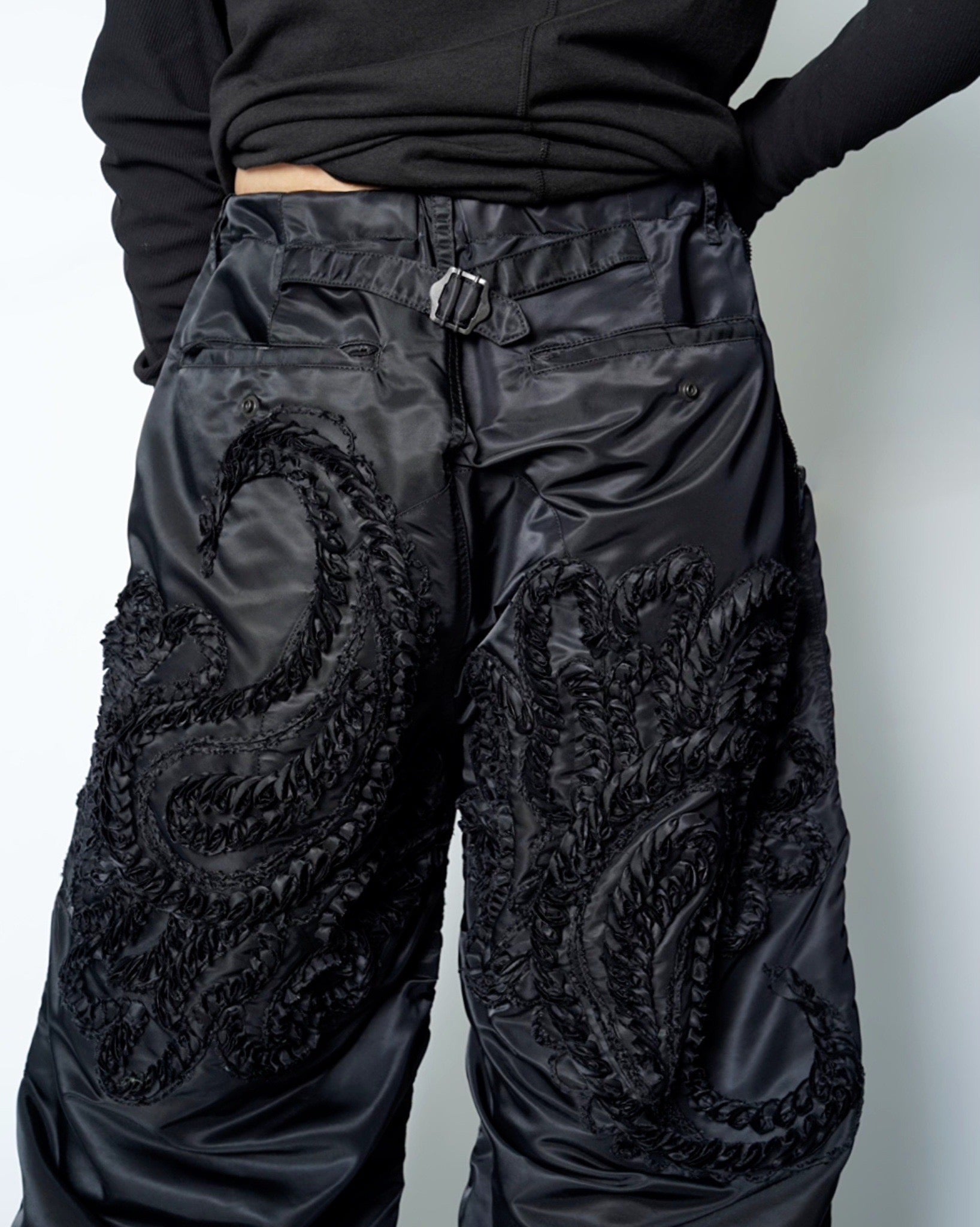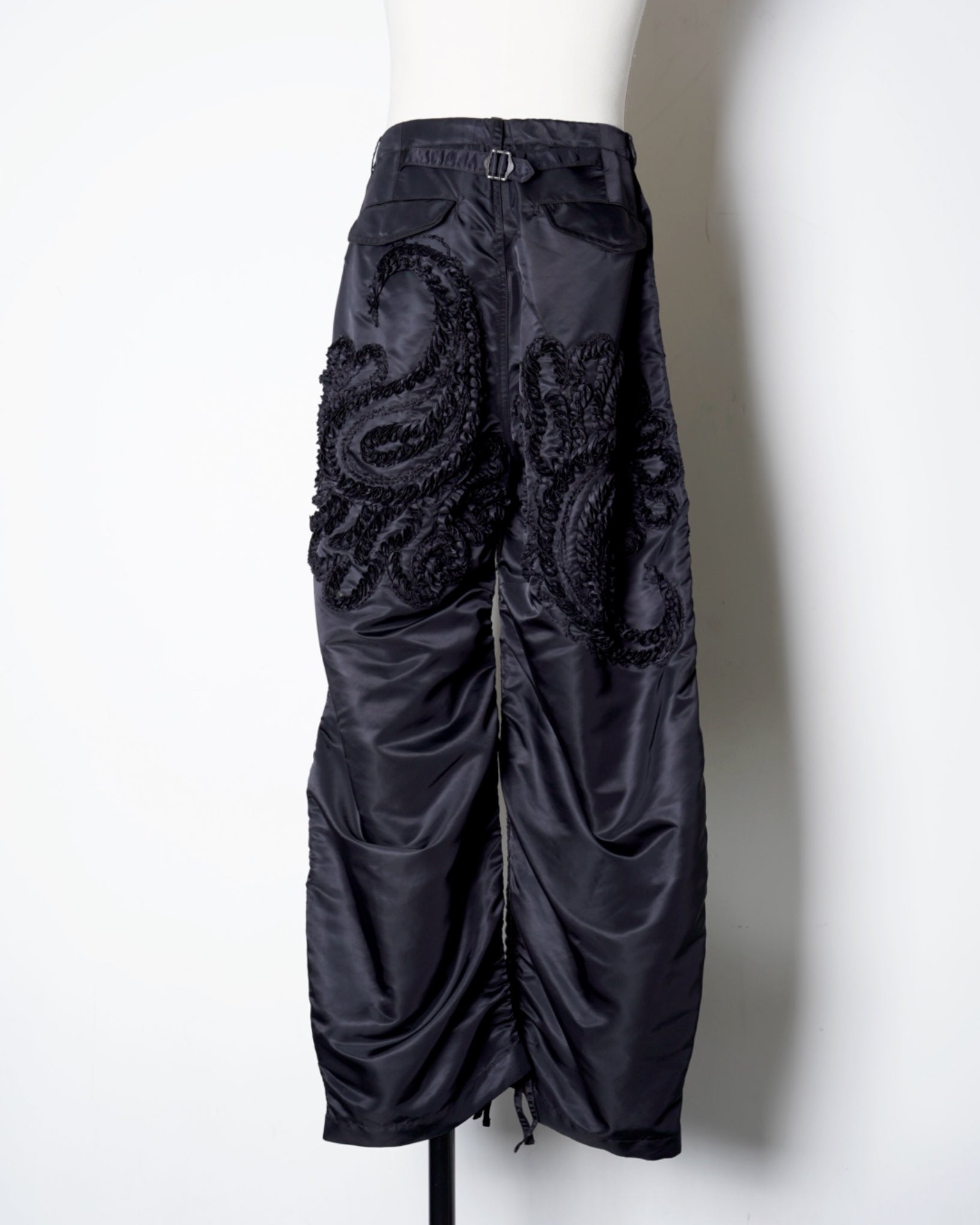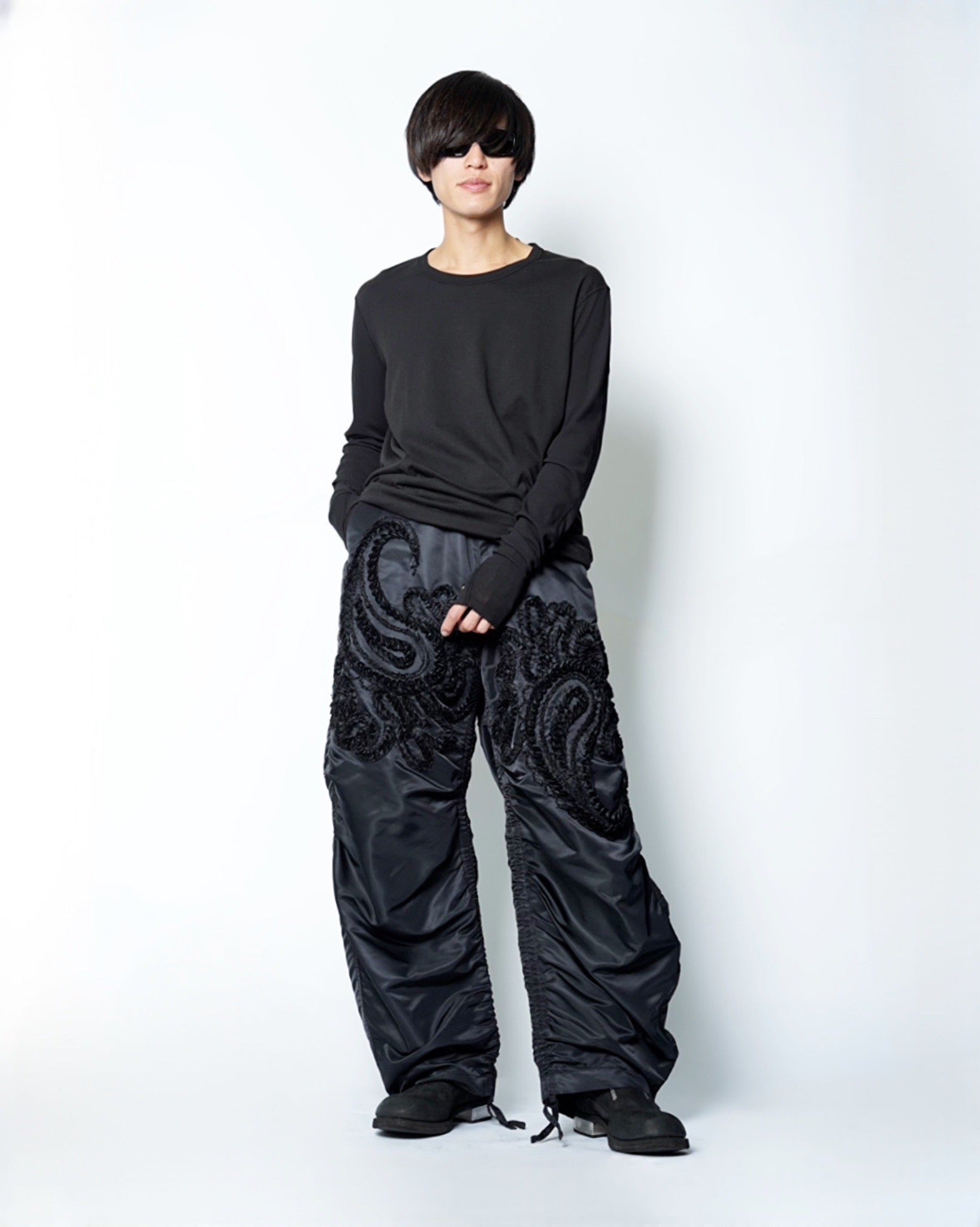 ・このパラシュートパンツには、立体的で彫刻的な刺繍を施しています。